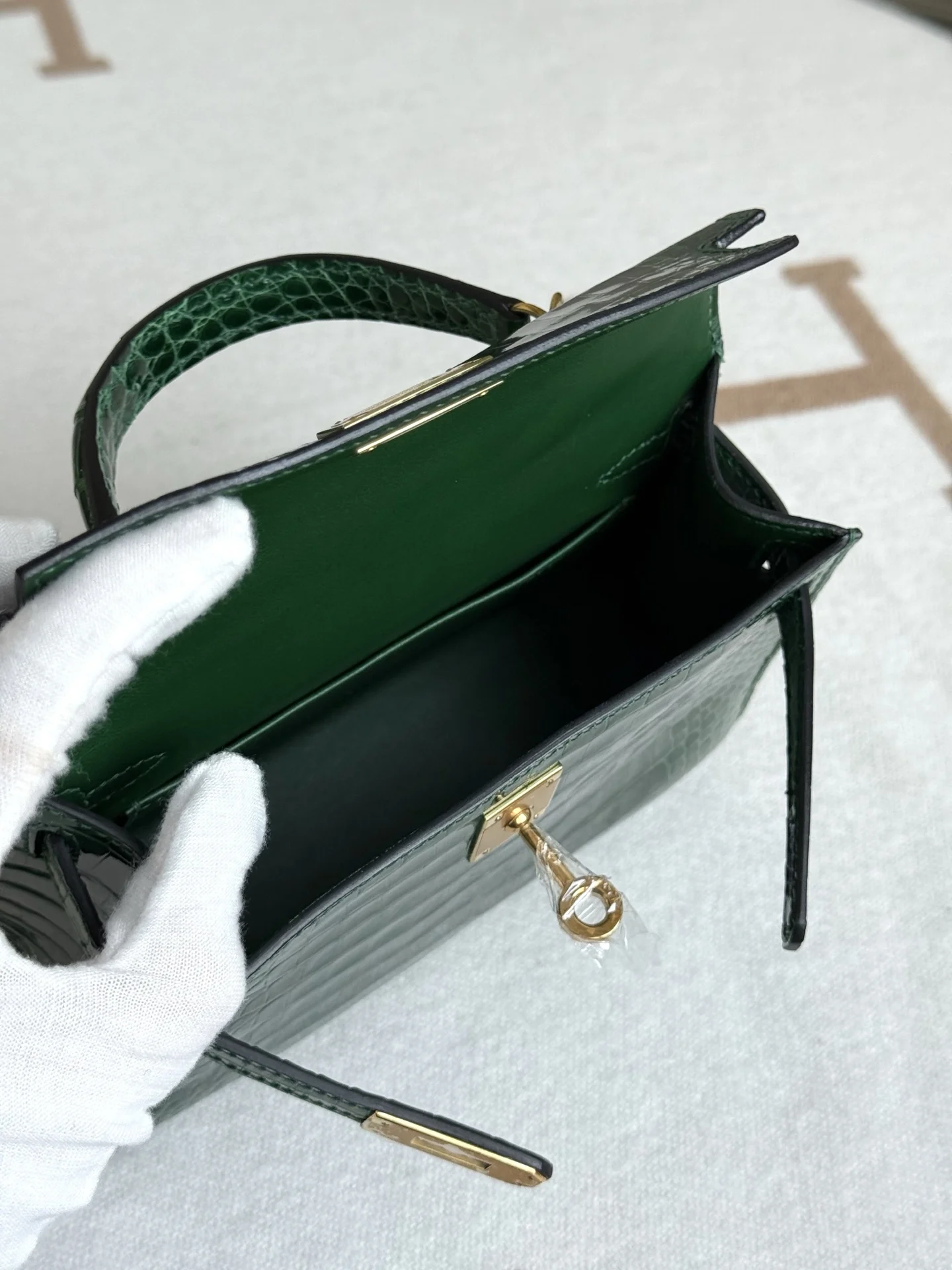 Authentic-grade replica Kelly II 19cm in American Alligator, crafted with imported glossy square-scale American alligator leather, hand-hammered hardware, emerald green, and hand-s..
