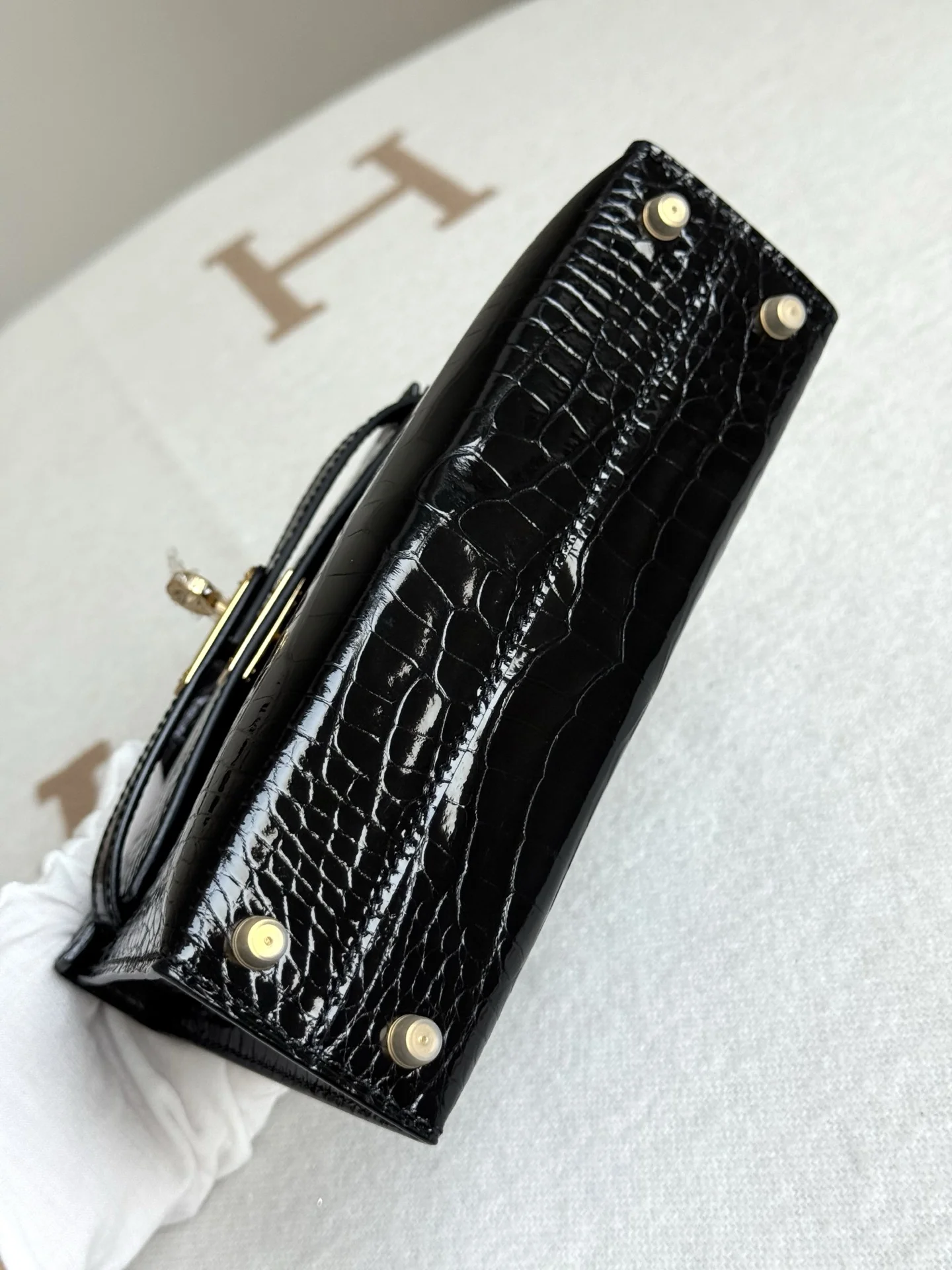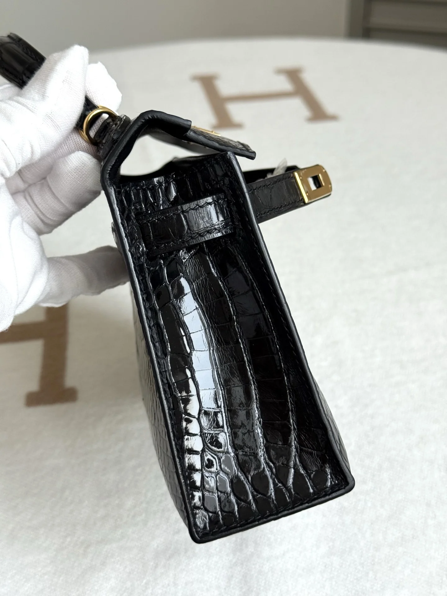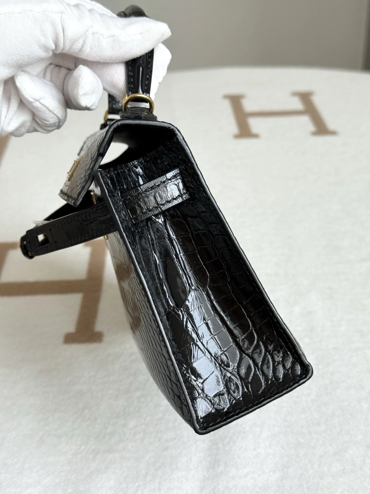 Authentic replica of the boutique s American alligator Kelly II 19cm bag, crafted from imported glossy square-scale American alligator leather, hand-hammered hardware, black color, and hand-stitched beeswax thread.
