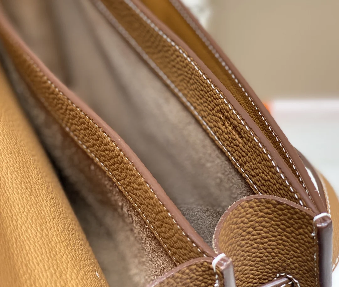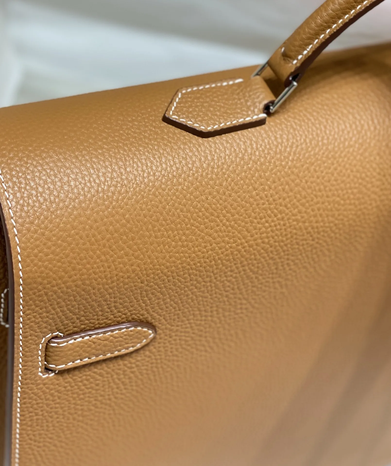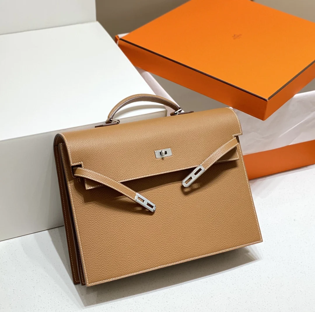 The only semi-handmade Kelly series men s bag . Bearing the hallmark Kelly family lineage, this design features a structured, square, two-compartment layout. The handle is meticulously polished before the edges are oiled, providing a smooth and comfortable grip -- Available in 38cm Gold Brown.