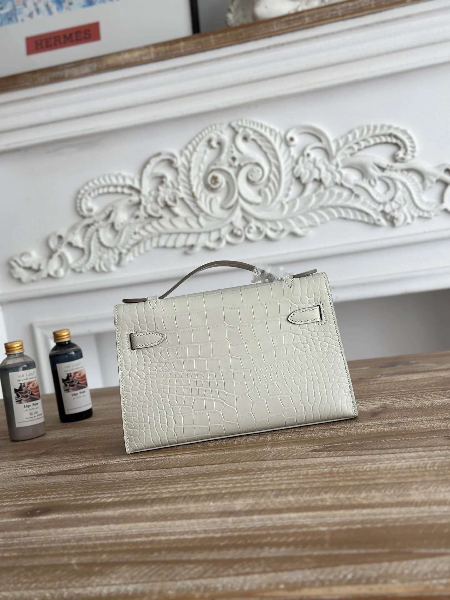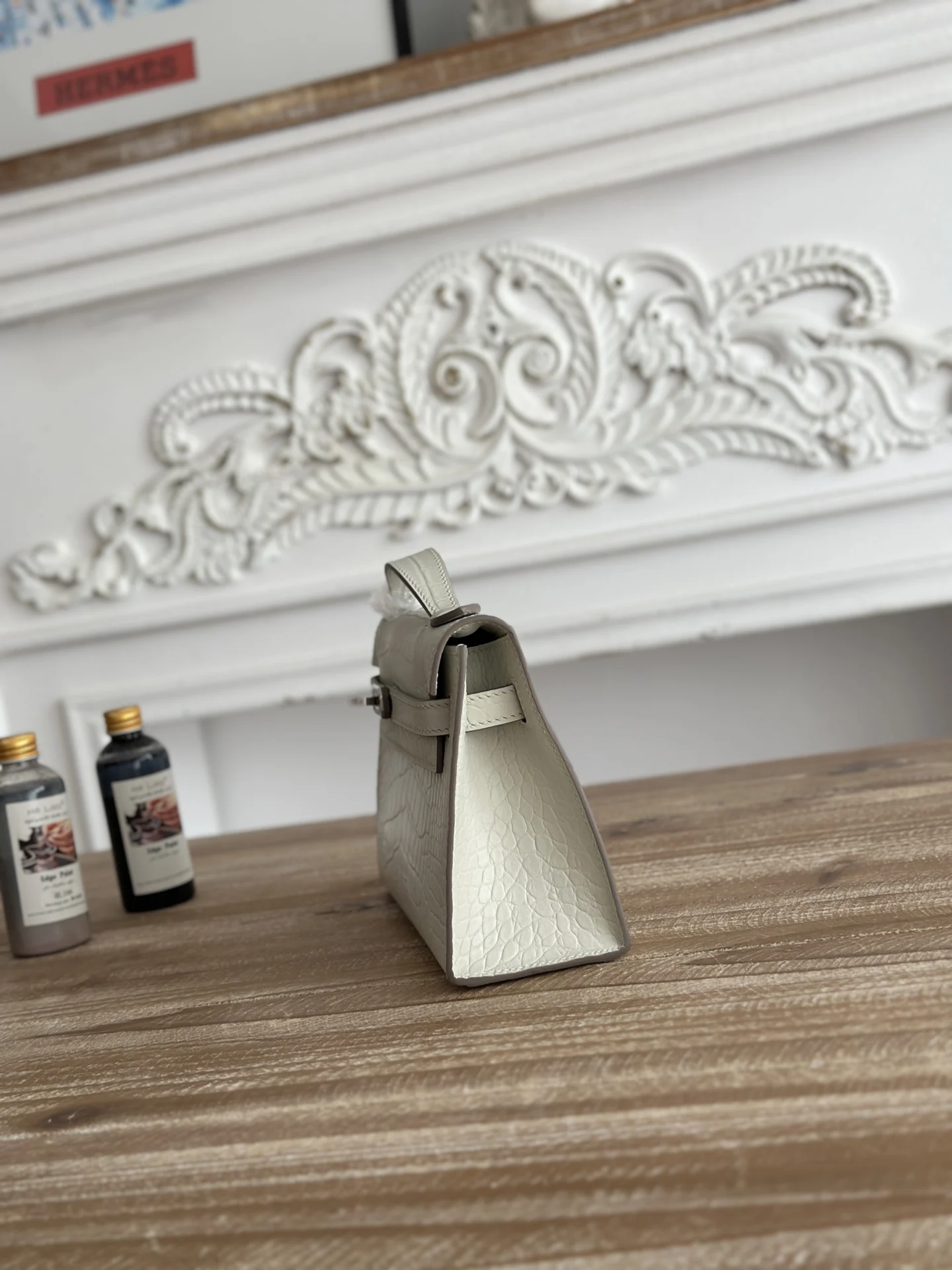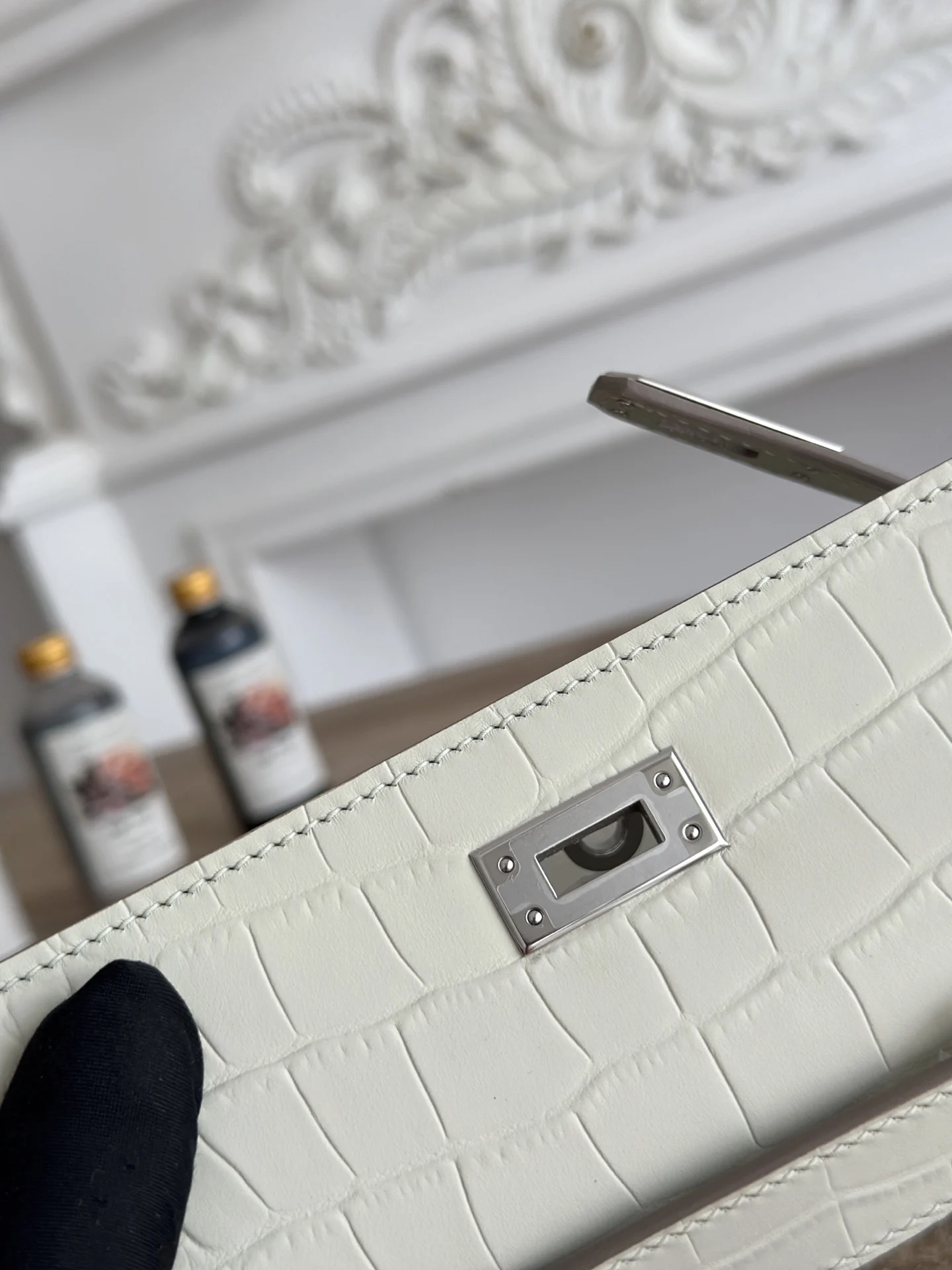 Ready Stock, Semi-handmade, Commonly known as Kelly Mini 1st Generation Handbag, Hermes Kelly Mini Crocodile-Embossed Cowhide, Semi-handmade, Waxed Thread Stitching. Color: Milkshake White, Silver Hardware. Size: 22cm