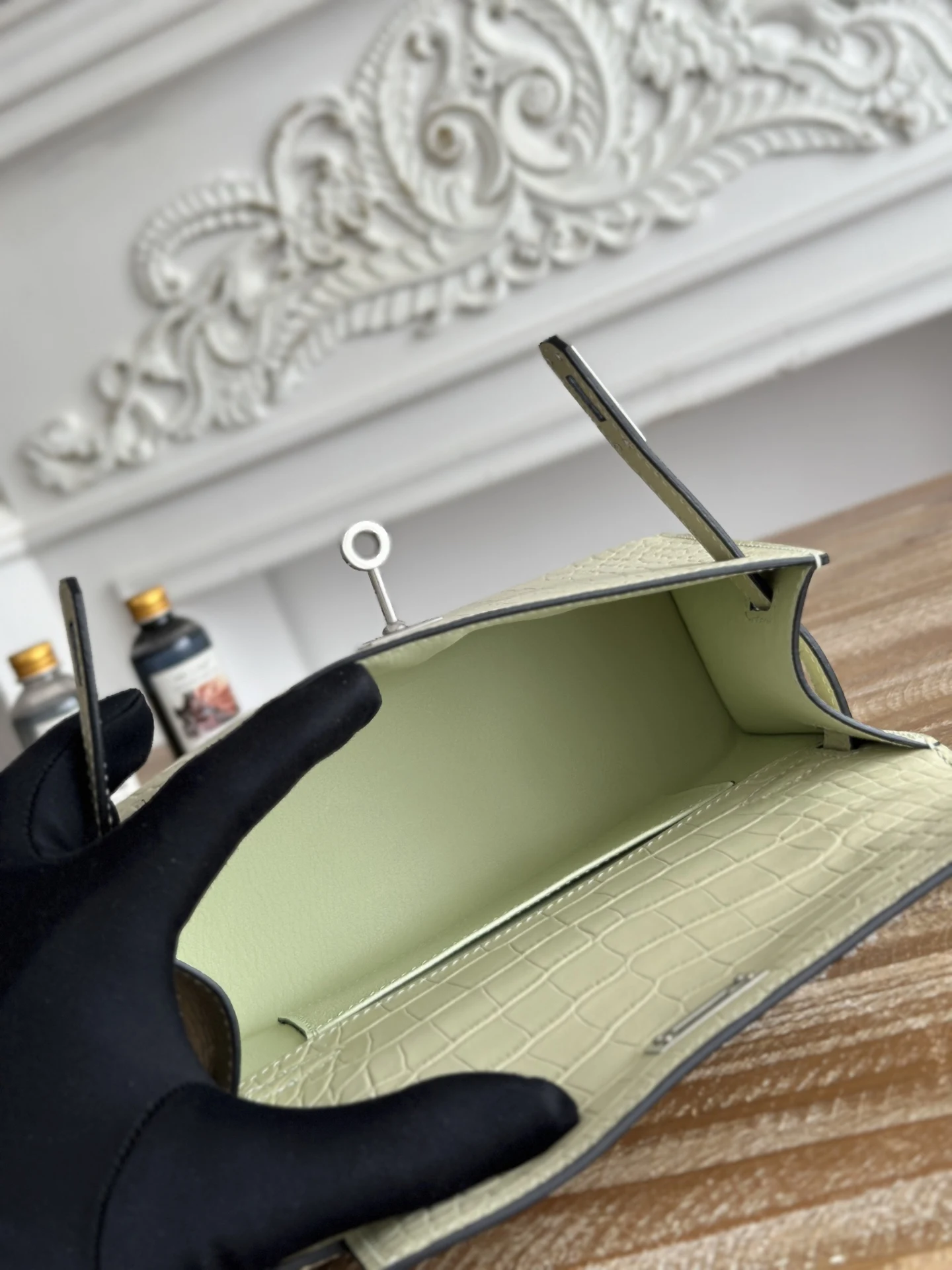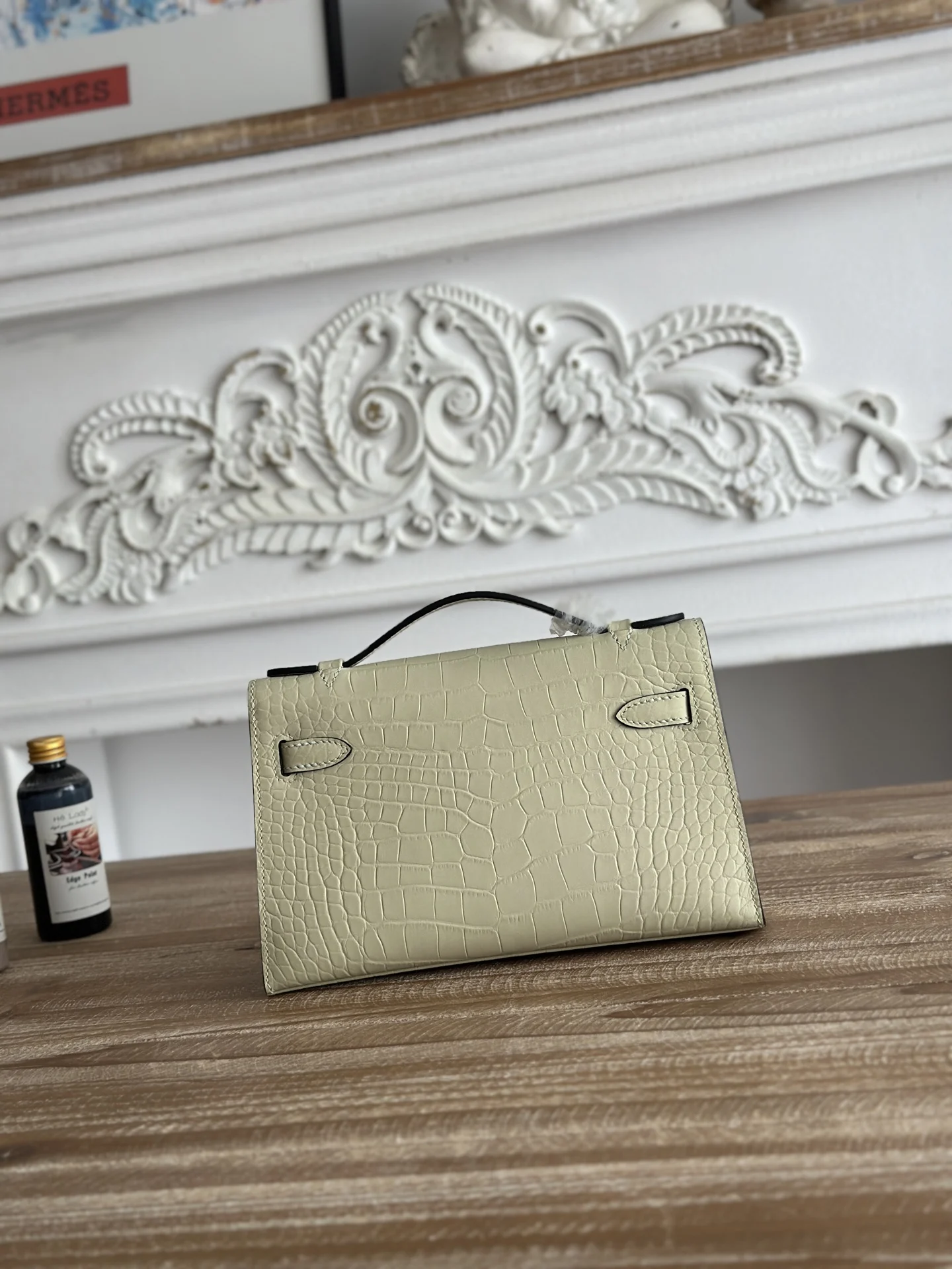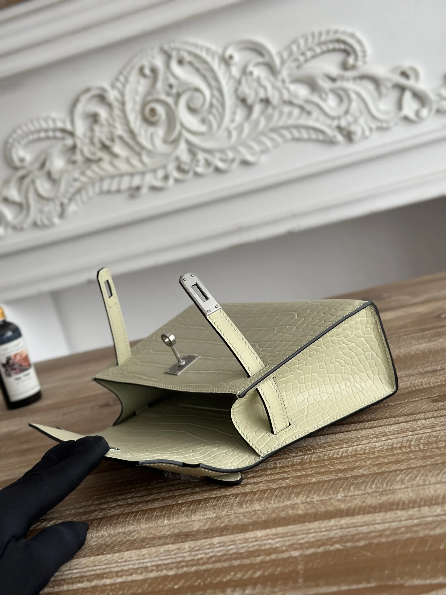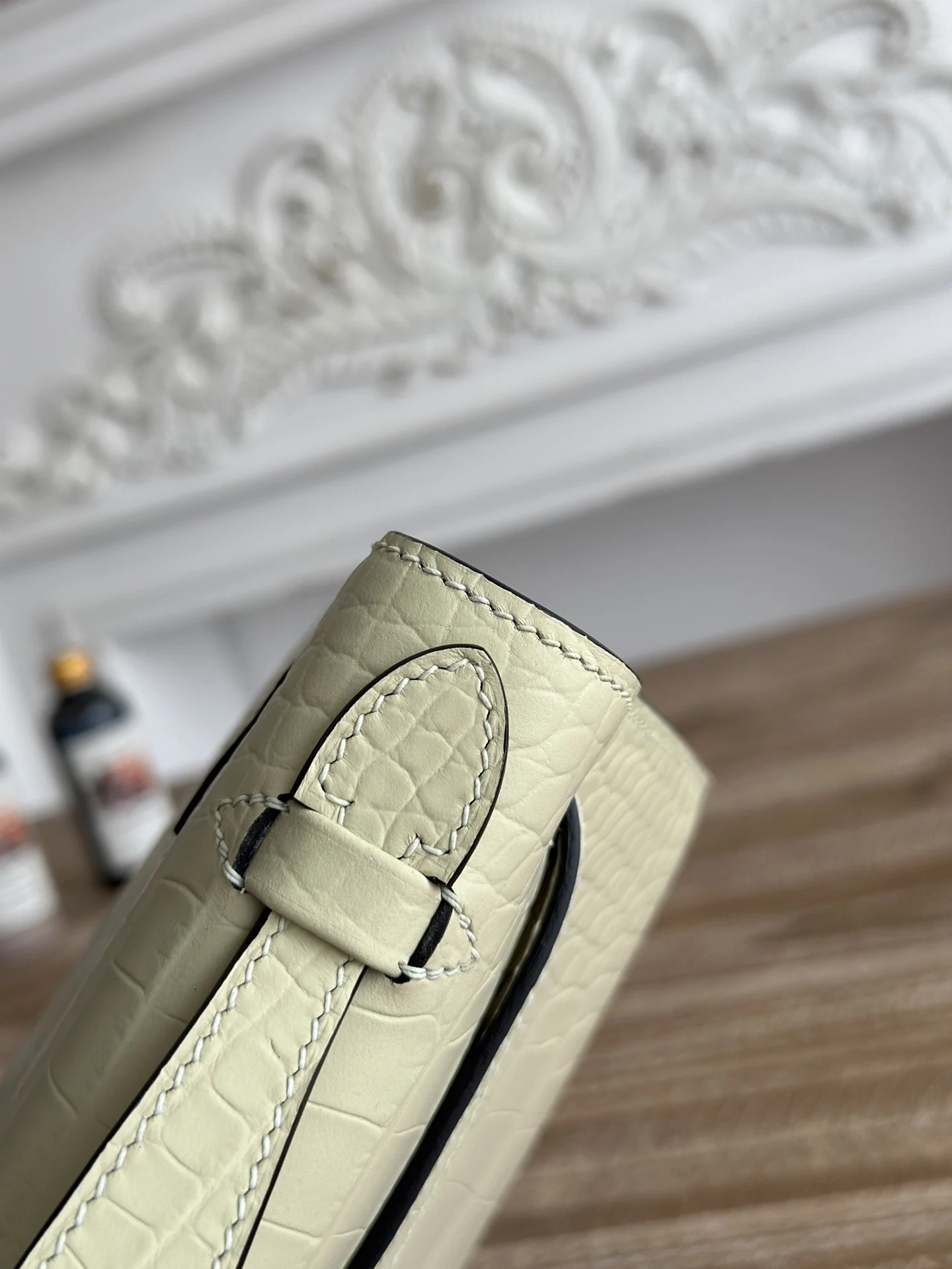 Ready Stock, Semi-handmade, Commonly known as Kelly Mini 1st Generation Handbag Hermes Kelly Mini Crocodile-Embossed Cowhide, Semi-handmade, Waxed Thread StitchingColor: Vanilla, Silver HardwareSize: 22cm