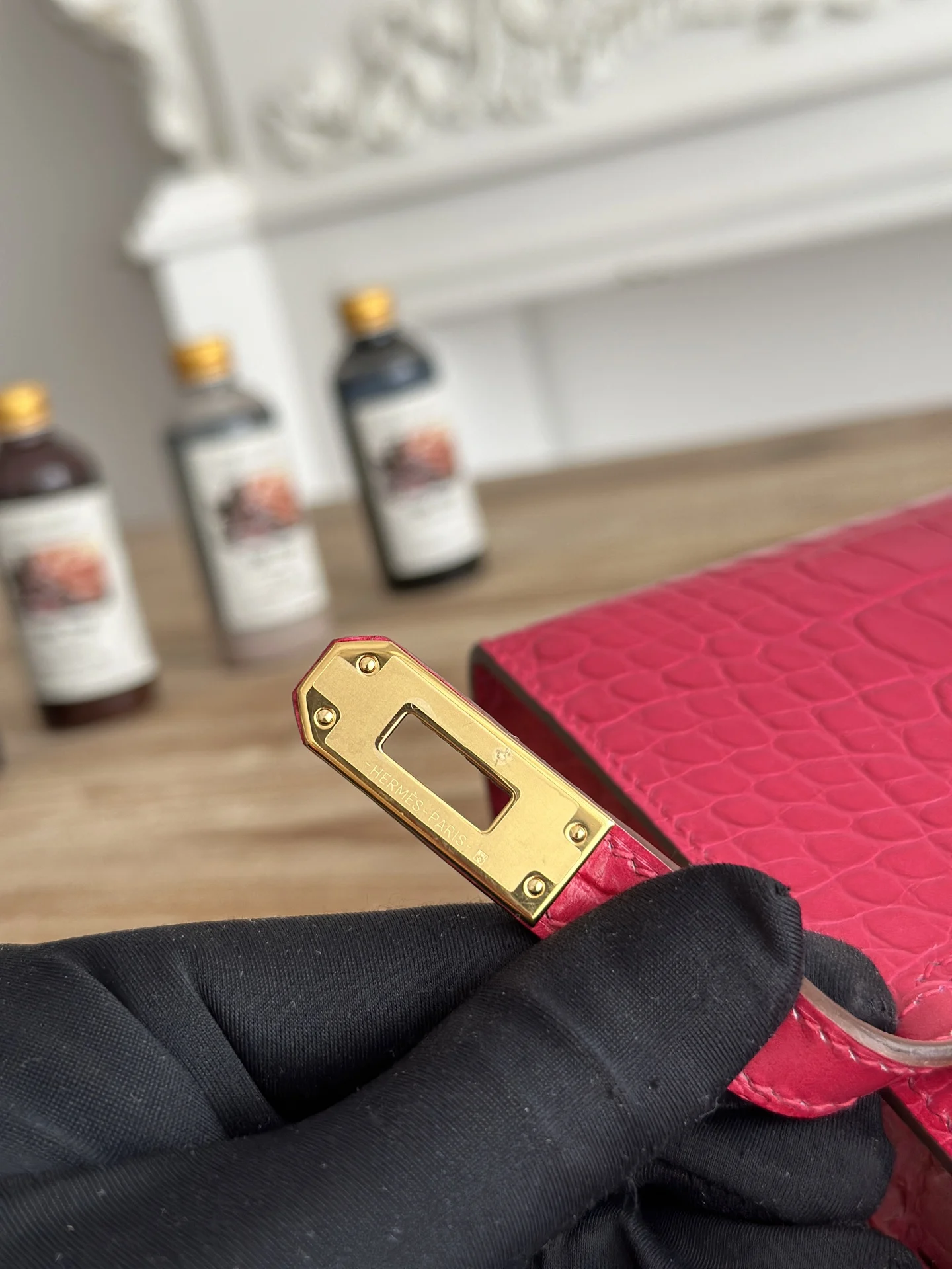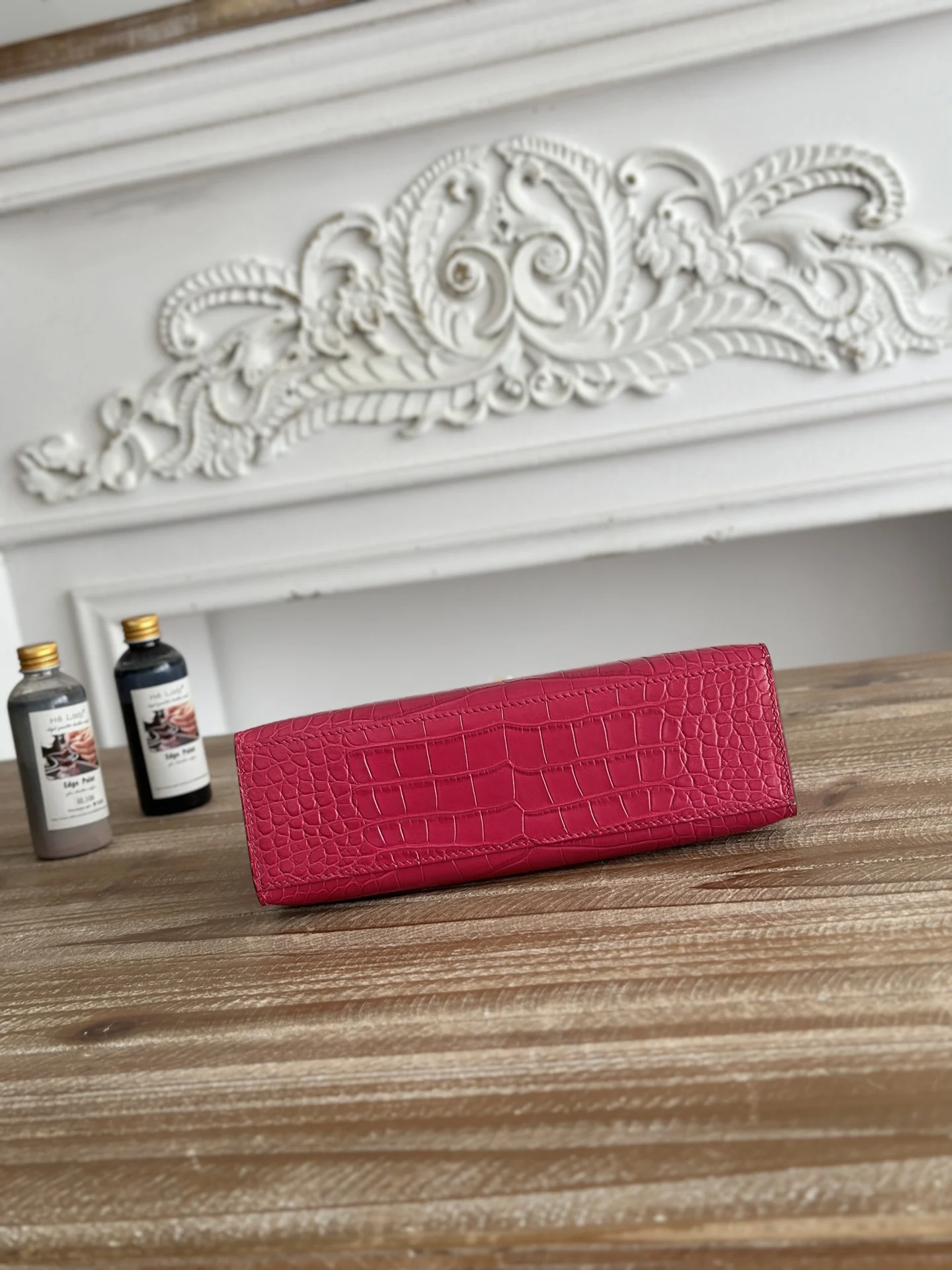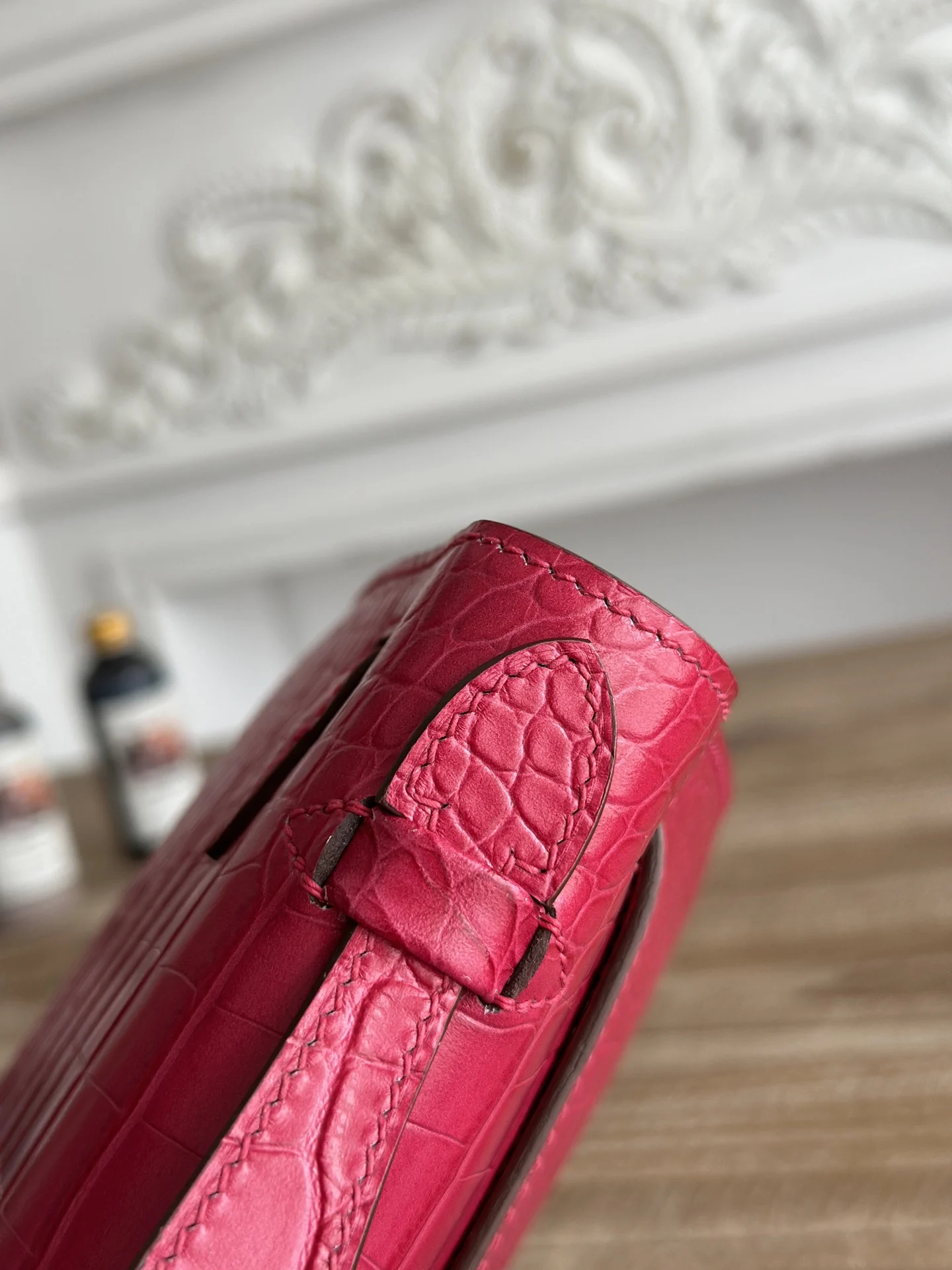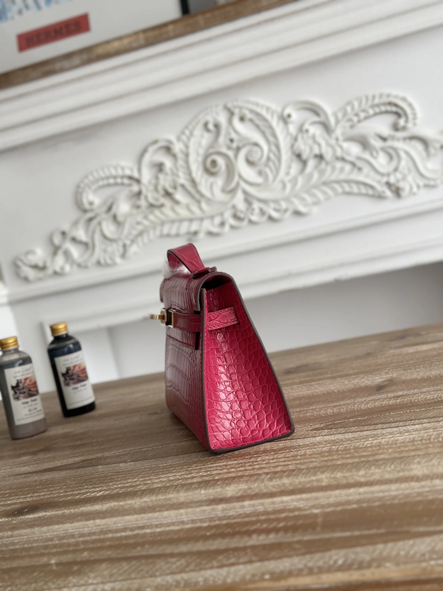 Ready Stock Semi-Handmade, Commonly Known as Kelly Mini 1st Generation Handbag Hermes Kelly Mini Crocodile-Embossed Cowhide Semi-Handmade, Waxed Thread Stitching Color: Peach Red, Gold Hardware Size: 22cm