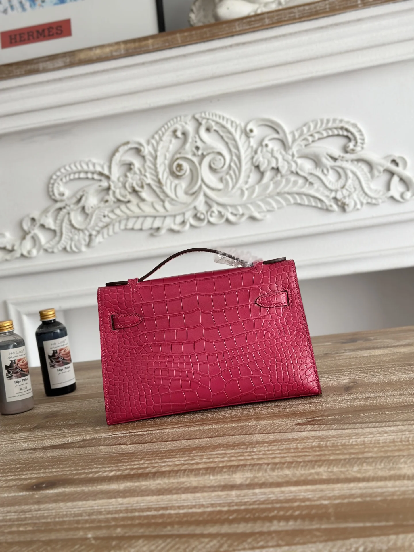 Ready Stock Semi-Handmade, Commonly Known as Kelly Mini 1st Generation Handbag Hermes Kelly Mini Crocodile-Embossed Cowhide Semi-Handmade, Waxed Thread Stitching Color: Peach Red, ..