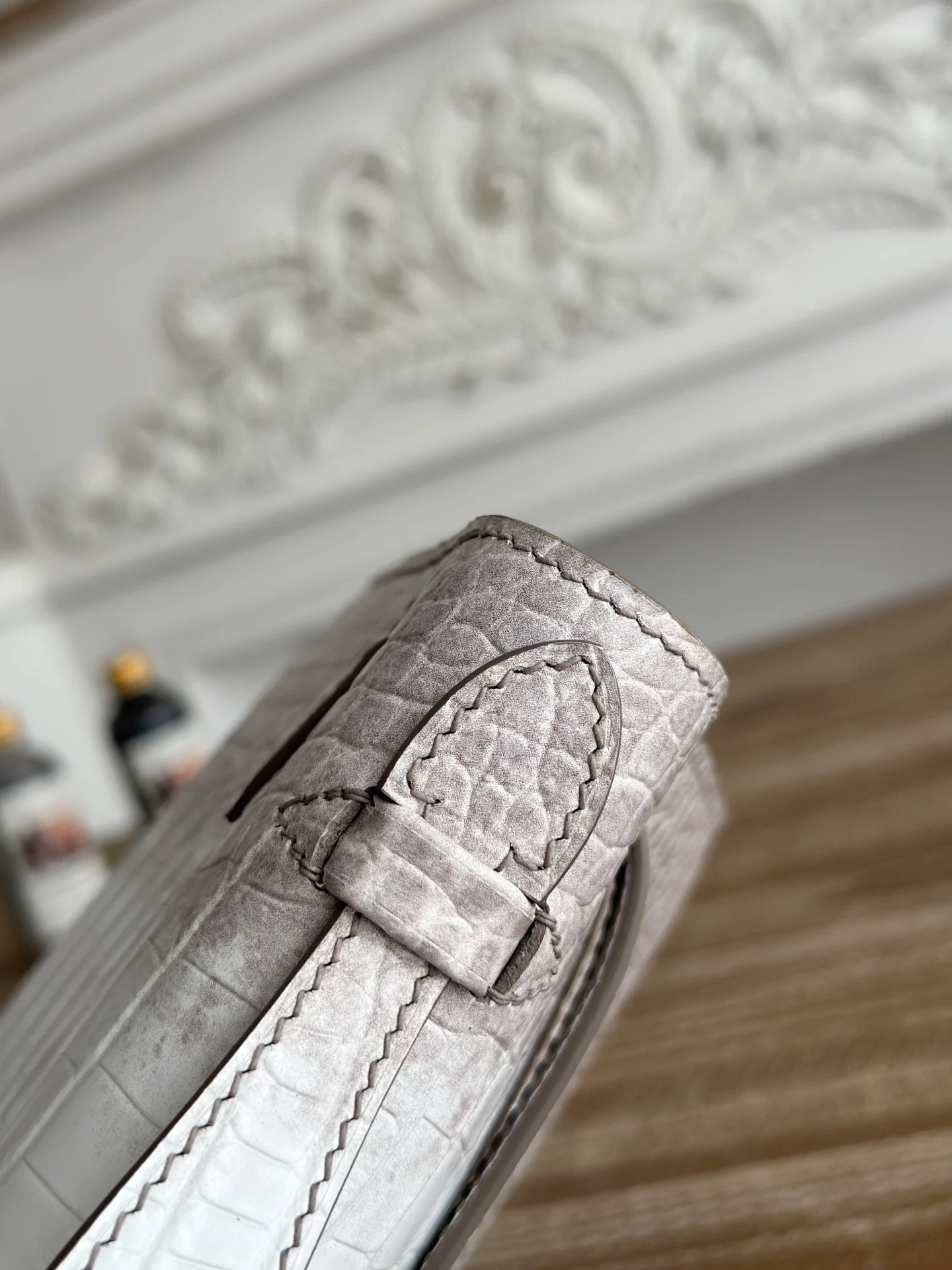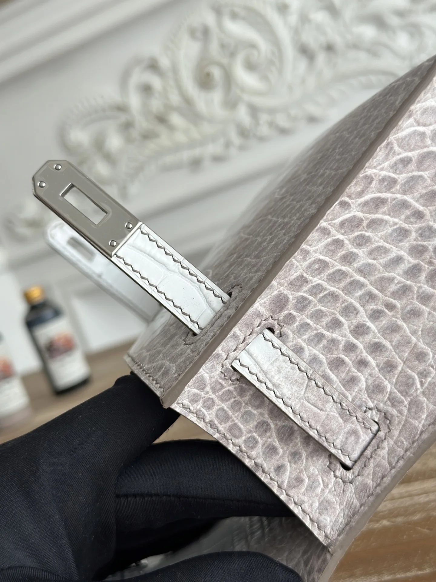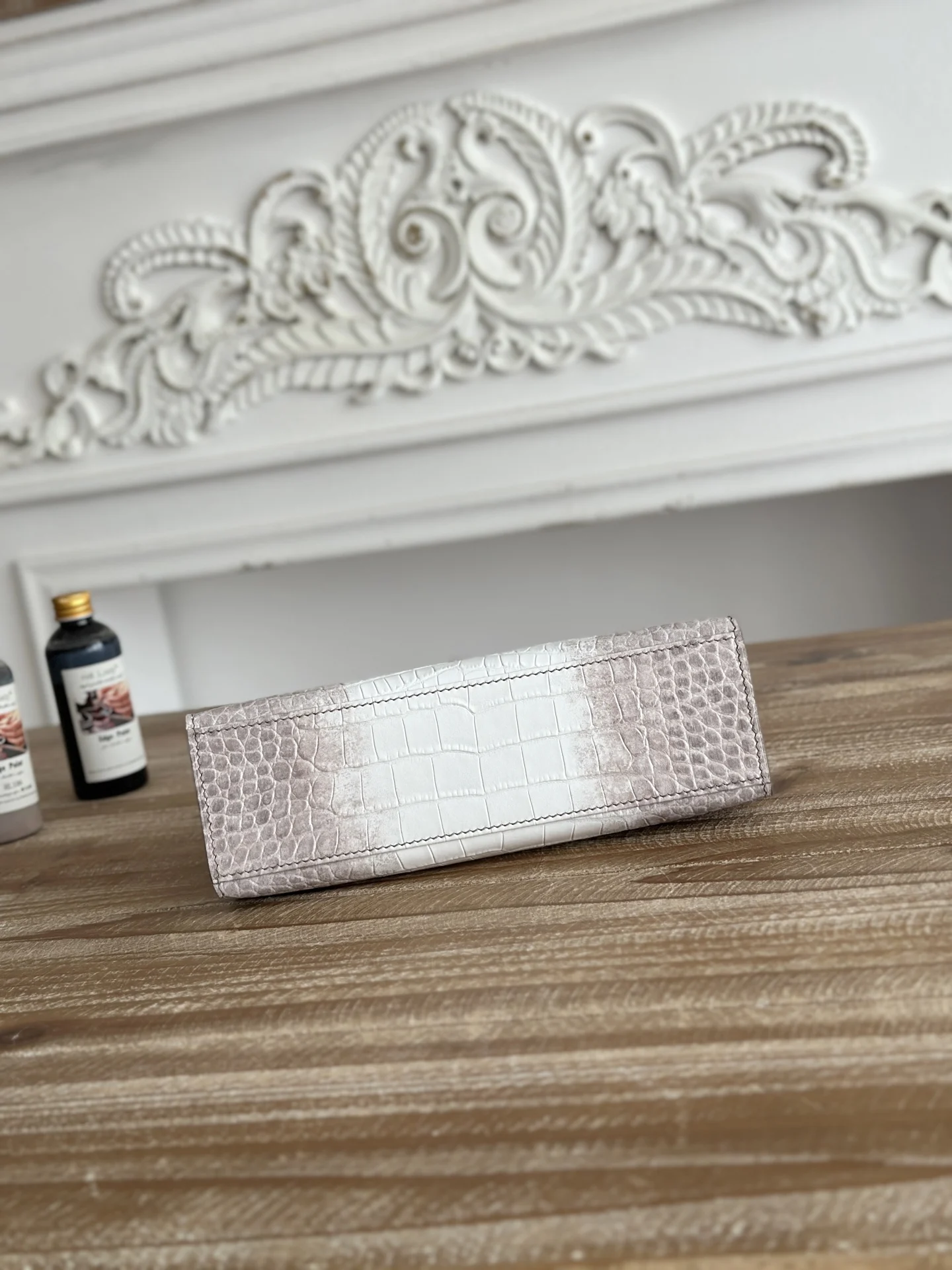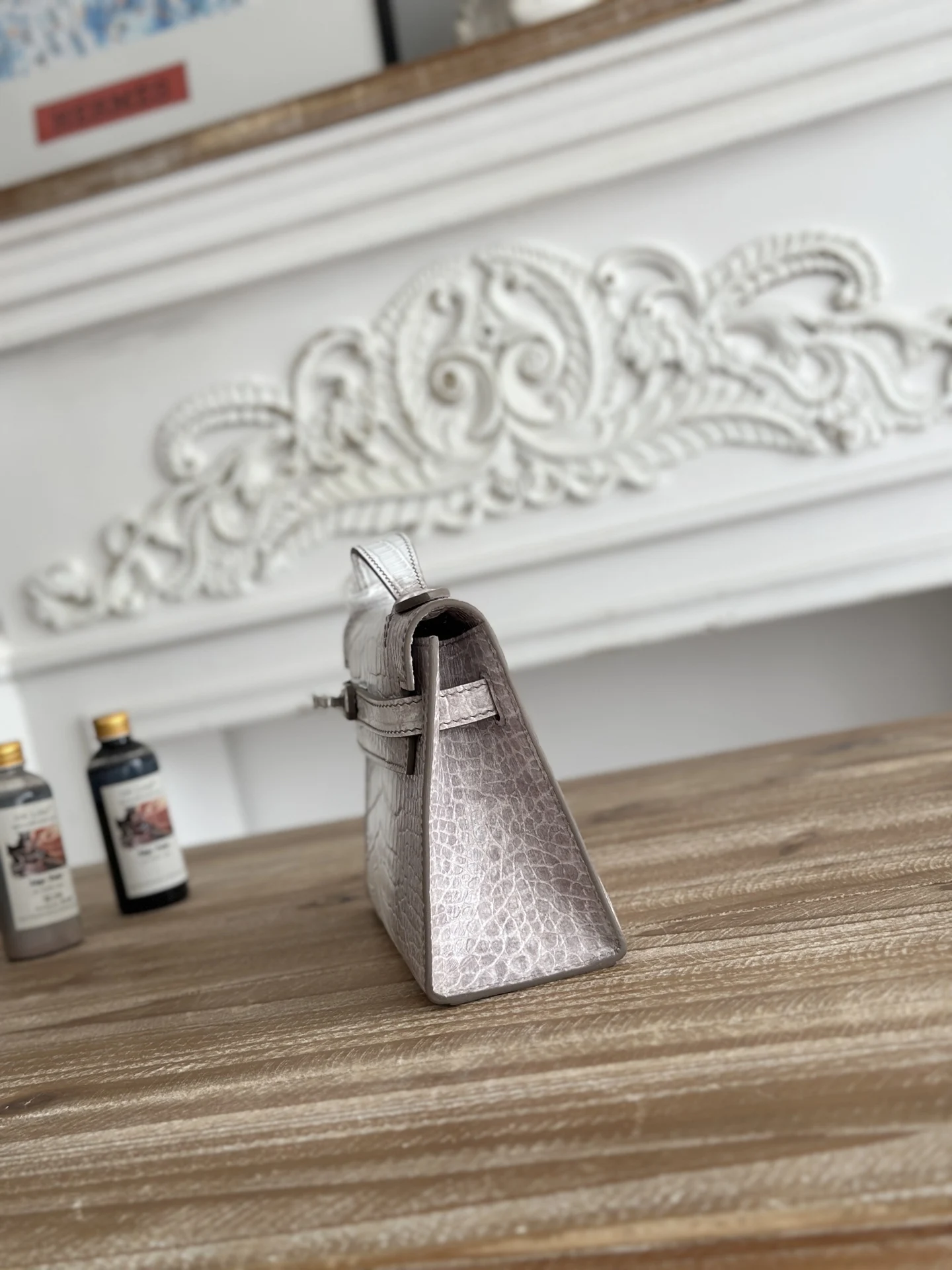 Ready-to-ship, semi-handmade, commonly known as the Kelly Mini 1 handbag, Hermes Kelly Mini, crocodile-embossed cowhide, semi-handmade, beeswax stitching. Color: Himalaya, silver hardware. Size: 22cm.