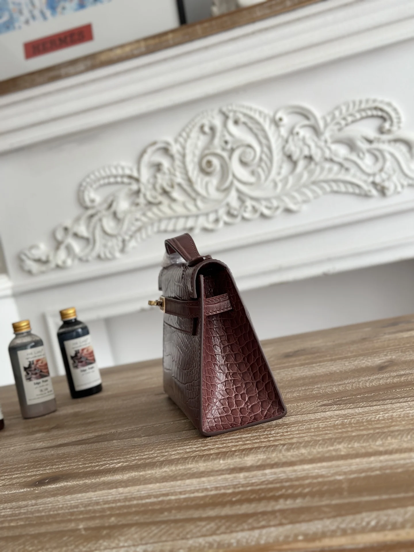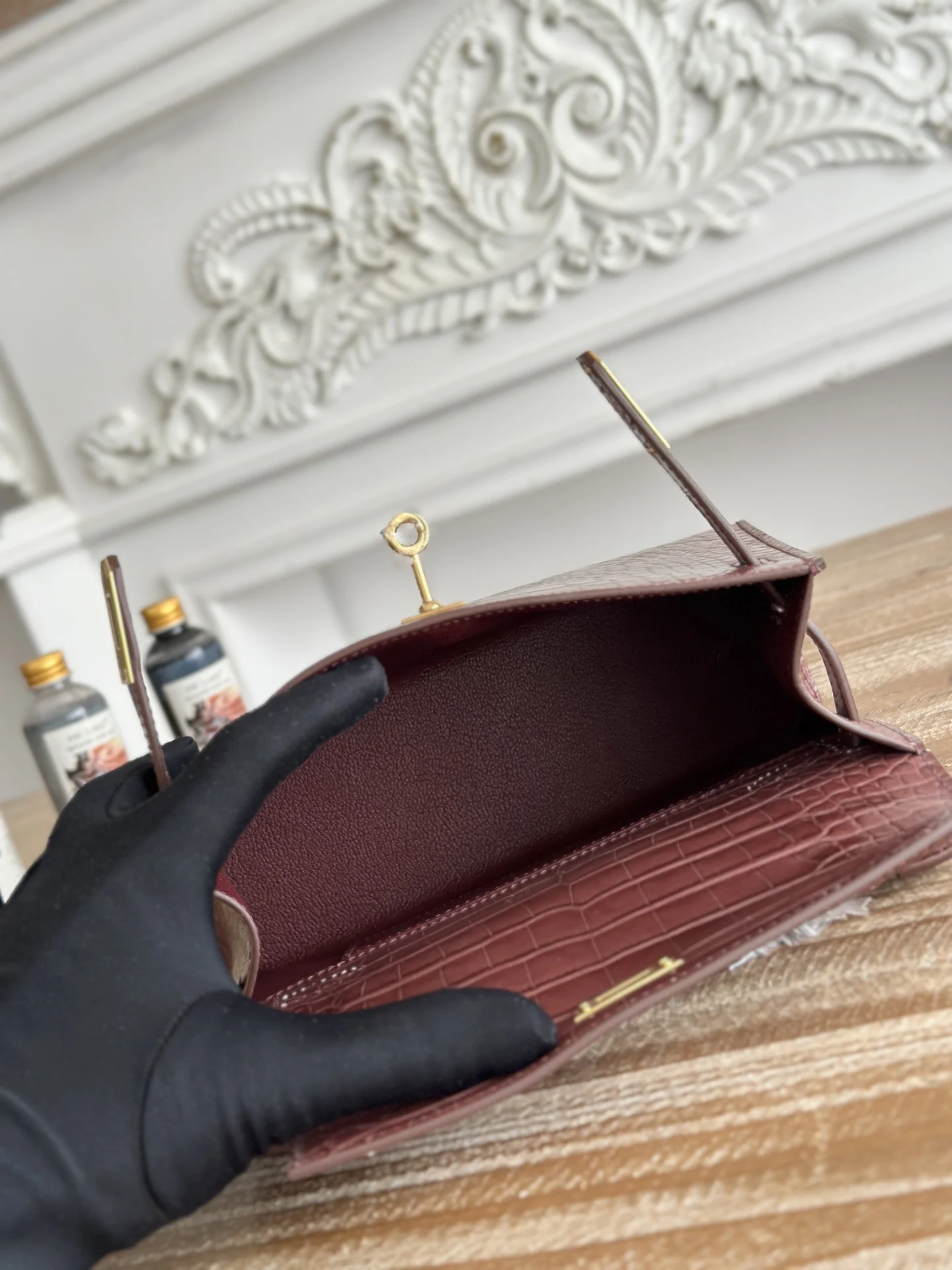 Ready Stock Semi-Handmade, Commonly Known as Kelly Mini 1st Generation Handbag Hermes Kelly Mini Crocodile-Embossed Cowhide Semi-Handmade, Waxed Thread Stitching Color: Burgundy, Gold Hardware Size: 22cm