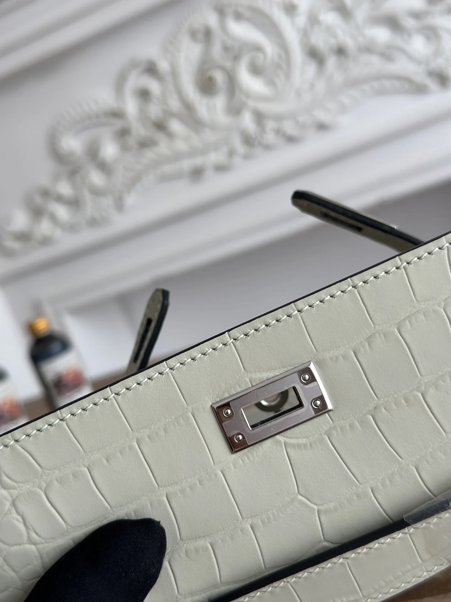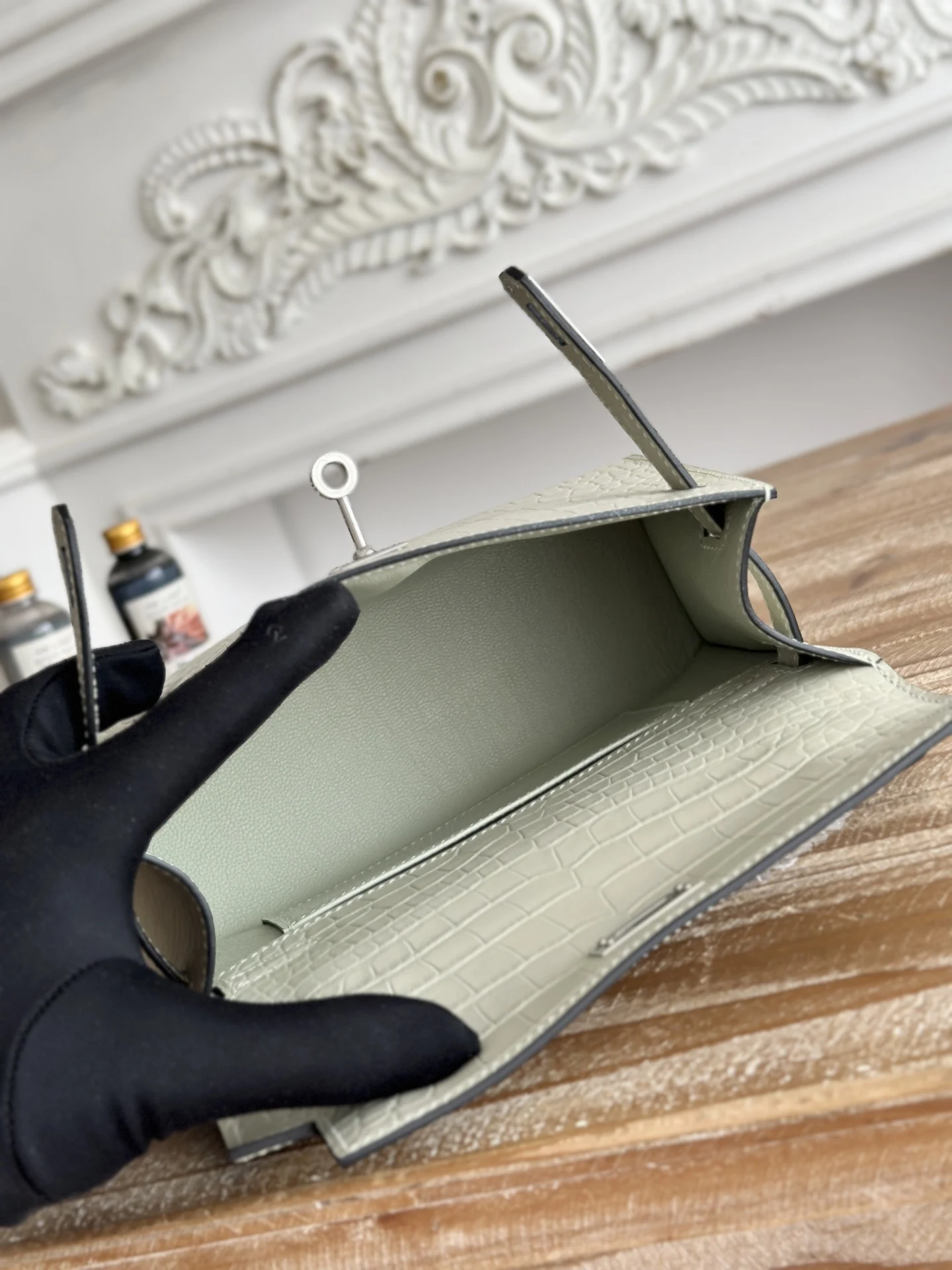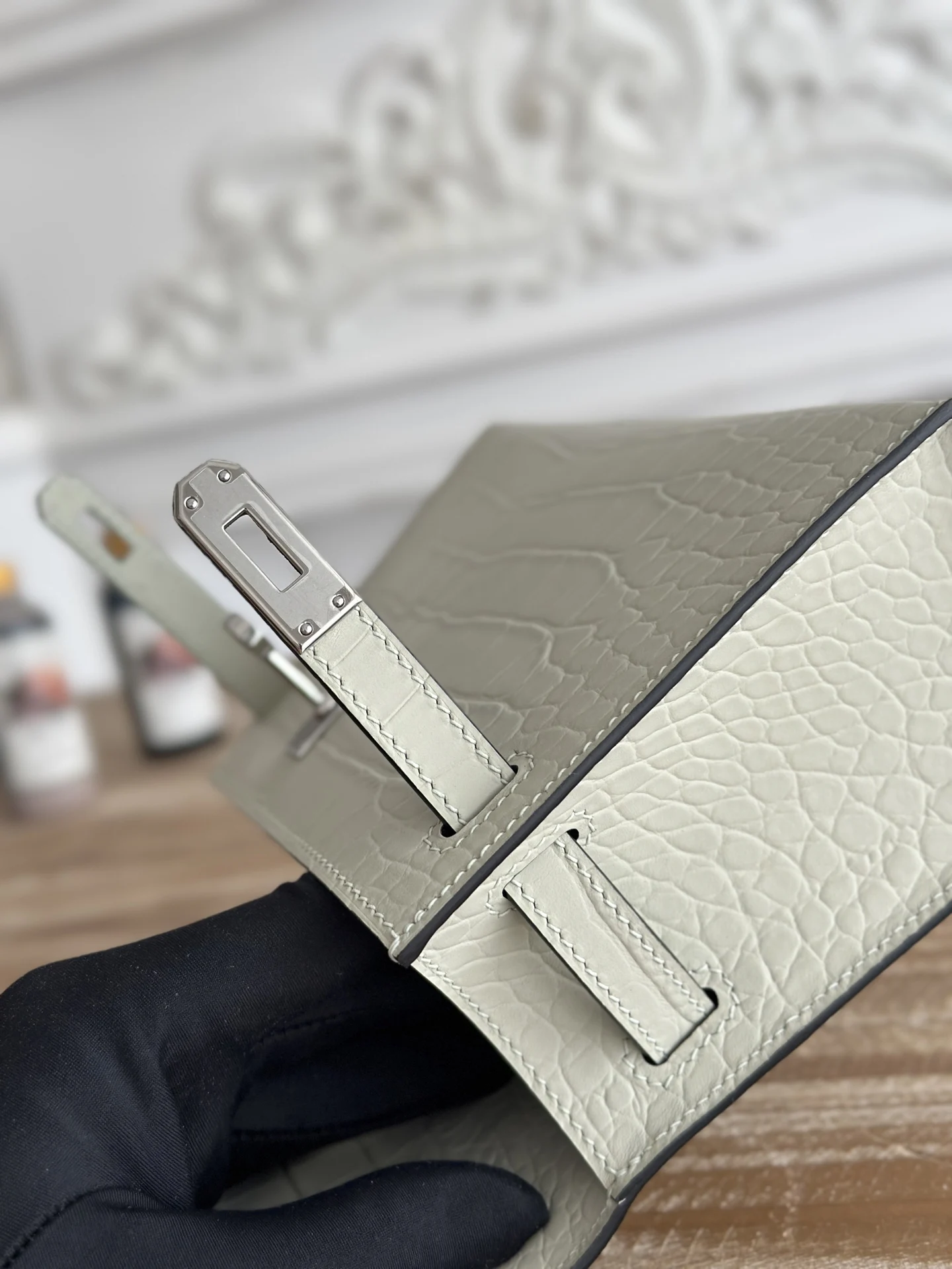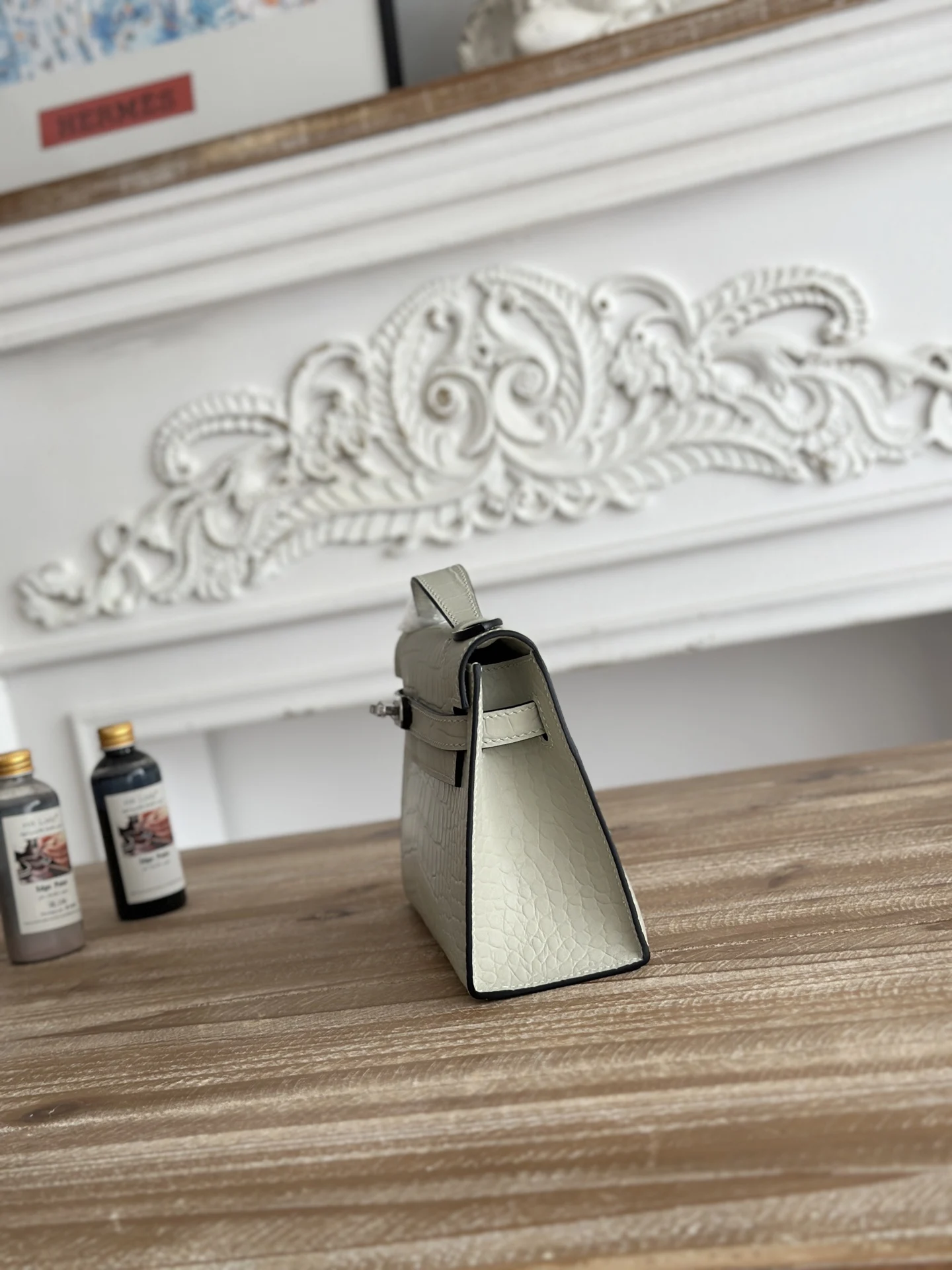 Ready Stock Semi-Handmade, Commonly Known as Kelly Mini 1st Generation Handbag Hermes Kelly Mini Crocodile-Embossed Cowhide Semi-Handmade, Waxed Thread Stitching Color: Glacier Grey, Silver Hardware Size: 22cm