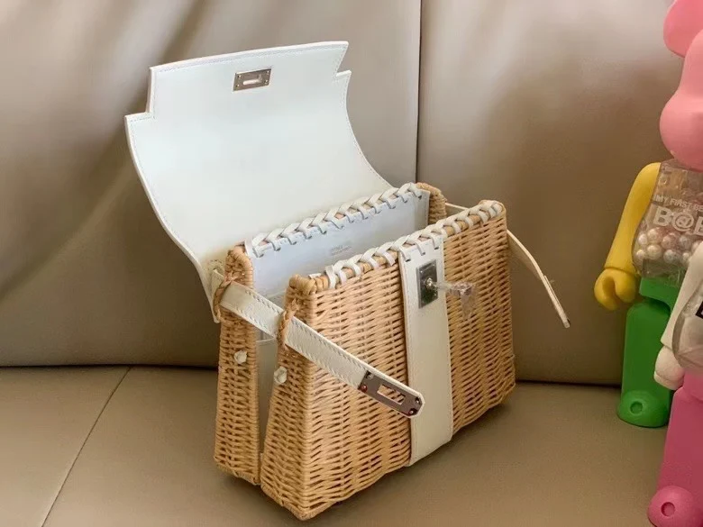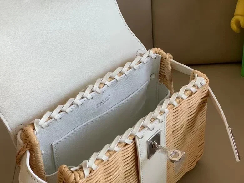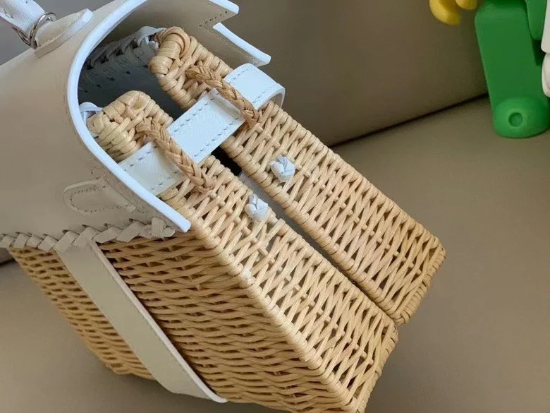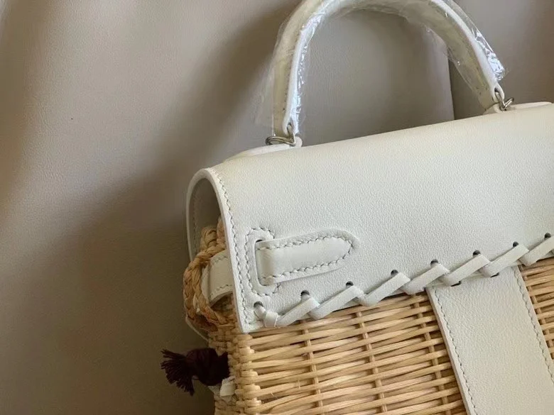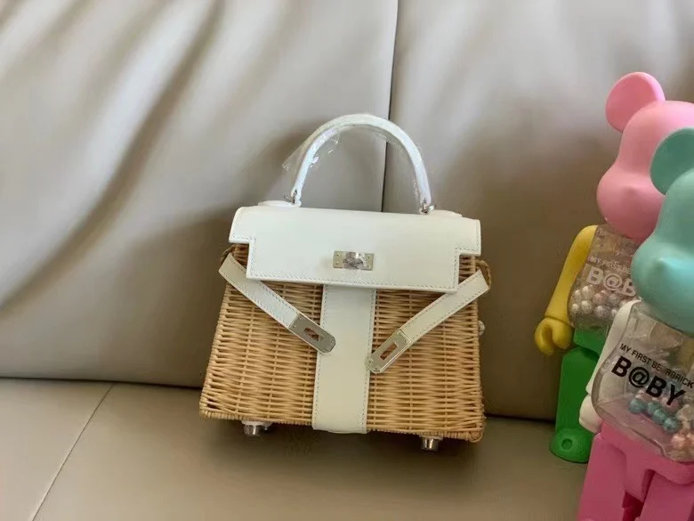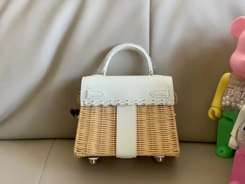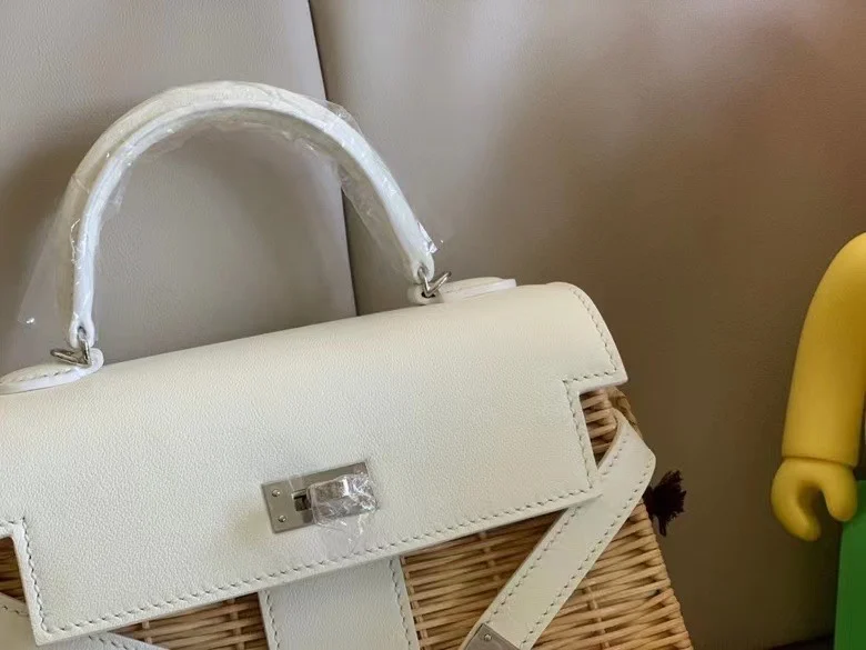 Kelly Picnic 20cm Imported Swift Leather and Woven Wicker [Pure White] with Silver Hardware Limited Edition, Boutique Synchronization, Wax Thread Stitching, Pure Steel Hardware