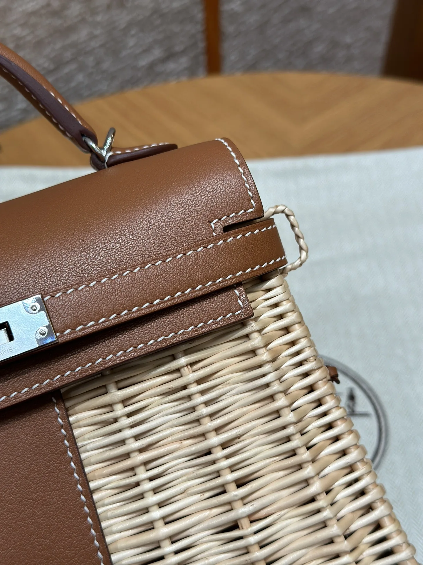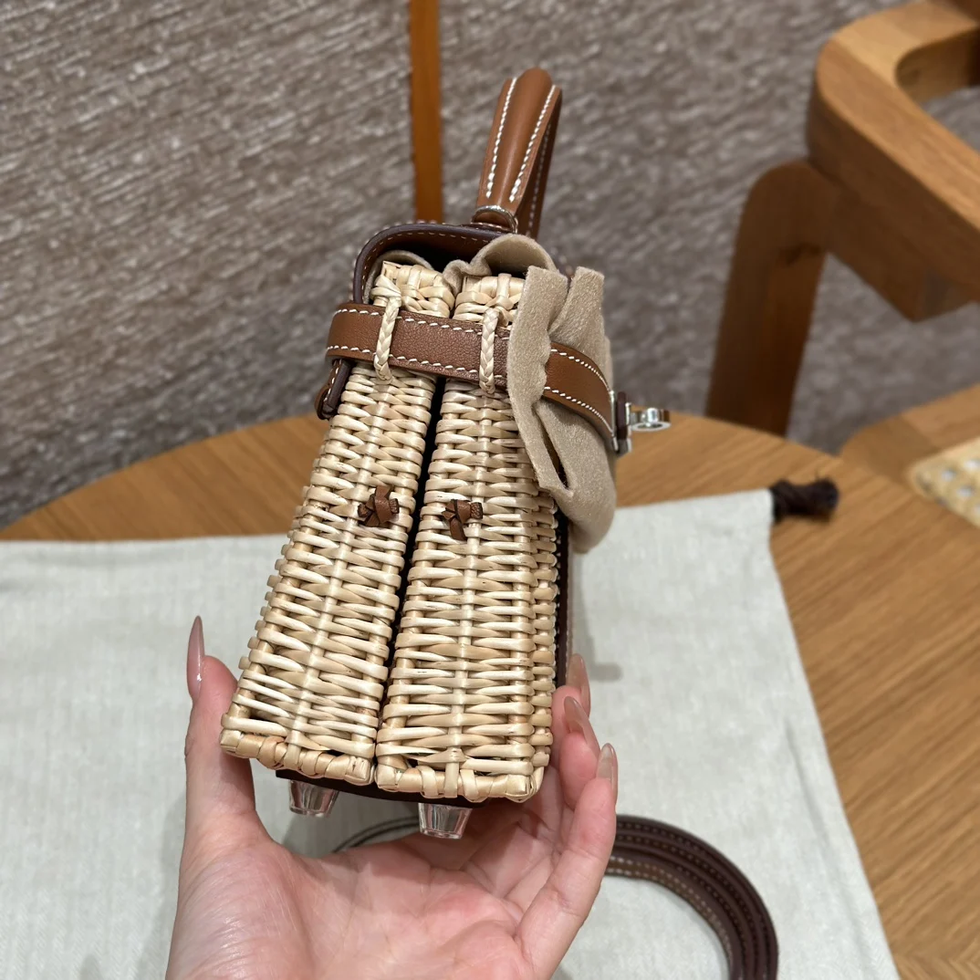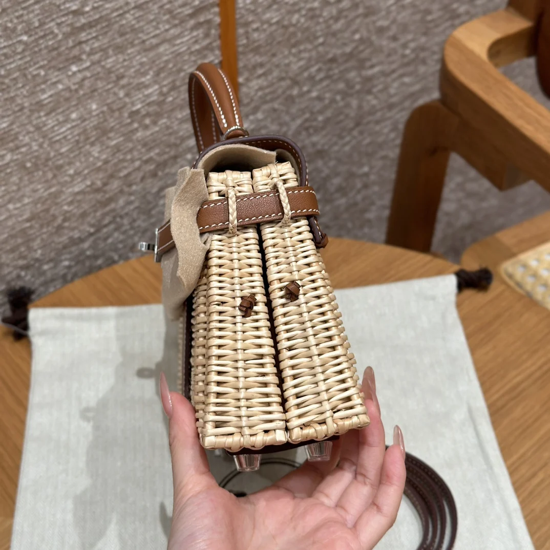 Kelly Picnic 20cm Picnic Bag, Imported Original Swift Leather with Woven Wicker, Gold Brown, Silver Hardware, Limited Edition, In-Store Synchronization, Wax Thread Stitching, Pure ..
