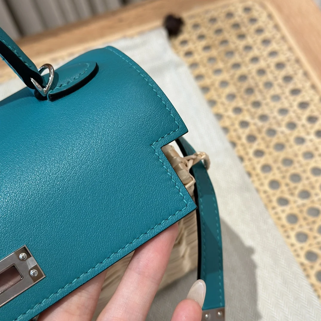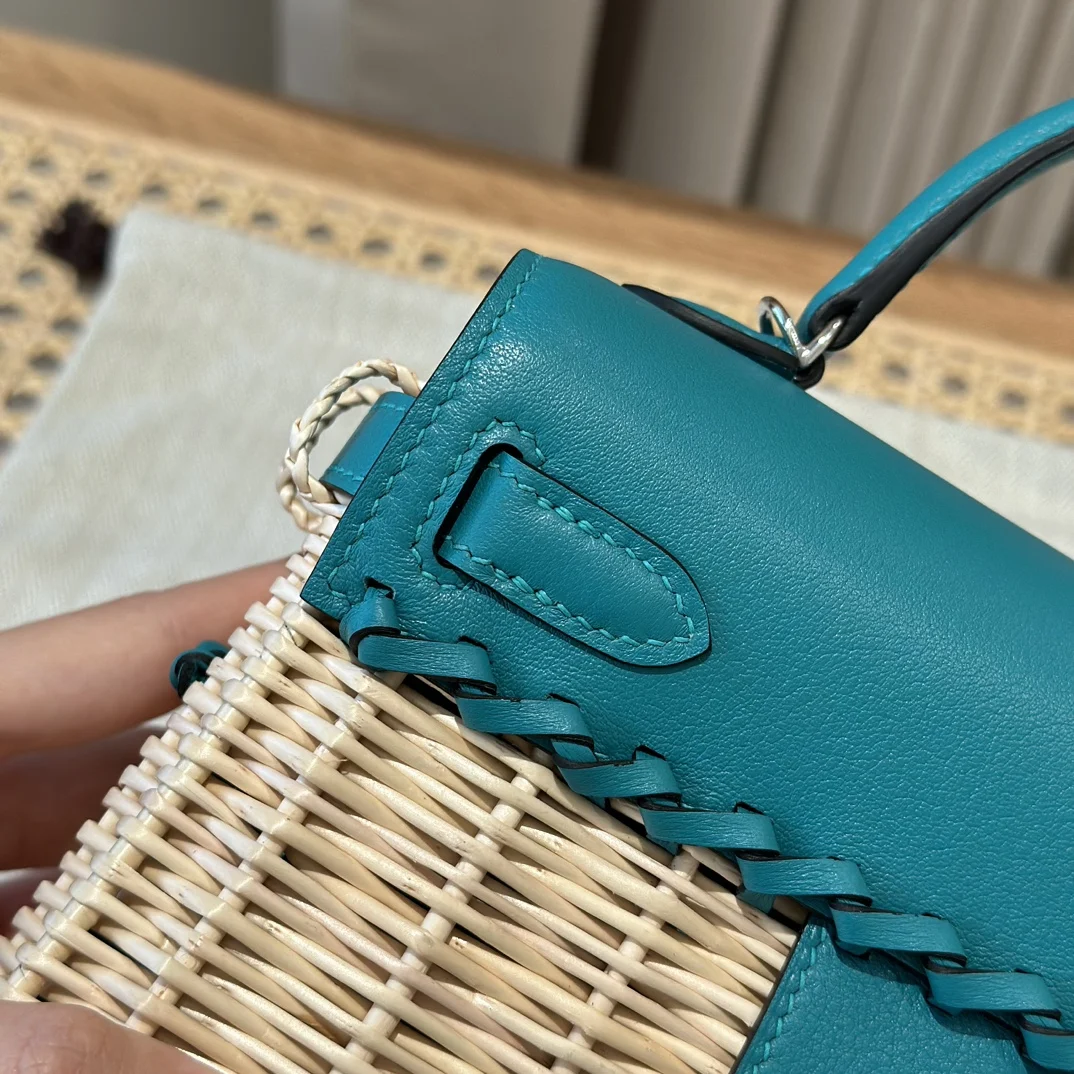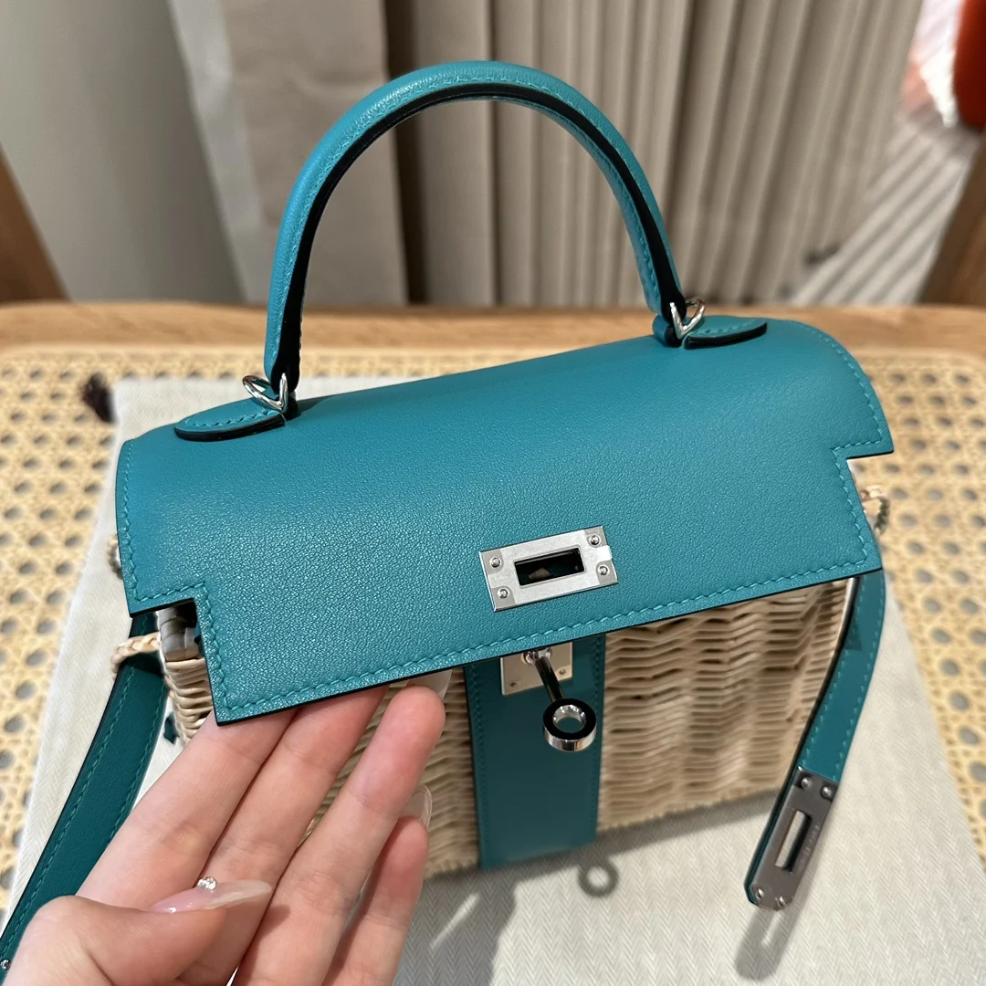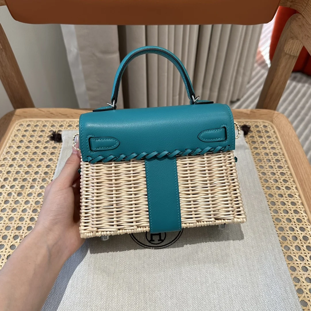 Kelly Picnic Bag 20cm, Original Imported Swift Leather with Woven Wicker, Peacock Blue, Silver Hardware, Limited Edition, Same Style as in Boutique, Wax Thread Stitching, Pure Steel Hardware