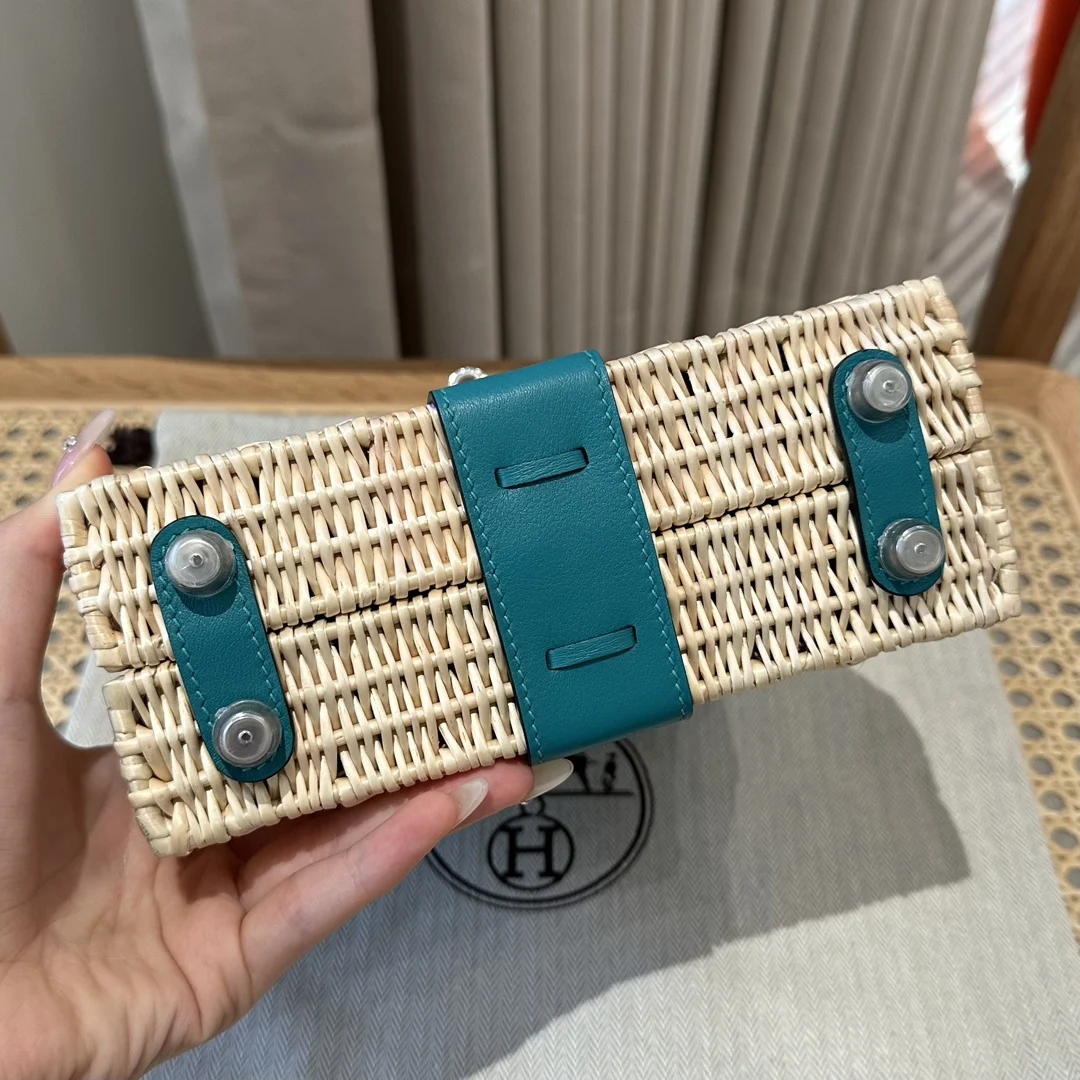 Kelly Picnic Bag 20cm, Original Imported Swift Leather with Woven Wicker, Peacock Blue, Silver Hardware, Limited Edition, Same Style as in Boutique, Wax Thread Stitching, Pure Stee..
