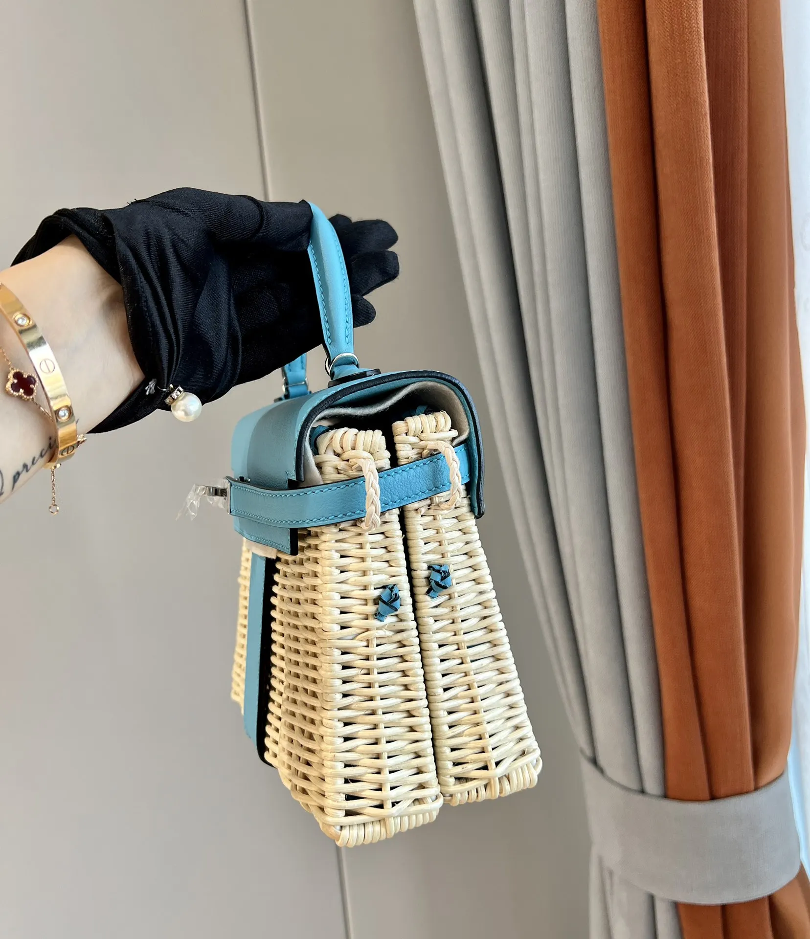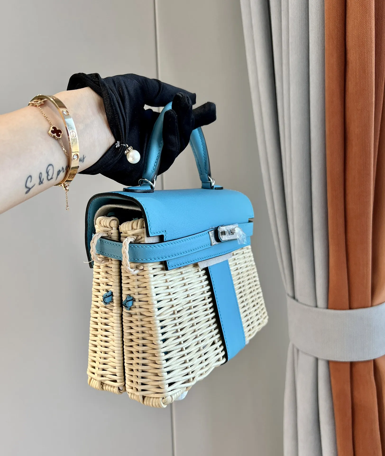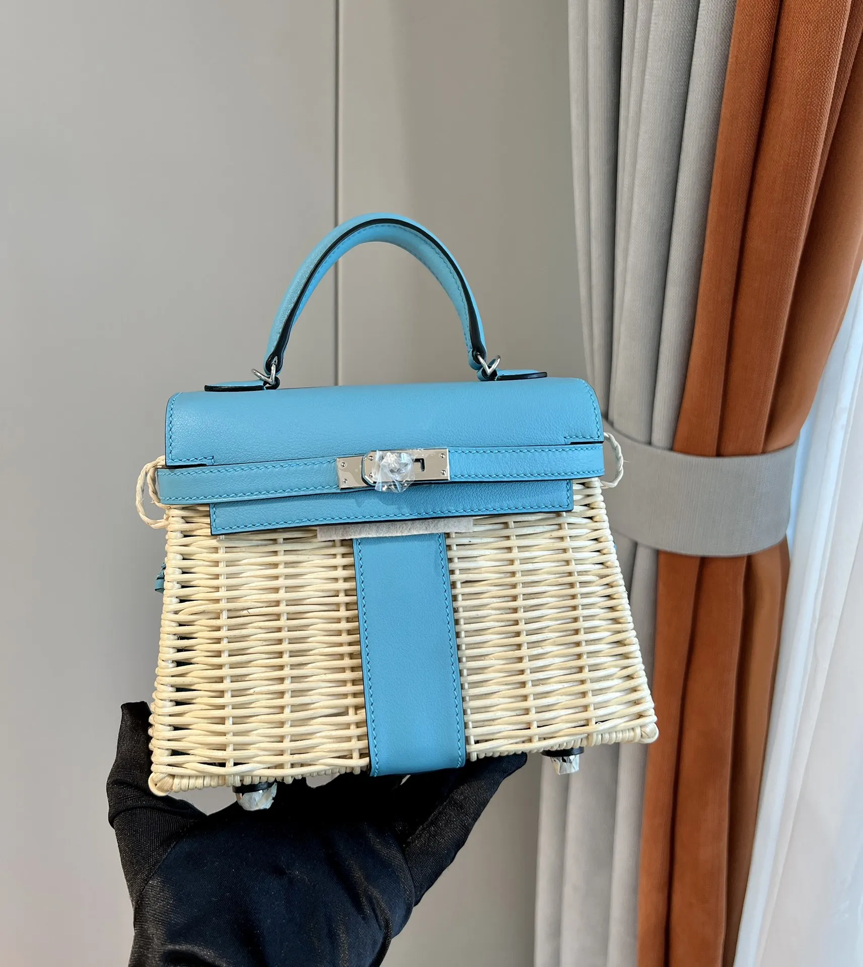 Kelly Picnic Bag 20cm, Original Imported Swift Leather with Woven Wicker, Silver Hardware Limited Edition, Boutique Synchronization, Wax Thread Sewing, Pure Steel Hardware