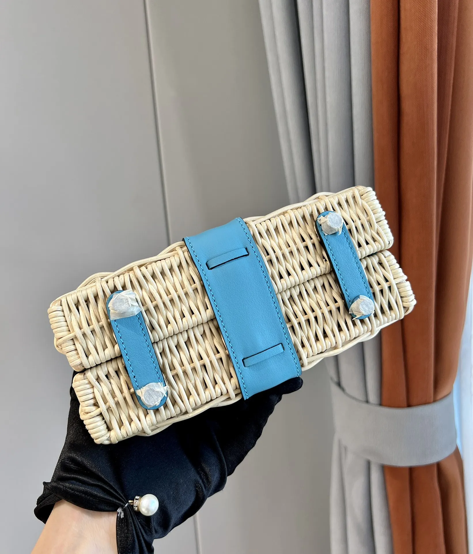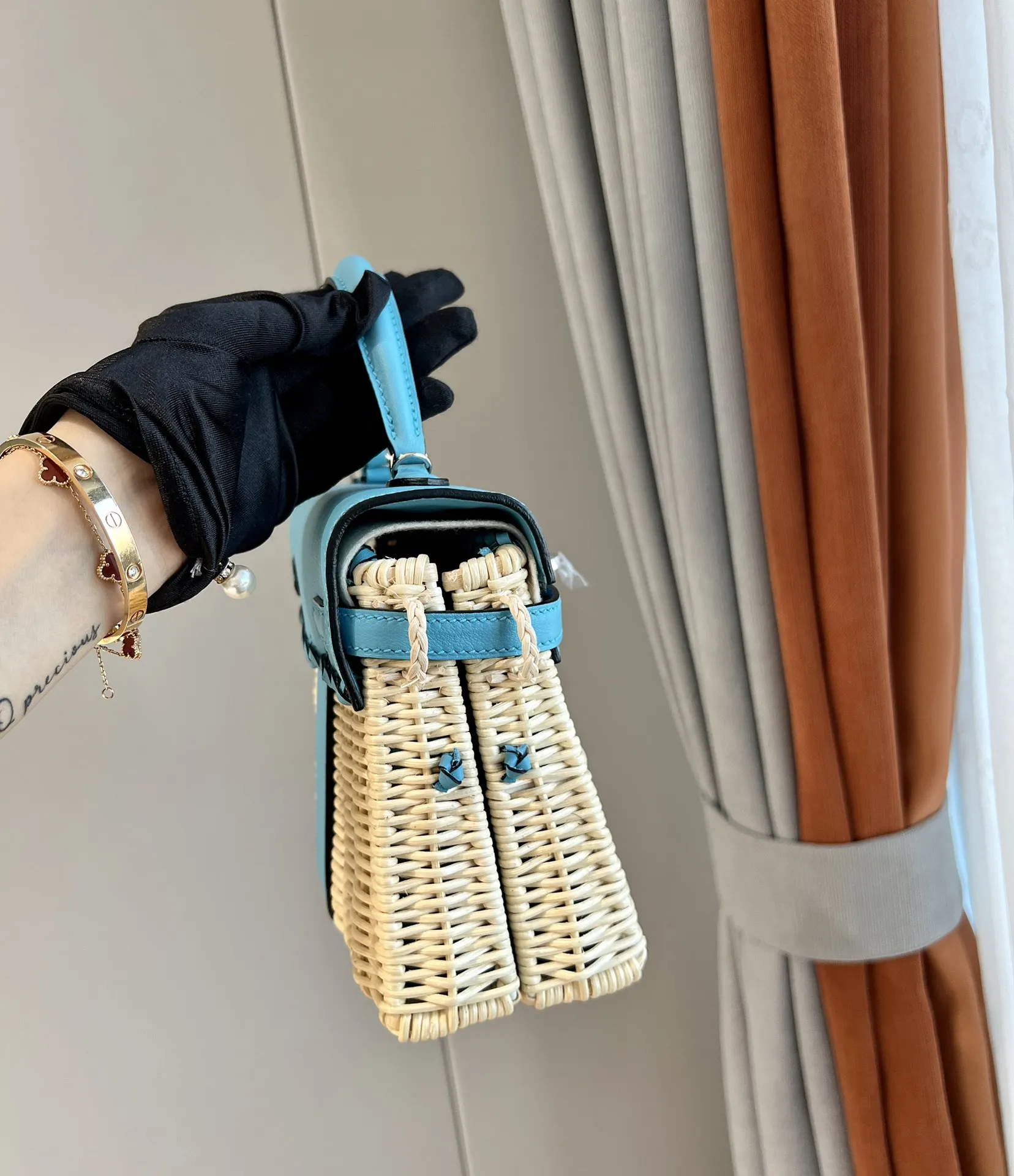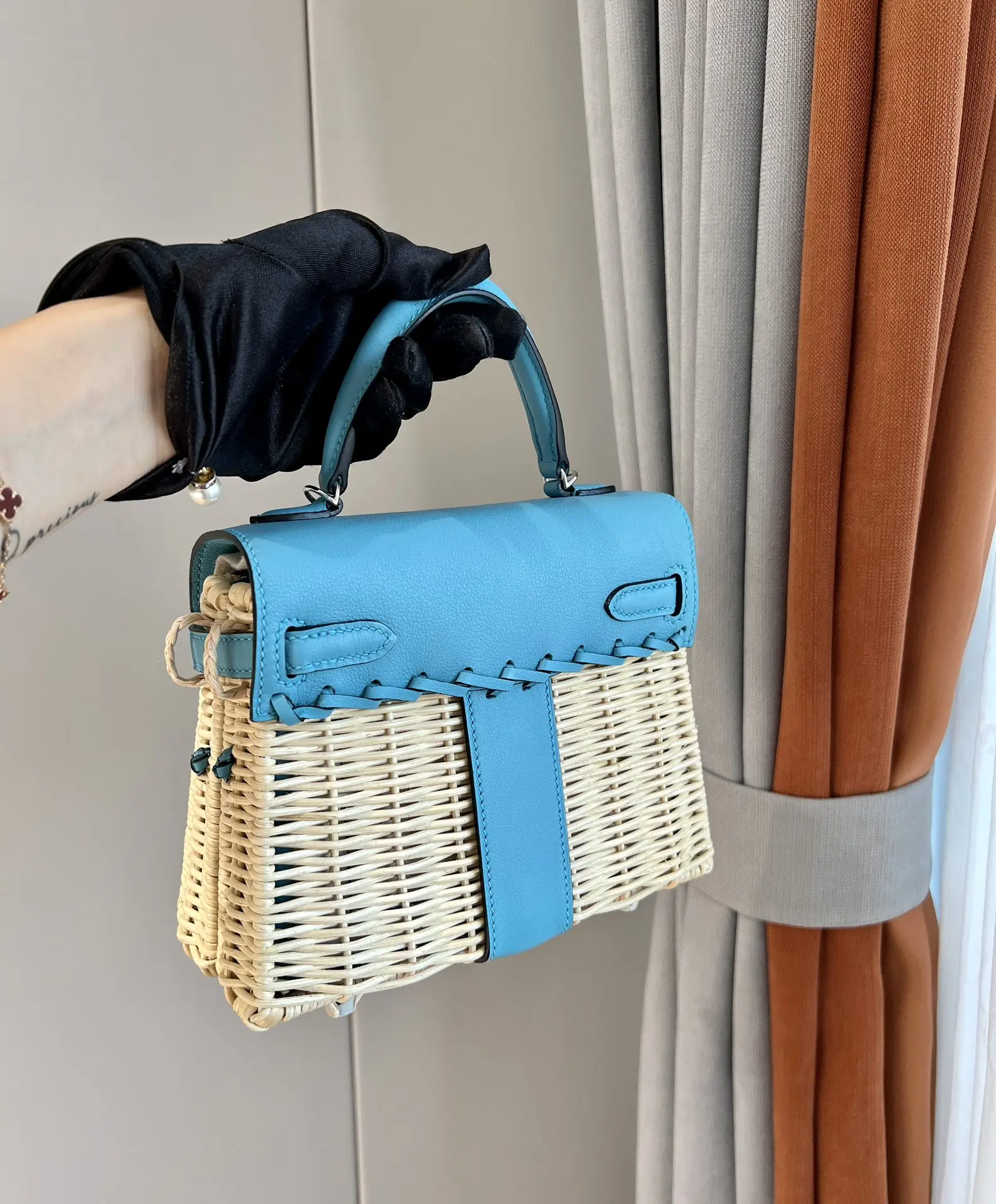 Kelly Picnic Bag 20cm, Original Imported Swift Leather with Woven Wicker, Silver Hardware Limited Edition, Boutique Synchronization, Wax Thread Sewing, Pure Steel Hardware