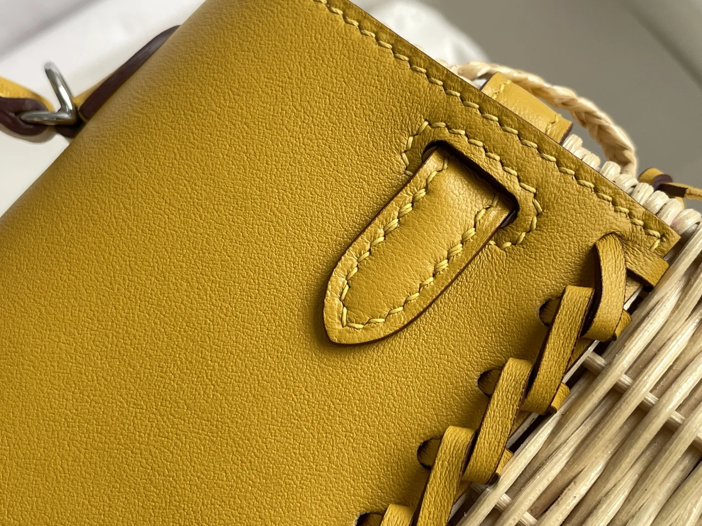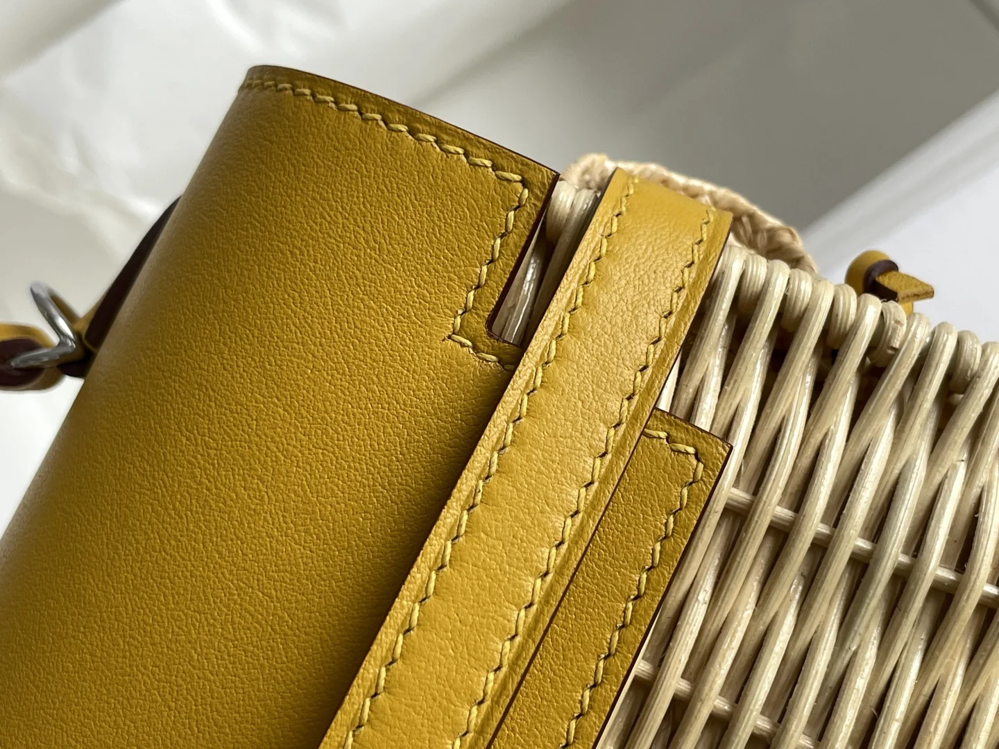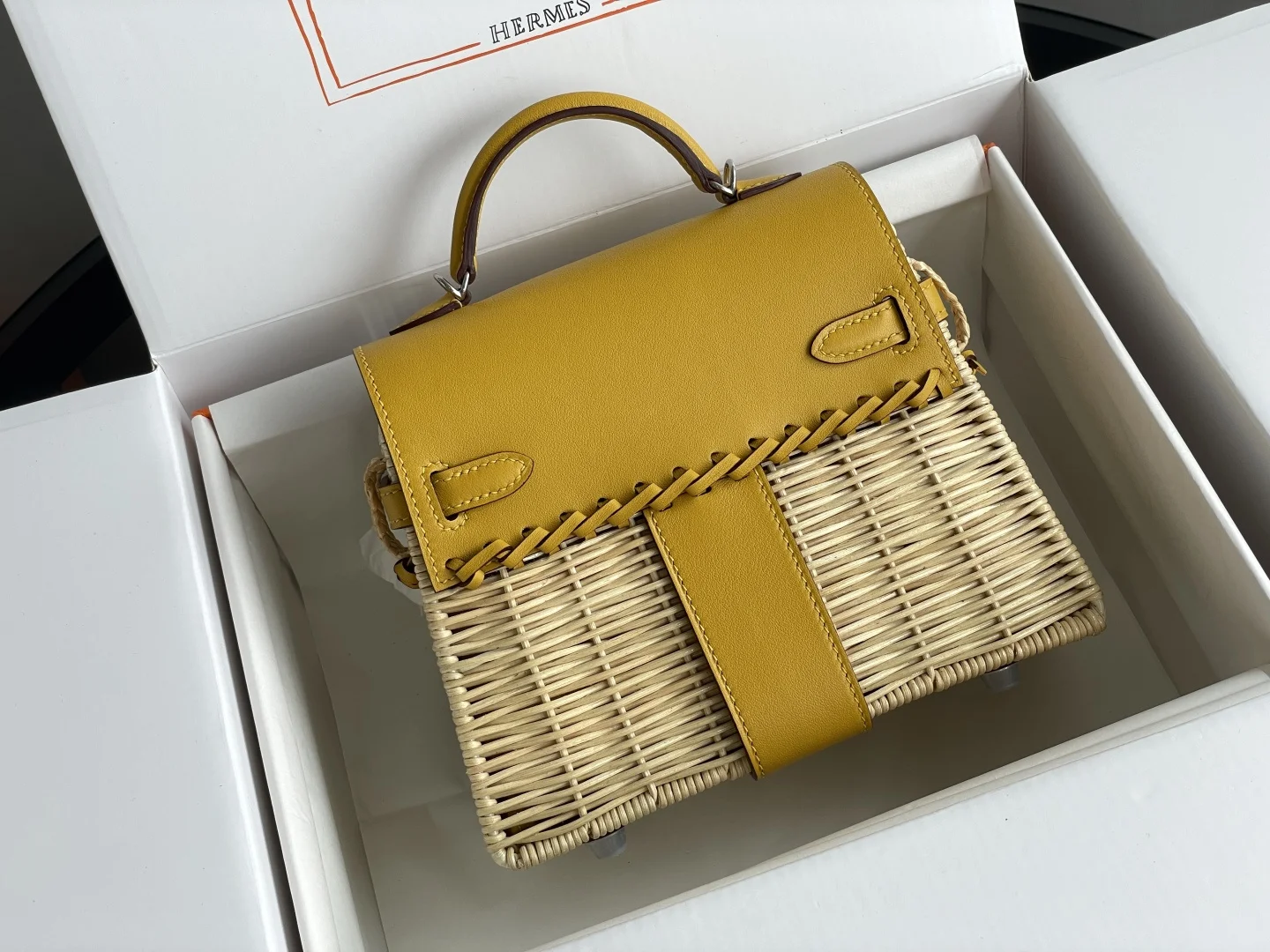 New Kelly Picnic Bag 20cm, Original Imported Swift Leather with Hand-Woven Wicker, Amber Yellow with Silver Hardware, Limited Edition, Boutique Synchronization, Wax Thread Stitchi..