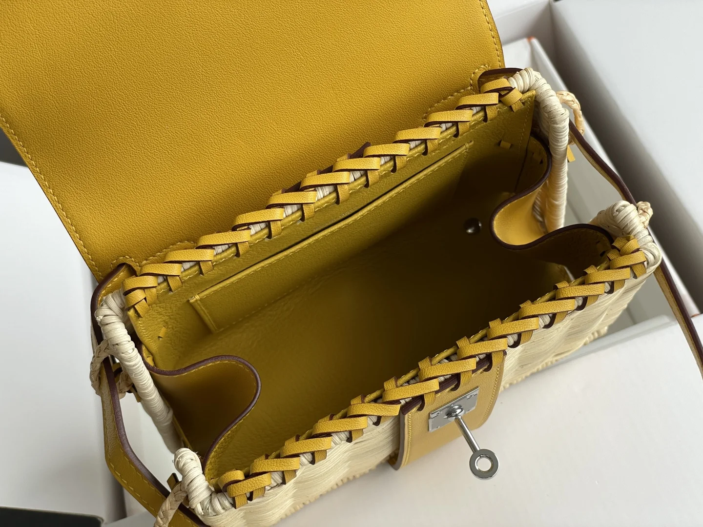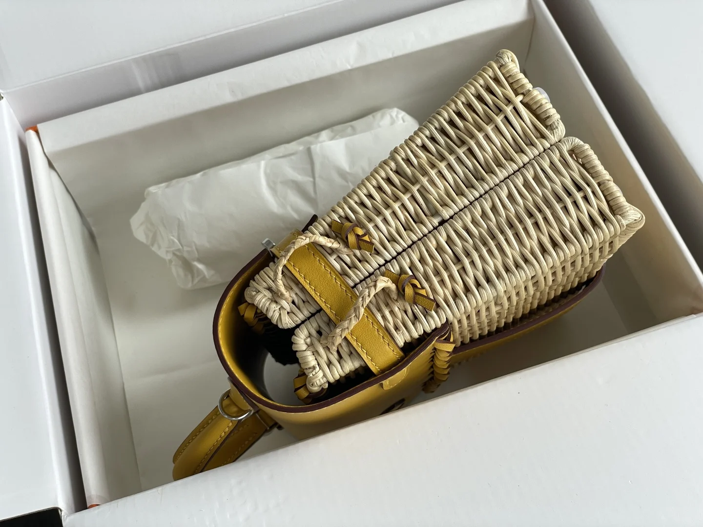 New Kelly Picnic Bag 20cm, Original Imported Swift Leather with Hand-Woven Wicker, Amber Yellow with Silver Hardware, Limited Edition, Boutique Synchronization, Wax Thread Stitching, Pure Steel Hardware