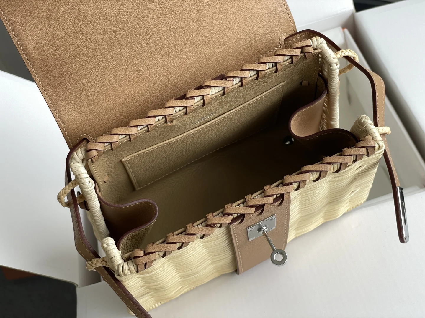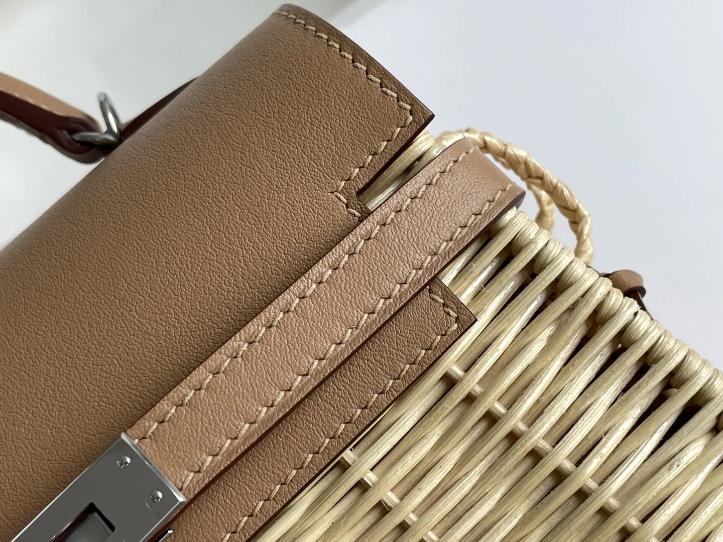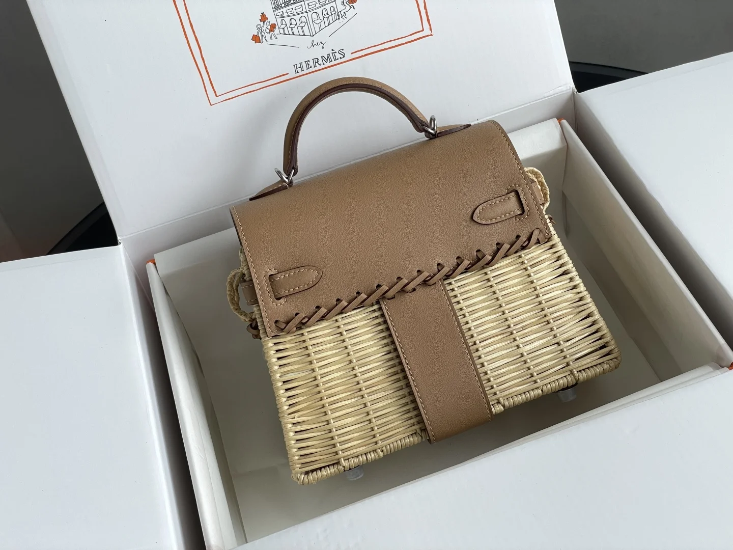 New Kelly Picnic Bag 20cm, Original Imported Swift Leather with Hand-Woven Wicker, [Milk Tea Color], Silver Hardware, Limited Edition, Synchronized with Boutique, Wax Thread Sewing, Pure Steel Hardware