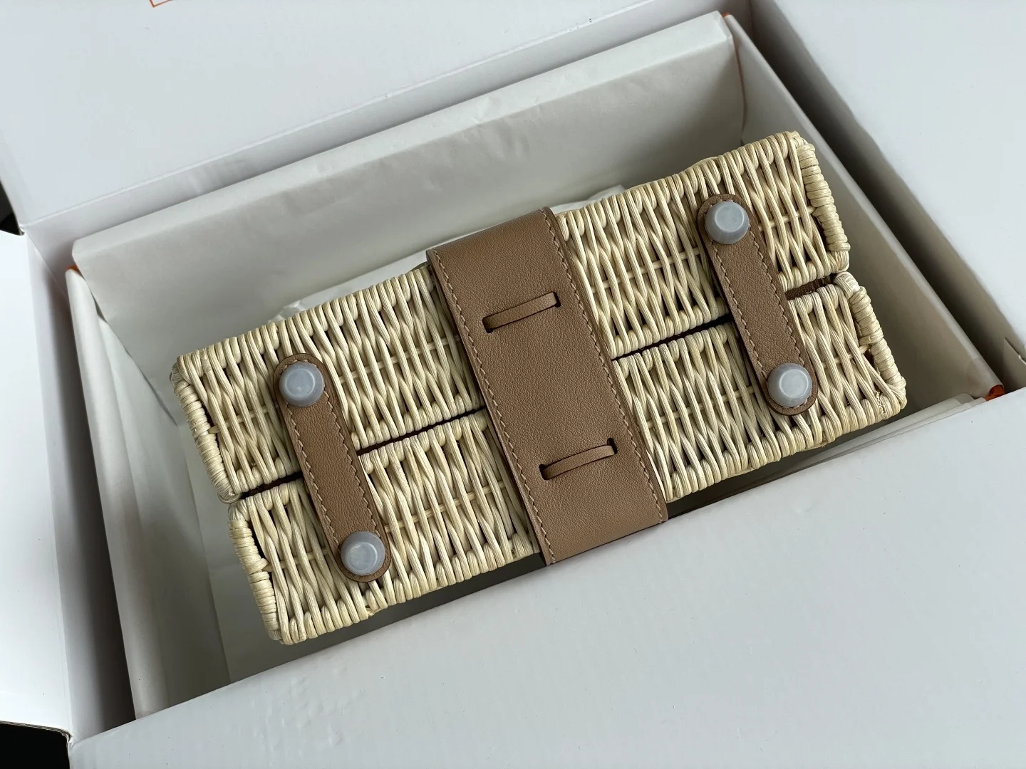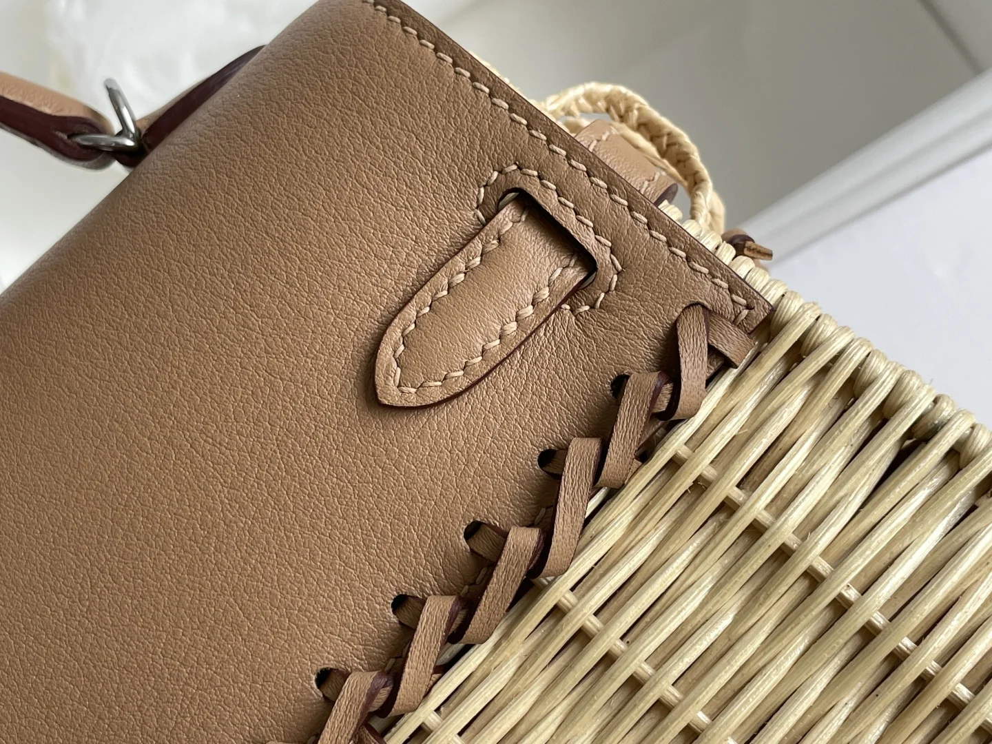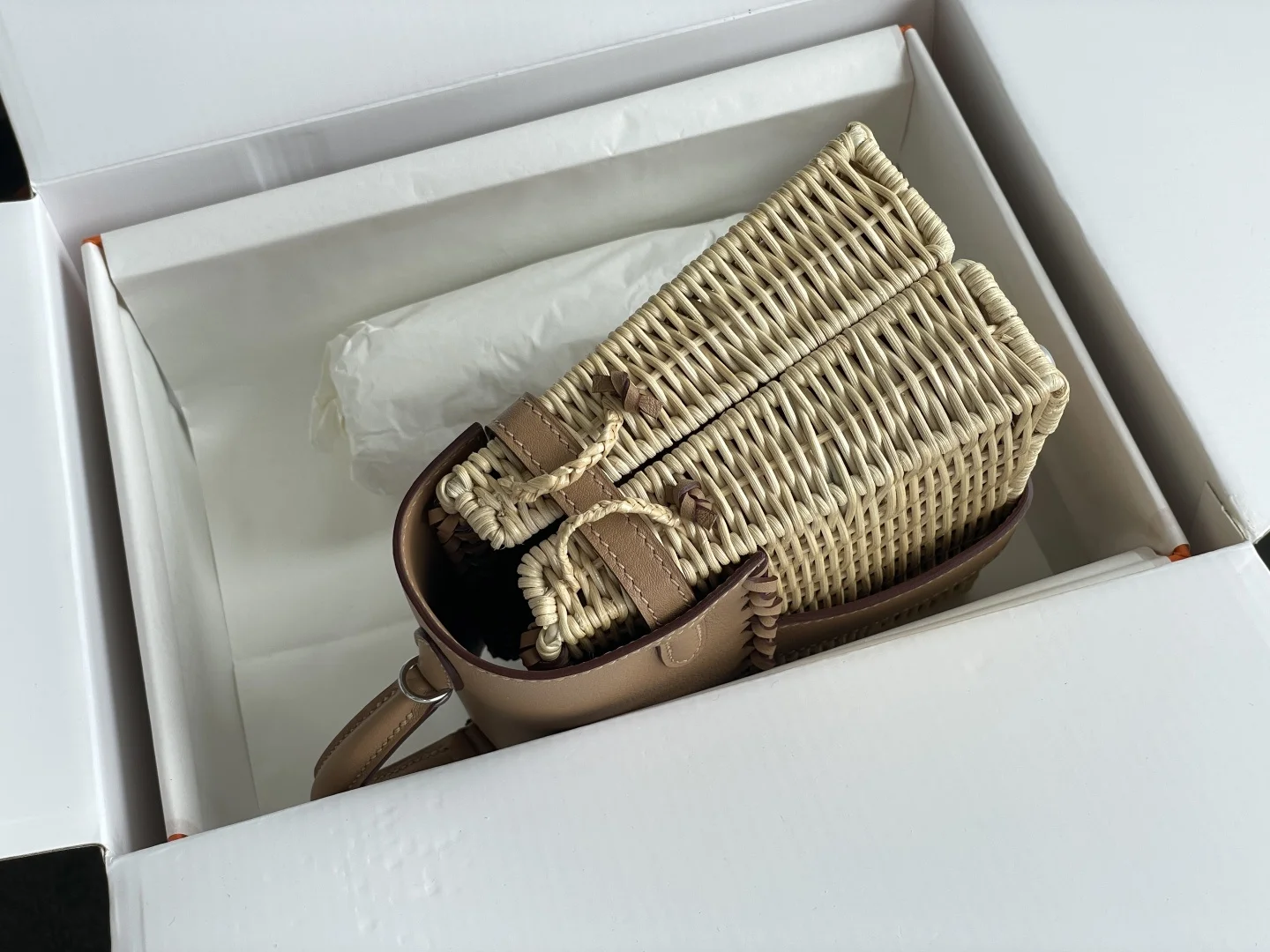 New Kelly Picnic Bag 20cm, Original Imported Swift Leather with Hand-Woven Wicker, [Milk Tea Color], Silver Hardware, Limited Edition, Synchronized with Boutique, Wax Thread Sewing, Pure Steel Hardware