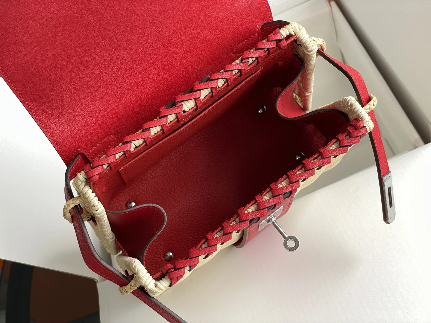 New Kelly Picnic Bag 20cm, Original Imported Swift Leather with Hand-Woven Wicker, [Bright Red] with Silver Hardware, Limited Edition, Synchronized with Boutique, Wax Thread Sewing, Pure Steel Hardware
