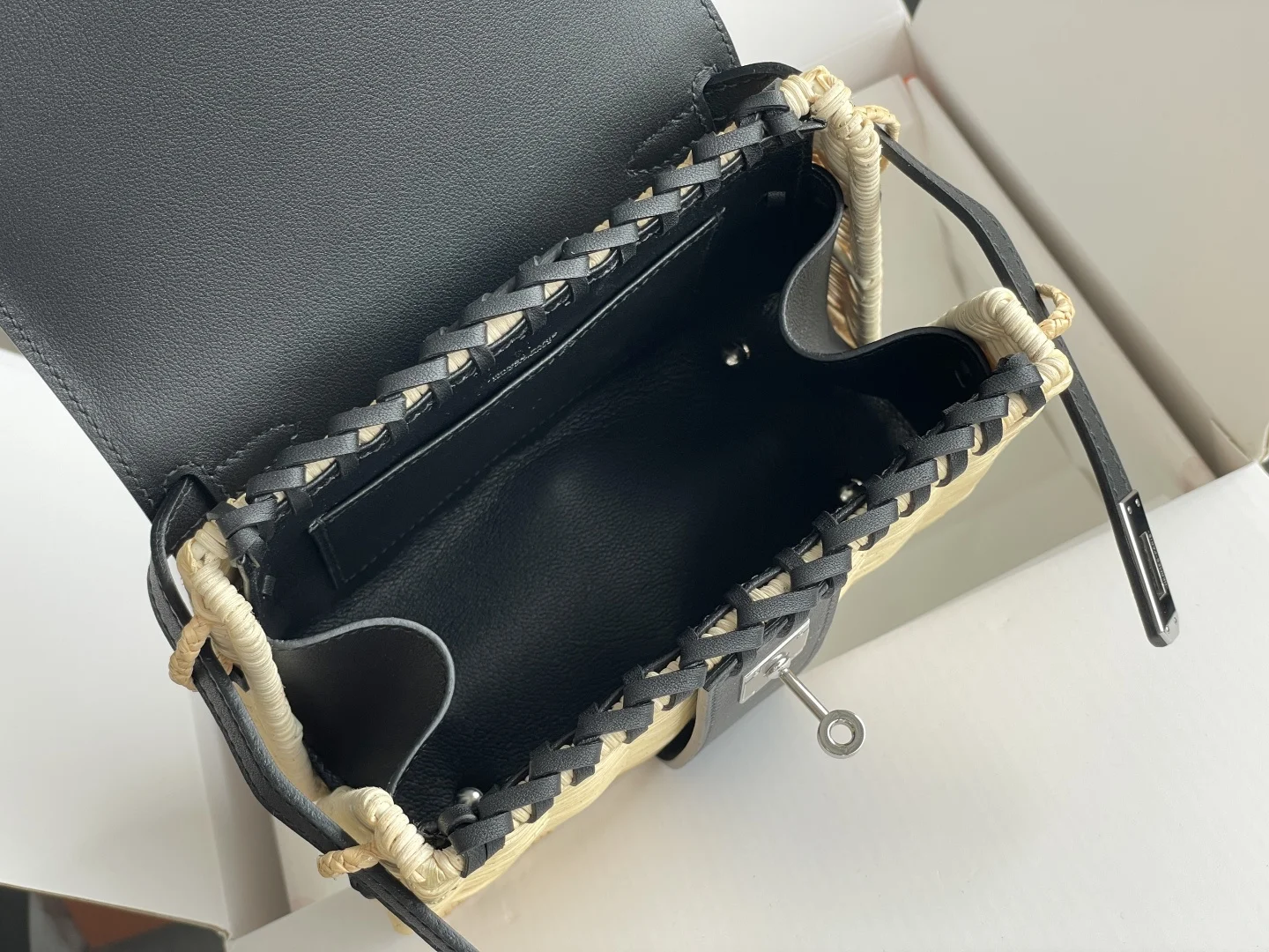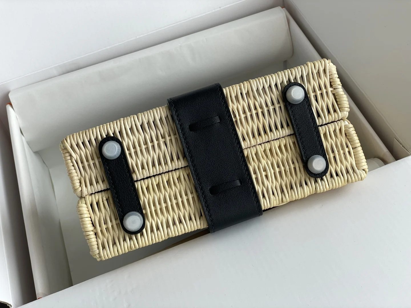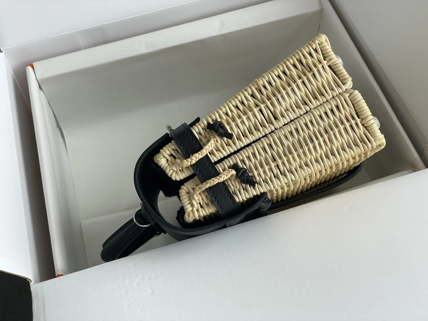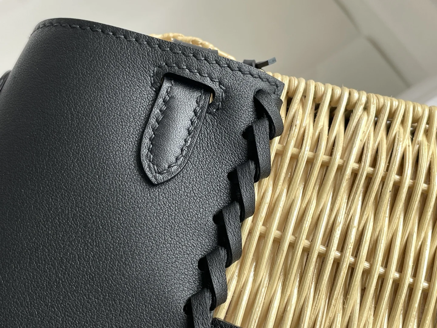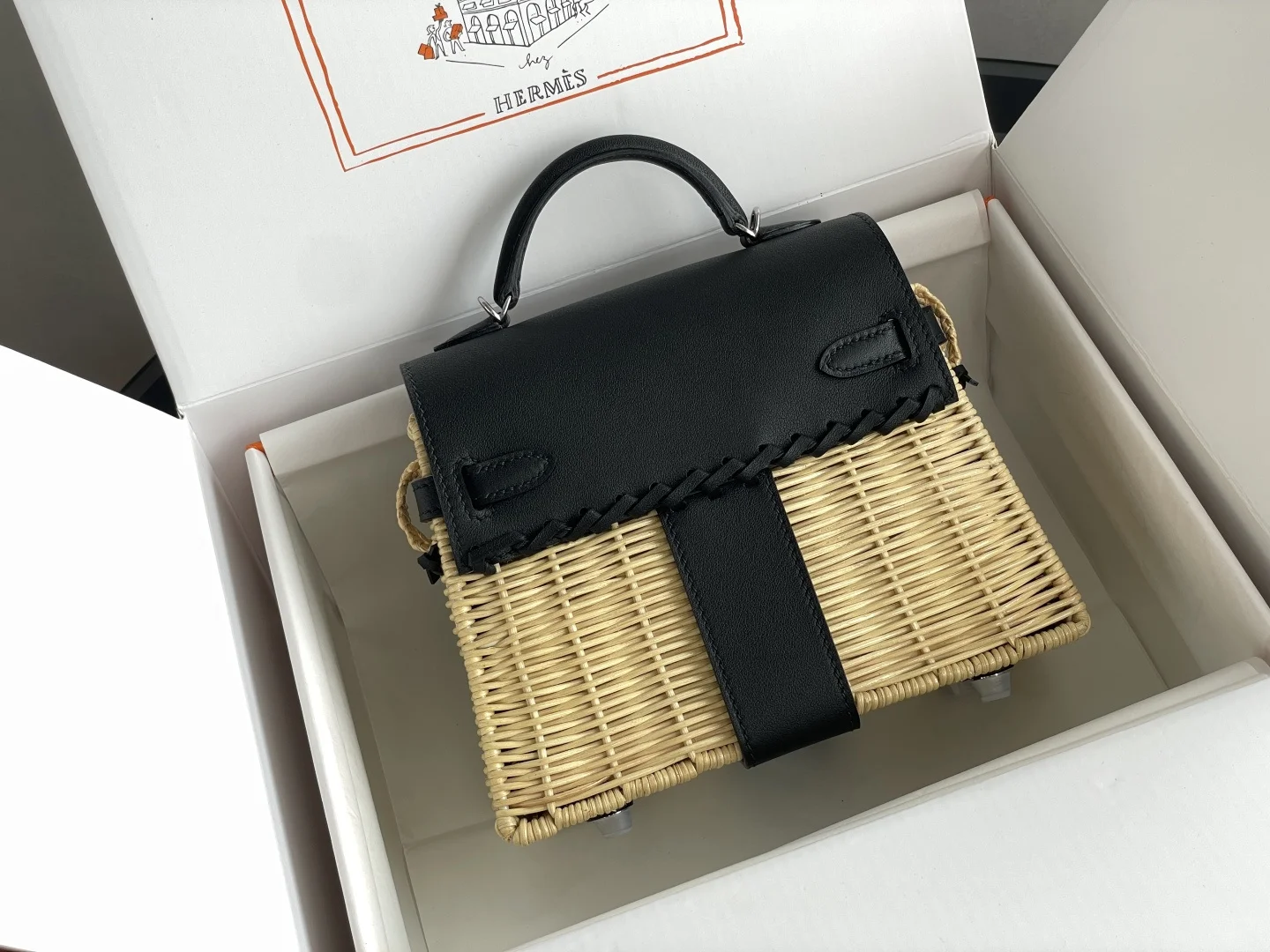 New Kelly Picnic Bag 20cm, Original Imported Swift Leather with Hand-Woven Wicker, [Black] with Silver Hardware, Limited Edition, Boutique Synchronization, Wax Thread Sewing, Pure Steel Hardware