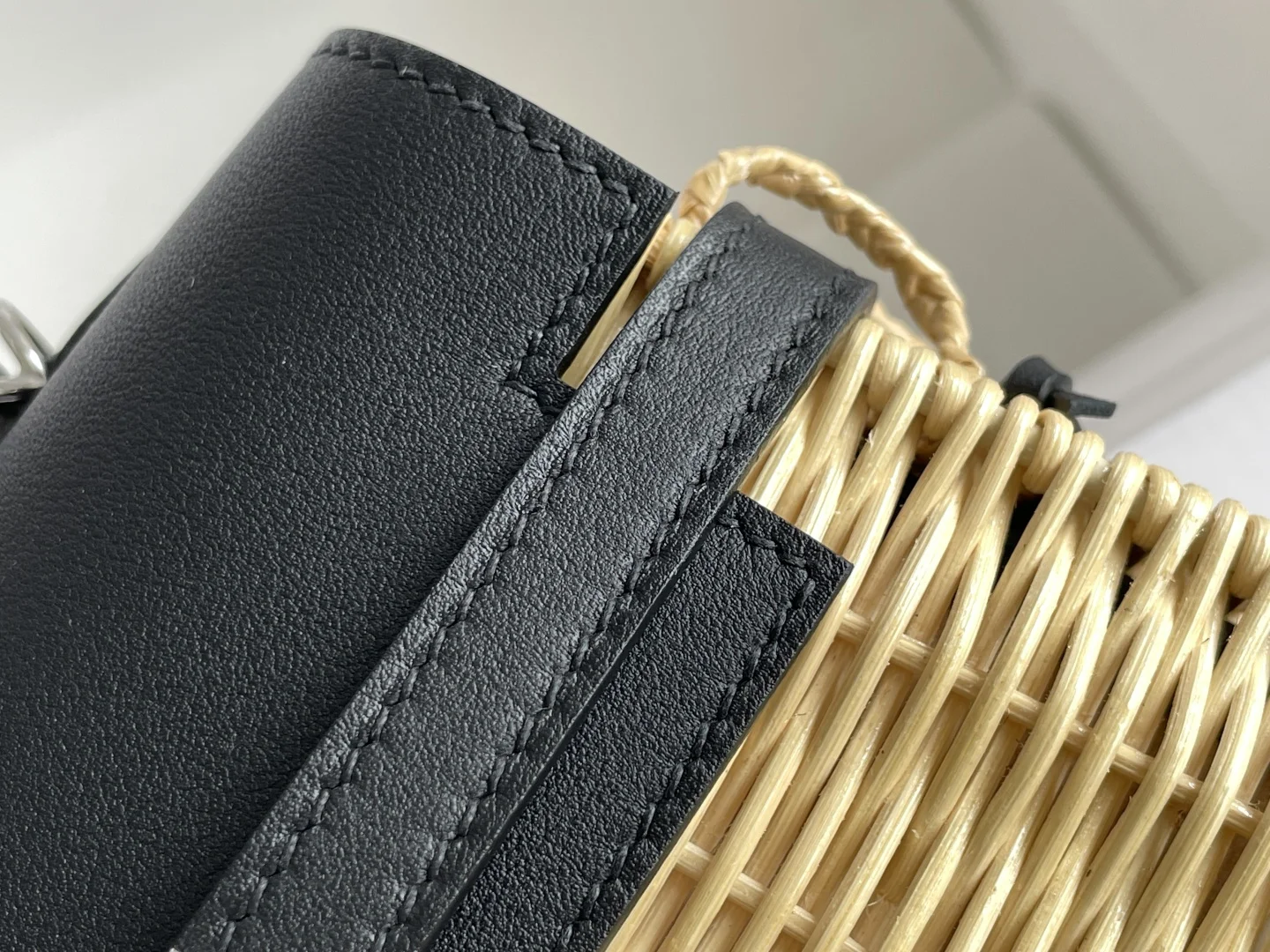 New Kelly Picnic Bag 20cm, Original Imported Swift Leather with Hand-Woven Wicker, [Black] with Silver Hardware, Limited Edition, Boutique Synchronization, Wax Thread Sewing, Pure..