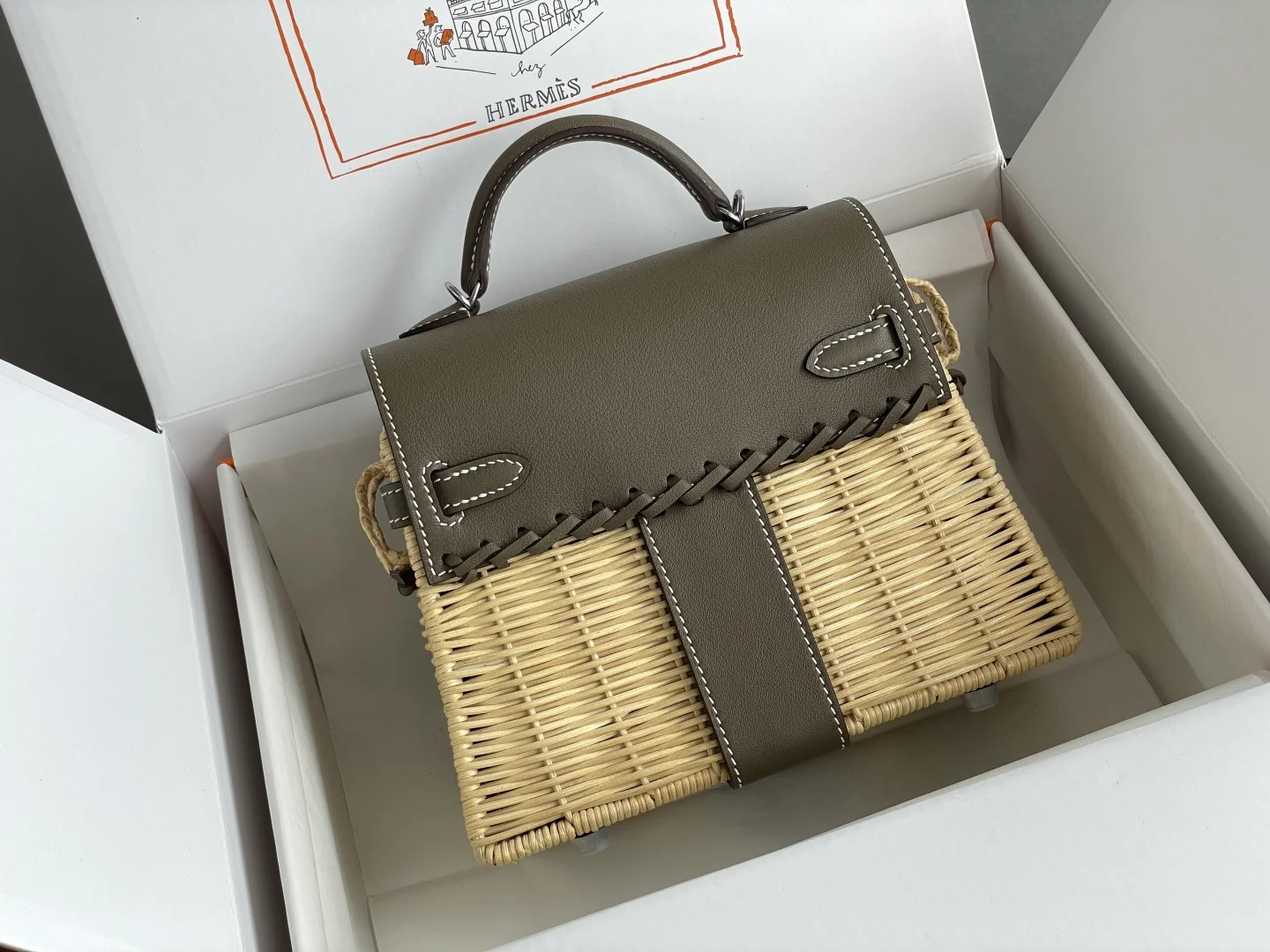 New Kelly Picnic Bag 20cm, Original Imported Swift Leather with Hand-Woven Wicker, Elephant Grey, Silver Hardware, Limited Edition, Boutique Synchronization, Wax Thread Stitching, ..