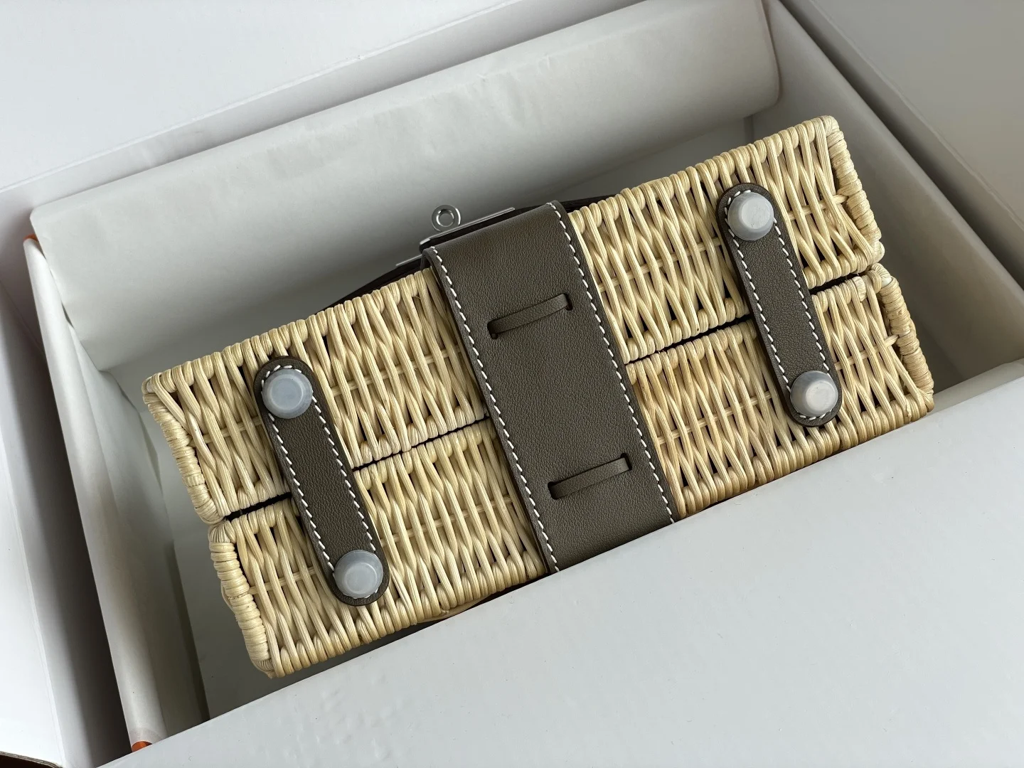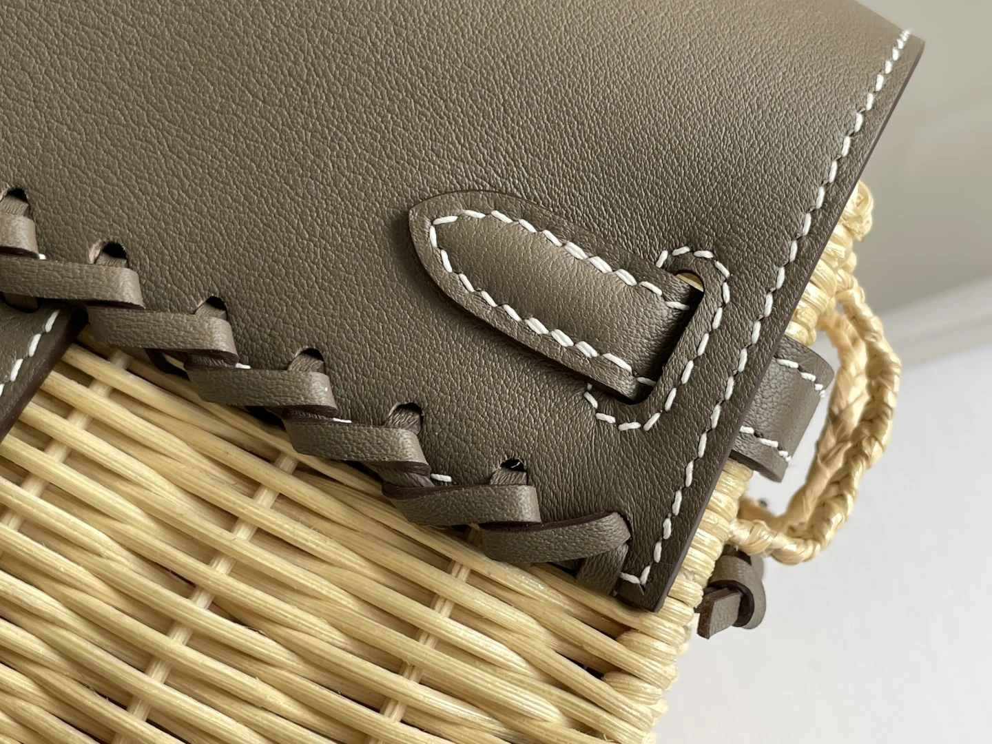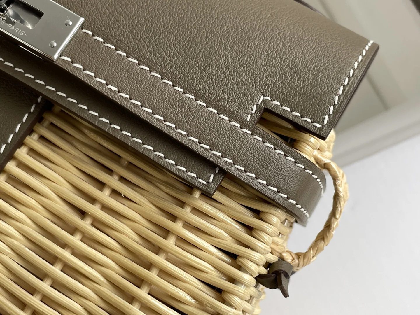 New Kelly Picnic Bag 20cm, Original Imported Swift Leather with Hand-Woven Wicker, Elephant Grey, Silver Hardware, Limited Edition, Boutique Synchronization, Wax Thread Stitching, Pure Steel Hardware