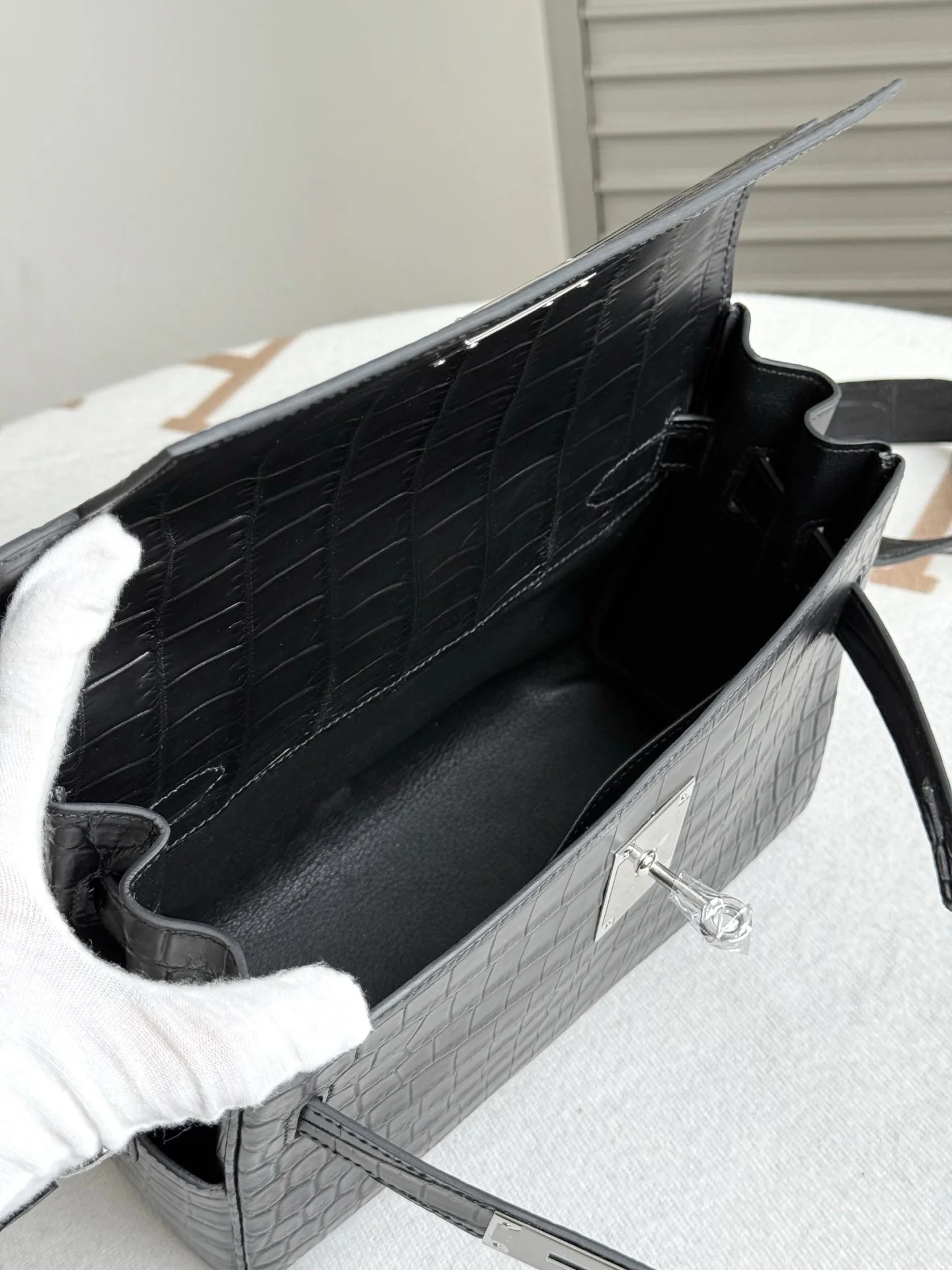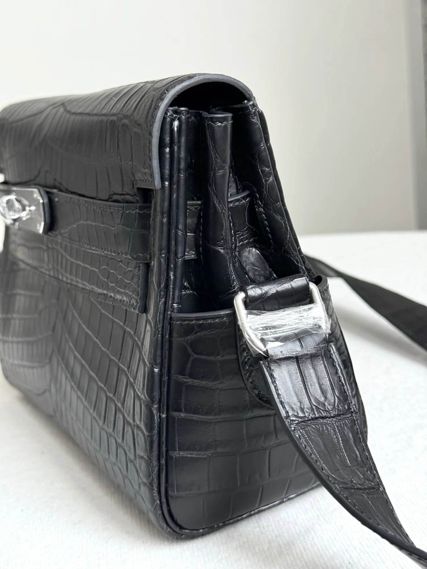 Imported Nile matte crocodile leather, Kelly Messenger Bag 25cm, cut from three pieces of belly skin. Lined with imported lambskin, full set of hand-hammered hardware, hand-stitched with waxed thread.