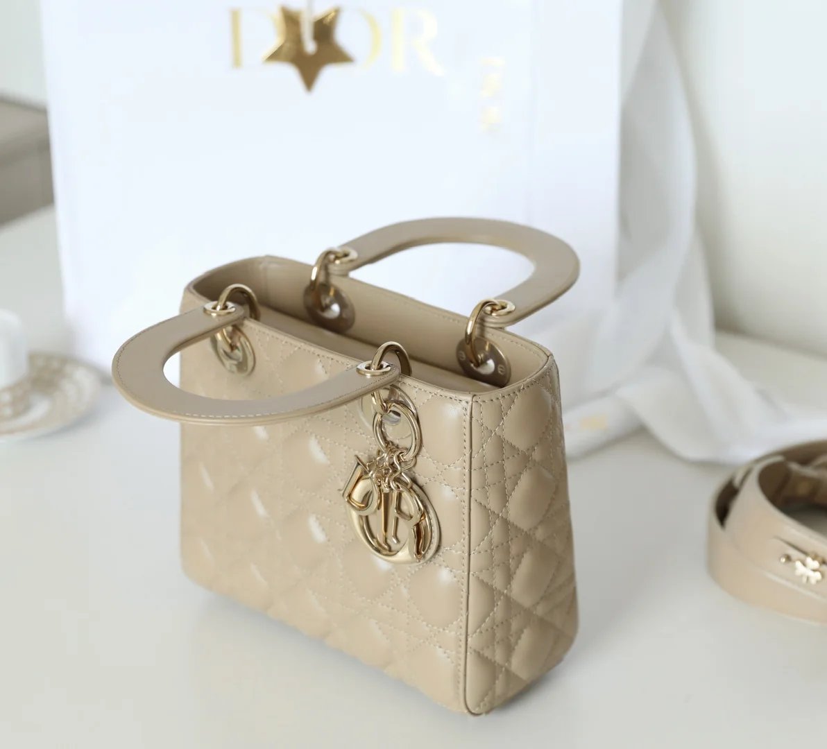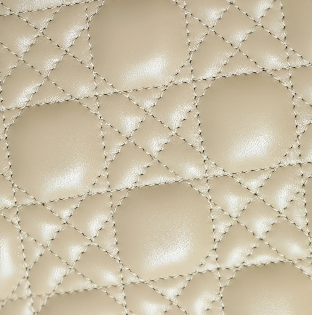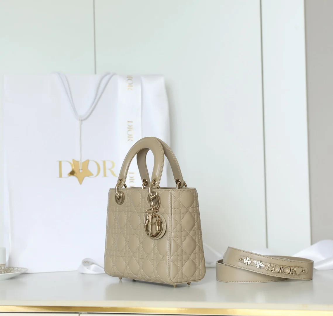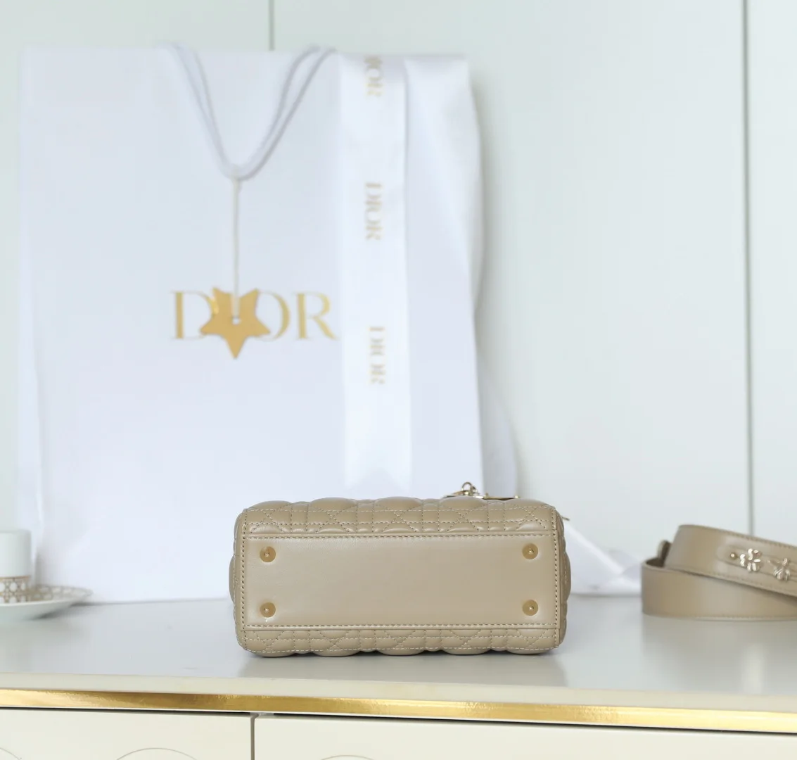 𝕃𝕒𝕕𝕪 20cm Gold Buckle DR-001 Handbag showcases the classic Dior logo. Combining an elegant demeanor with a fashionable modern style, it is a timeless classic. Meticulously crafted from khaki lambskin leather, it features a woven rattan pattern and exquisite quilting texture. Adorned with a metal-coated D.I.O.R. charm, it adds a touch of dynamism to the striking silhouette. The unique design includes a wide shoulder strap that can be embellished with badges to express individuality, allowing for hand carry, shoulder wear, or crossbody use. Dimensions: 20 x 16.5 x 8 cm.