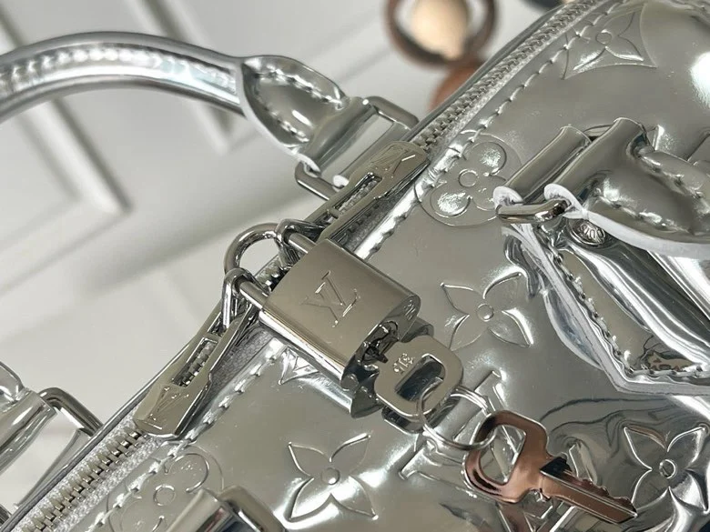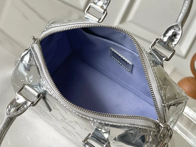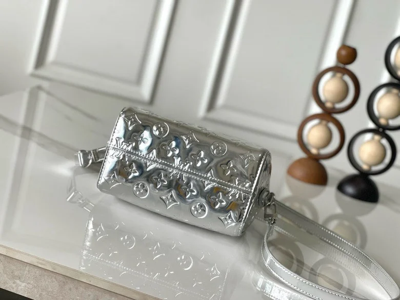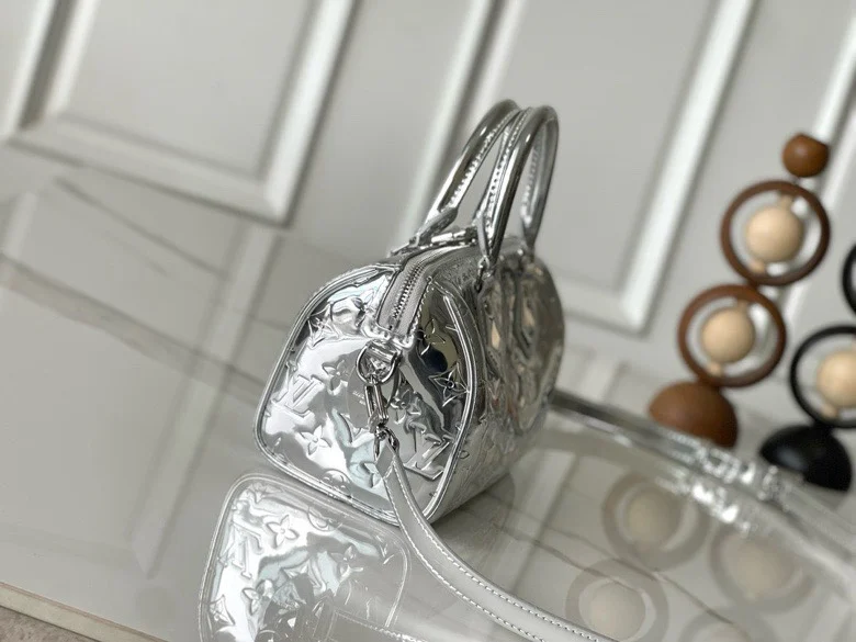 The M11987 Speedy Bandouliere 20 handbag from the LV Ski Collection features embossed coated canvas with smooth leather trim and shiny hardware, showcasing a retro-futuristic aesthetic with a new Monogram Miroir effect. The removable and adjustable leather strap offers versatile carrying options, and the compact design can accommodate everyday essentials such as a long wallet. Dimensions: 20.5x13.5x12