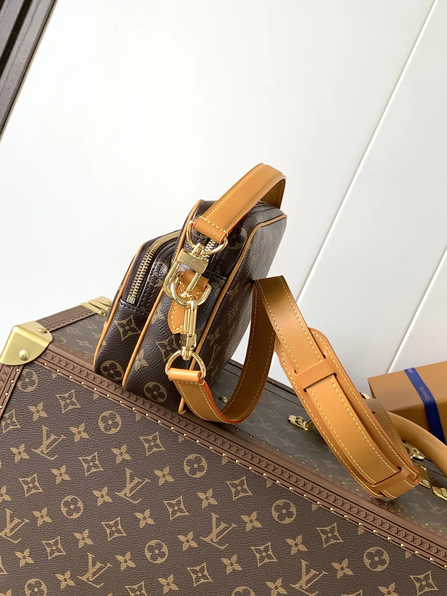 Model: M14016 old flower nil handbag, fashionable and compact, belongs to the monogram archive series, made of monogram coated canvas with leather trim. The handbag combines vintage details with modern elegance, featuring reinforced corners and paired with the recently launched pearl zipper by Pharrell Williams. The detachable handle and strap offer flexibility and portability. 25.0 x 17.5 x 11.0 cm (L x H x W)