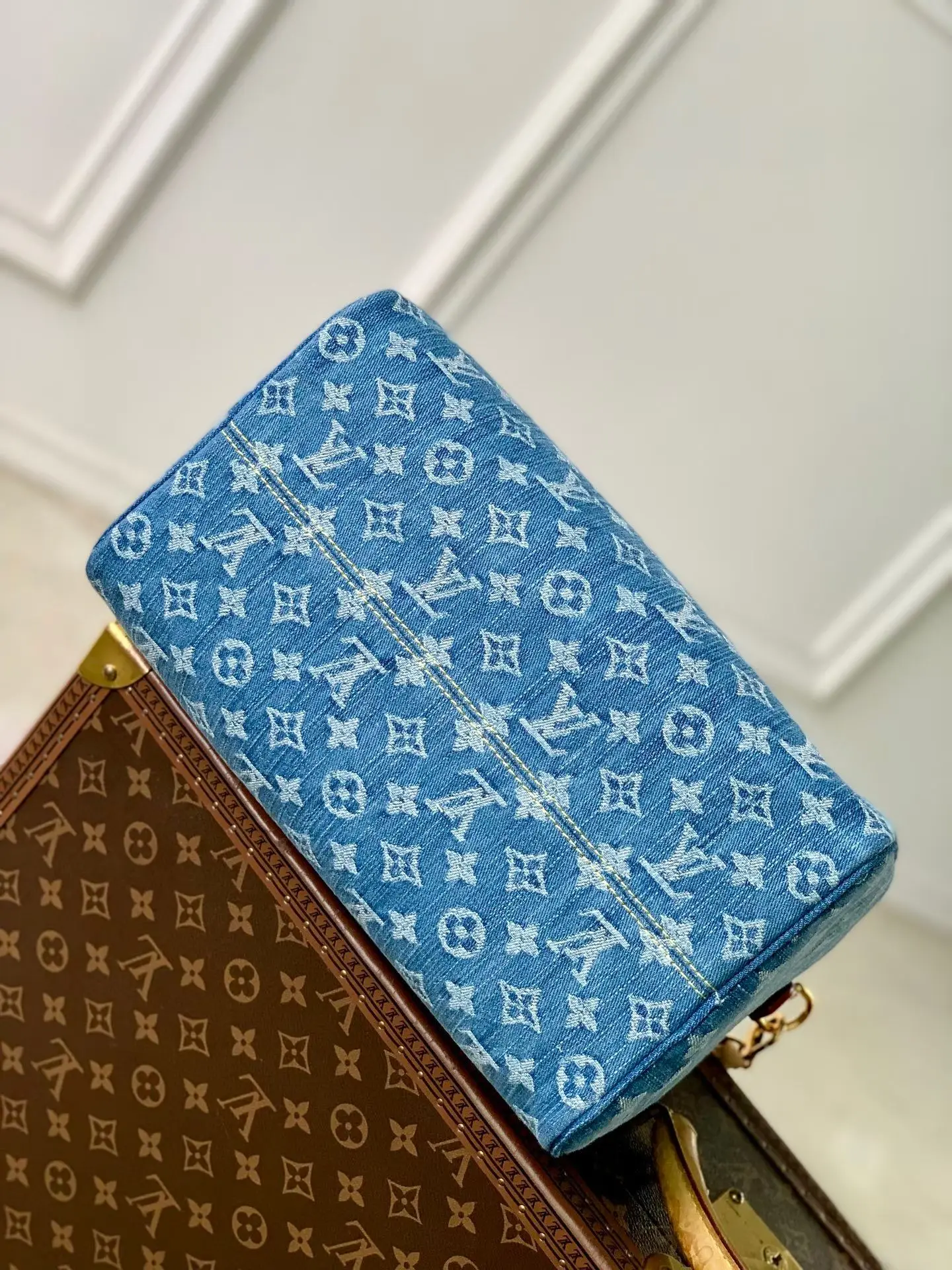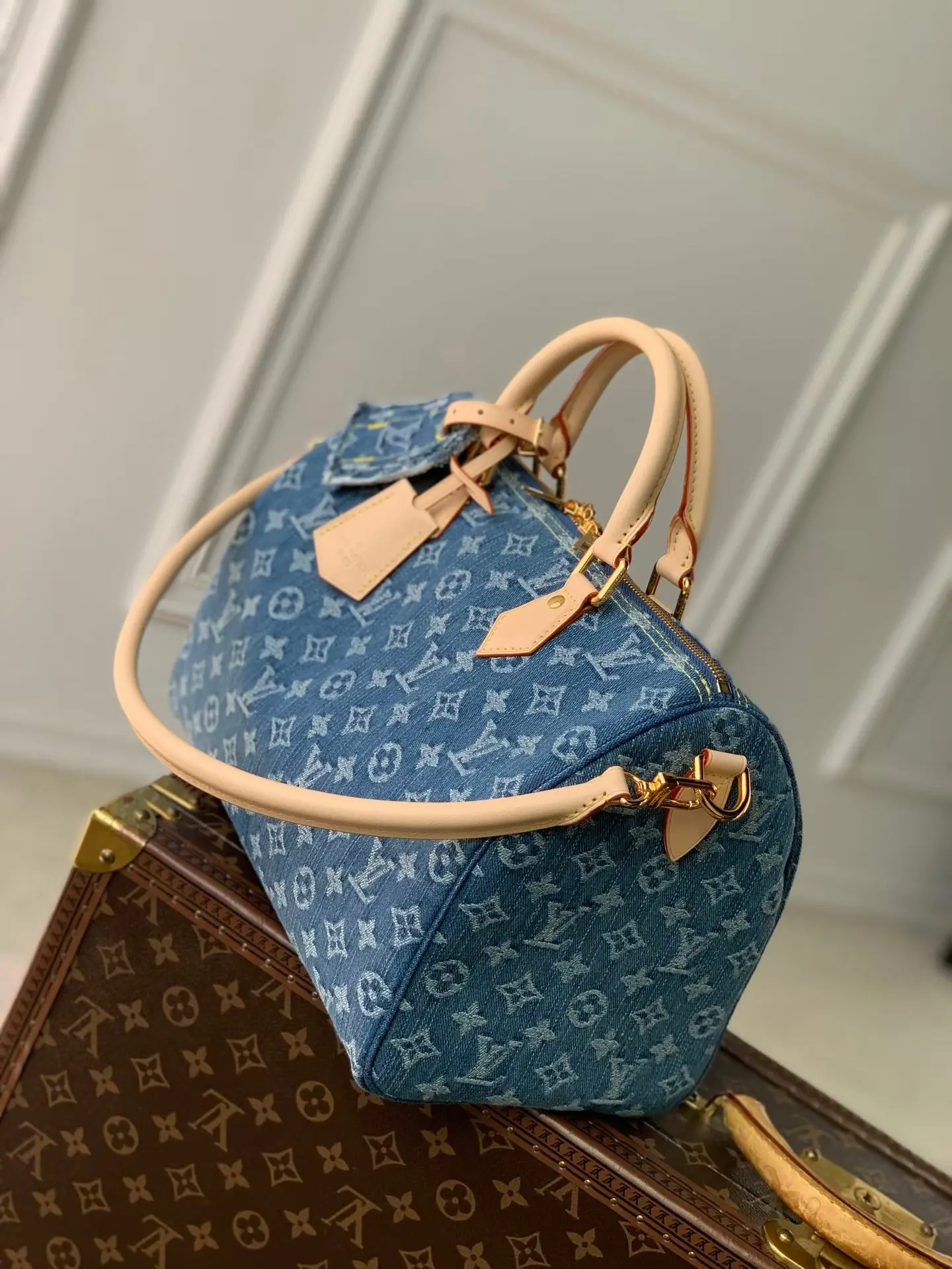 M14430 Denim This product is crafted from denim fabric, reinterpreting the Speedy Soft 30 handbag, infusing modern elegance into a classic design. The bag is adorned with the brand s iconic Monogram pattern, complemented by contrasting leather handles, a detachable shoulder strap, and a decorative key pouch embossed with the Louis Vuitton logo. Ample space allows for easy storage of daily essentials, as well as accommodating a tablet and books, making it perfect for weekend outings or daily commutes.