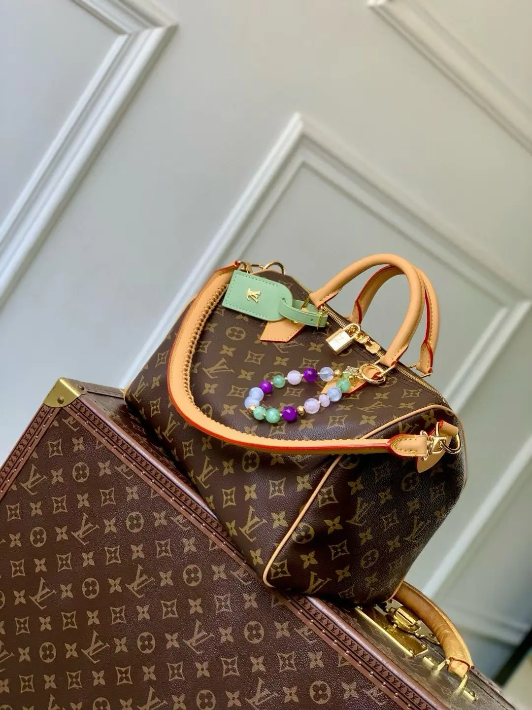 M15107 Monogram This Speedy Soft 30 Lucky handbag features Monogram canvas with VVN leather trim, complemented by detachable jewelry-like decorations, contrasting lining, and metallic details that highlight exquisite craftsmanship. The spacious design easily accommodates a tablet and daily essentials. Size: 30x21x17cm