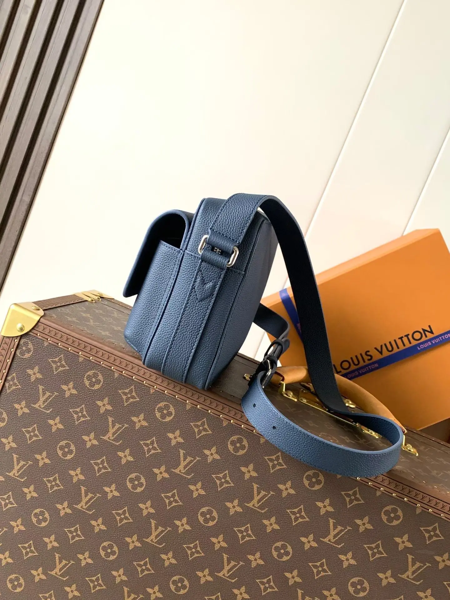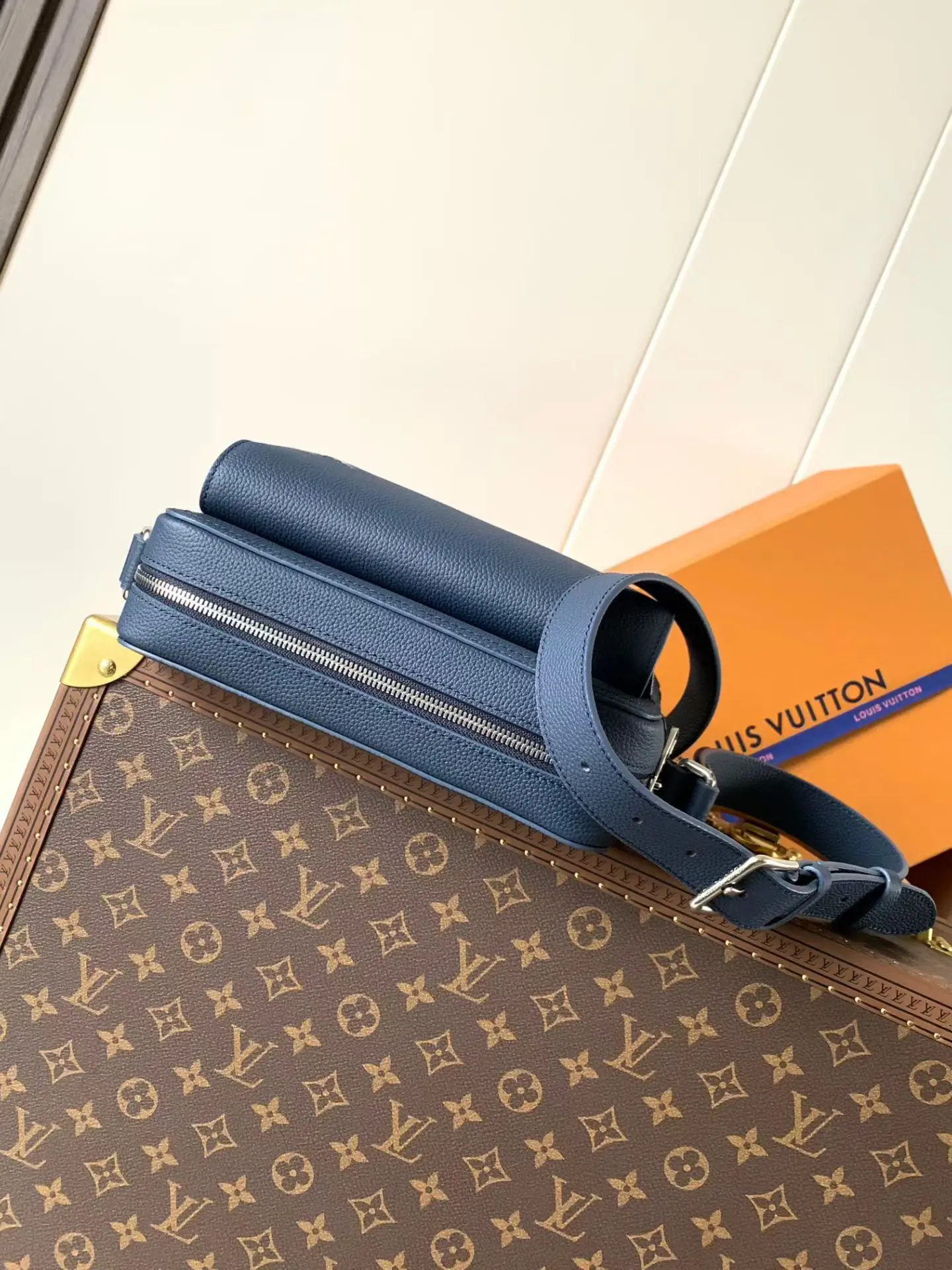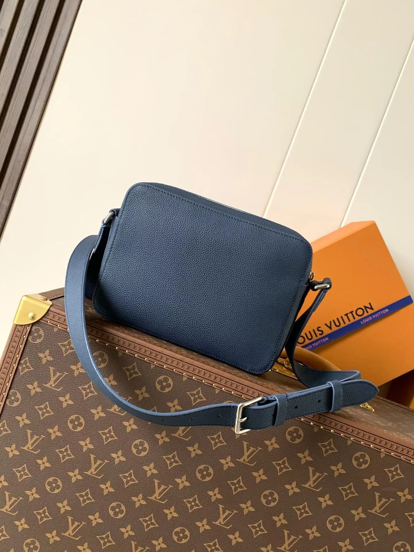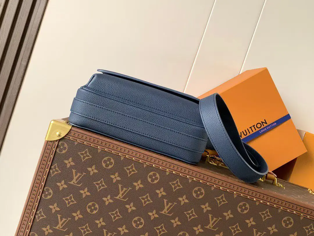 M15260 Navy Blue Top Quality Original Change Code Chip 163C BOARDING Messenger Bag. The Boarding Messenger Bag is made from lightweight and durable waxed cowhide leather, featuring a compact design with internal and external pockets for convenient storage of an 8.3-inch tablet. The adjustable leather shoulder strap enhances comfort. Top Quality Original