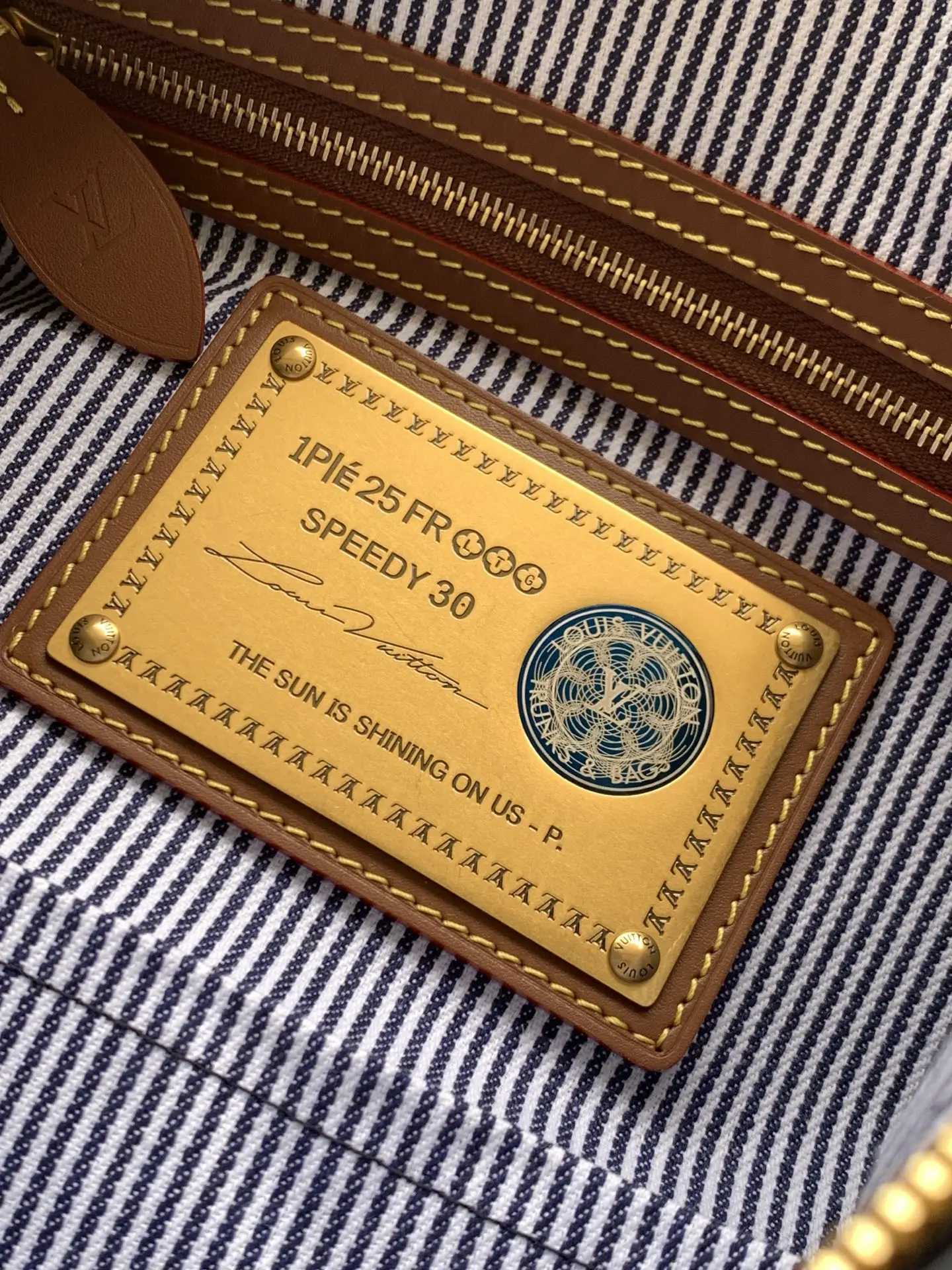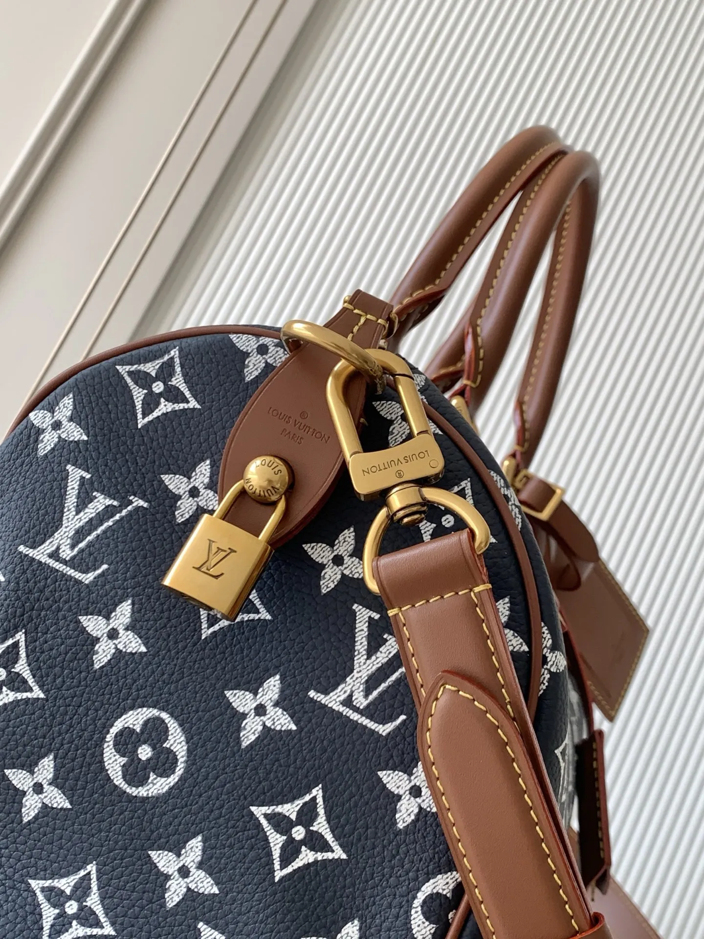 All-steel hardware MB163c01 variable code chip Model M15282 blue fabric lining This Speedy P9 Bandouliere 30 handbag features a Monogram pattern on fine calfskin, complemented by a striped fabric lining, a removable pouch, and multiple pockets. The handle fasteners are embossed with a lobster motif, and the side lock is laser-cut with the LV initials, exuding a luxurious aura. 32 x 22.5 x 18 cm (Length x Height x Width) Calfskin Calfskin trim Fabric lining Aged metal hardware Main compartment with padlock Inside patch pocket Zipped inside pocket Removable pouch Name tag Key bell Strap: Removable, adjustable Strap drop: 46.0 cm Strap drop max: 60.0 cm Handle: Double handle