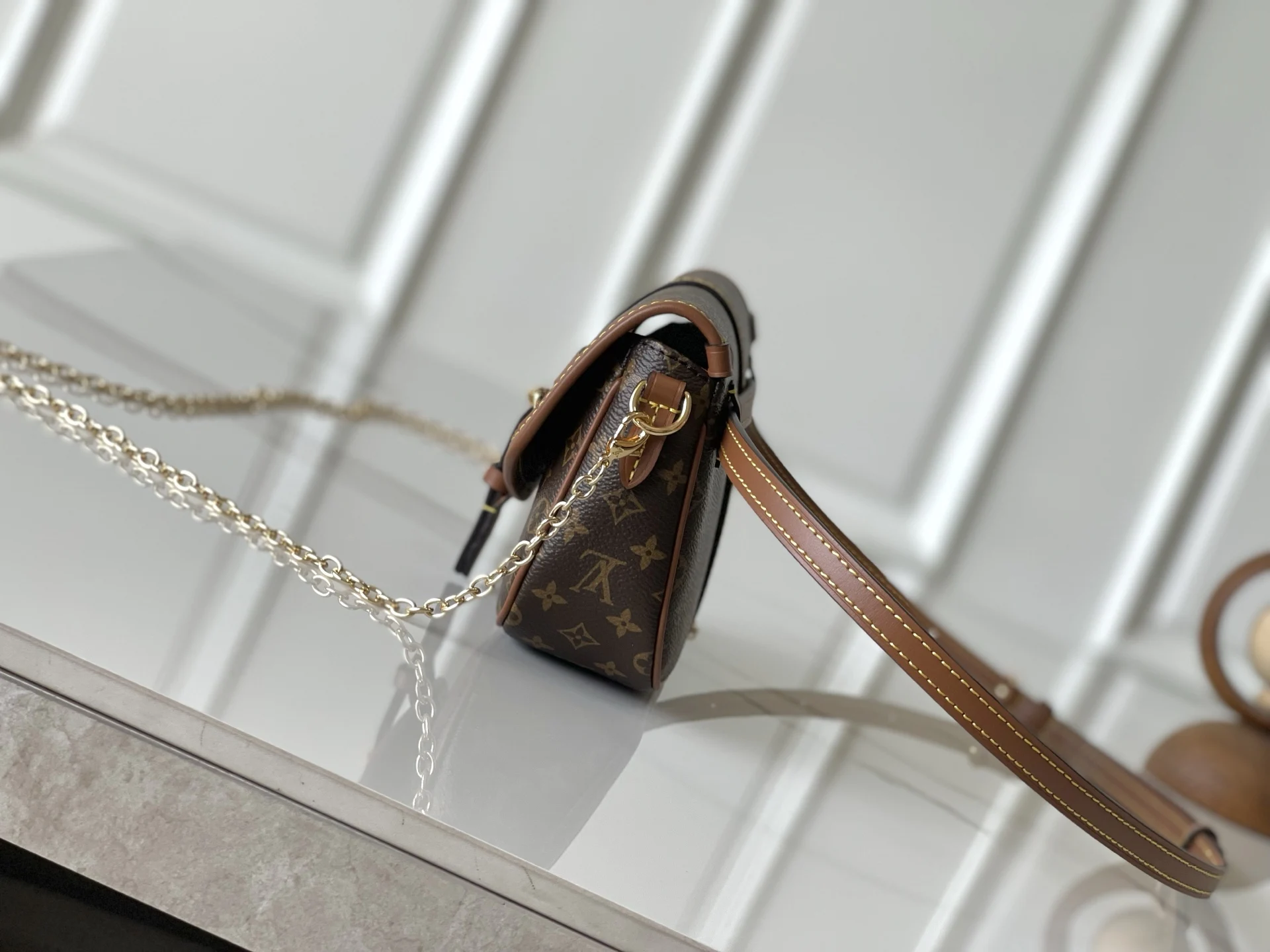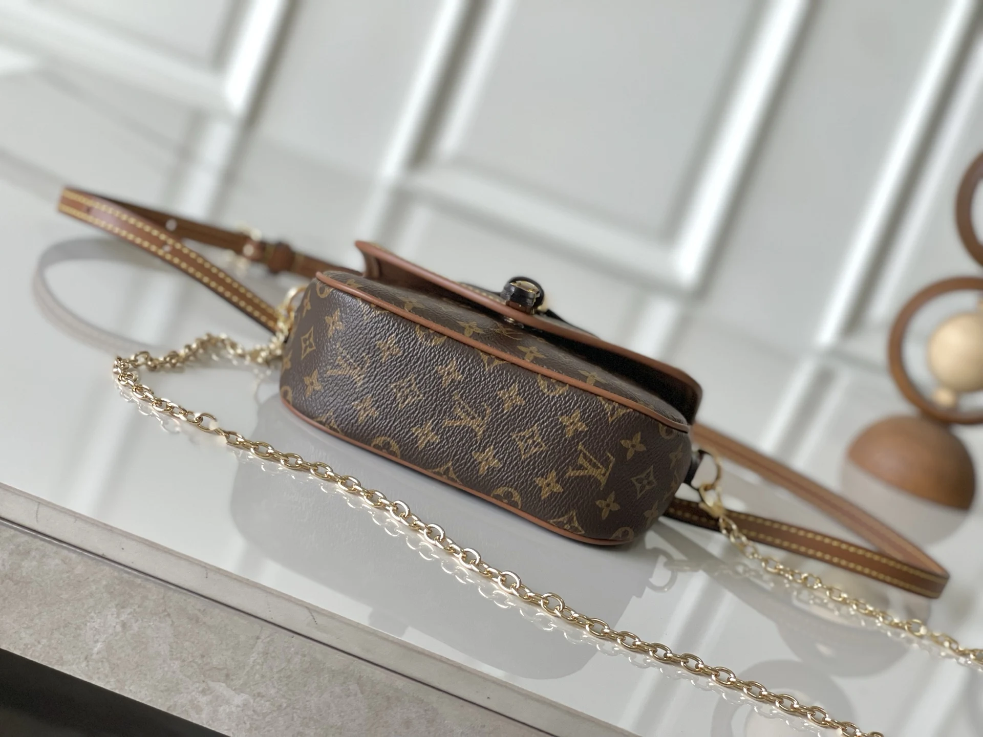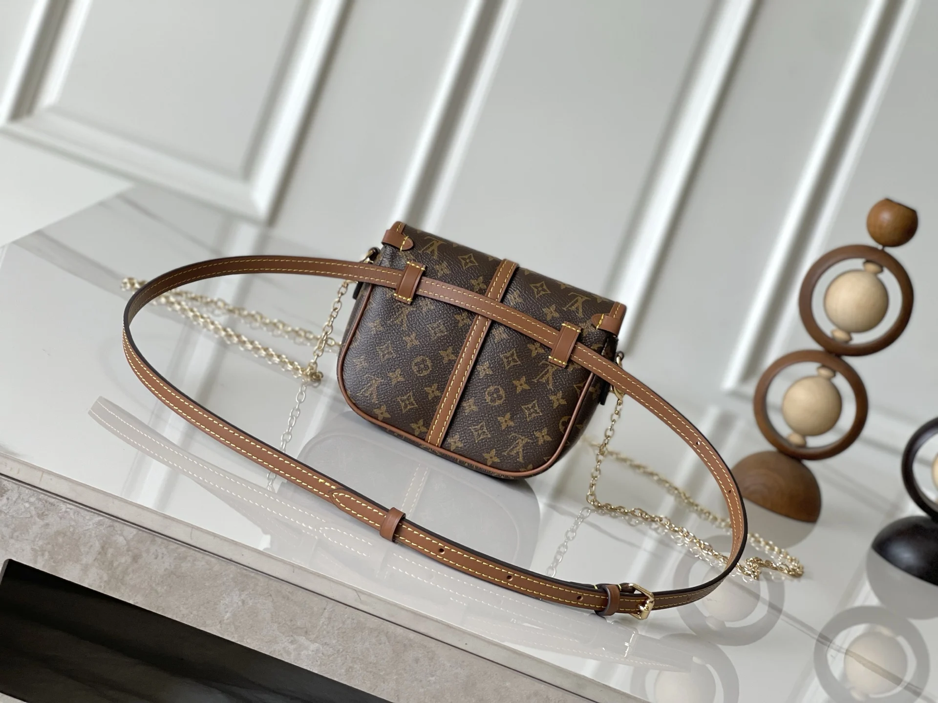 The M27096 Solo handbag combines Monogram canvas and smooth cowhide leather, accented with a contrasting lining and a detachable metal chain, adding a trendy option to accessories...