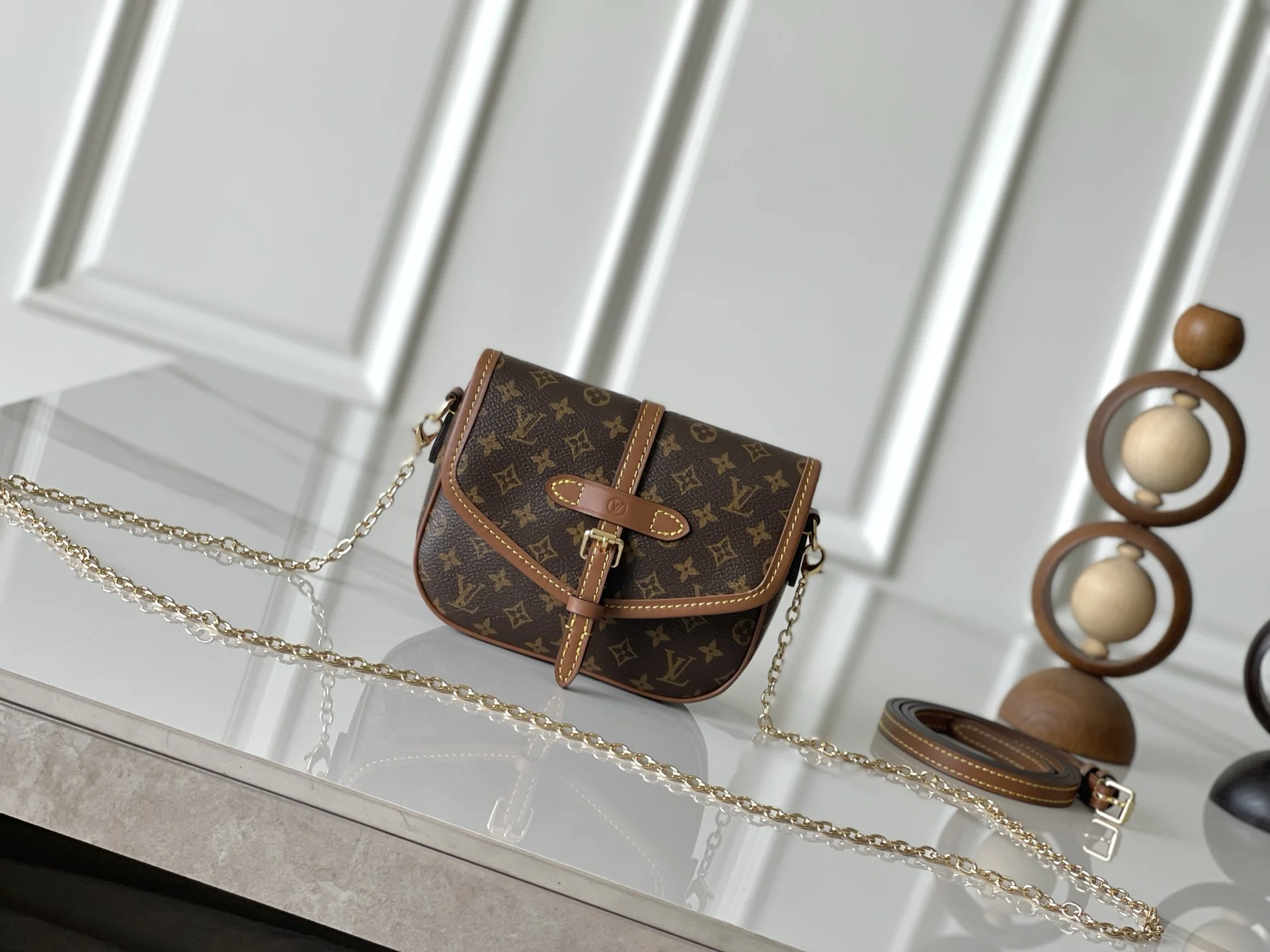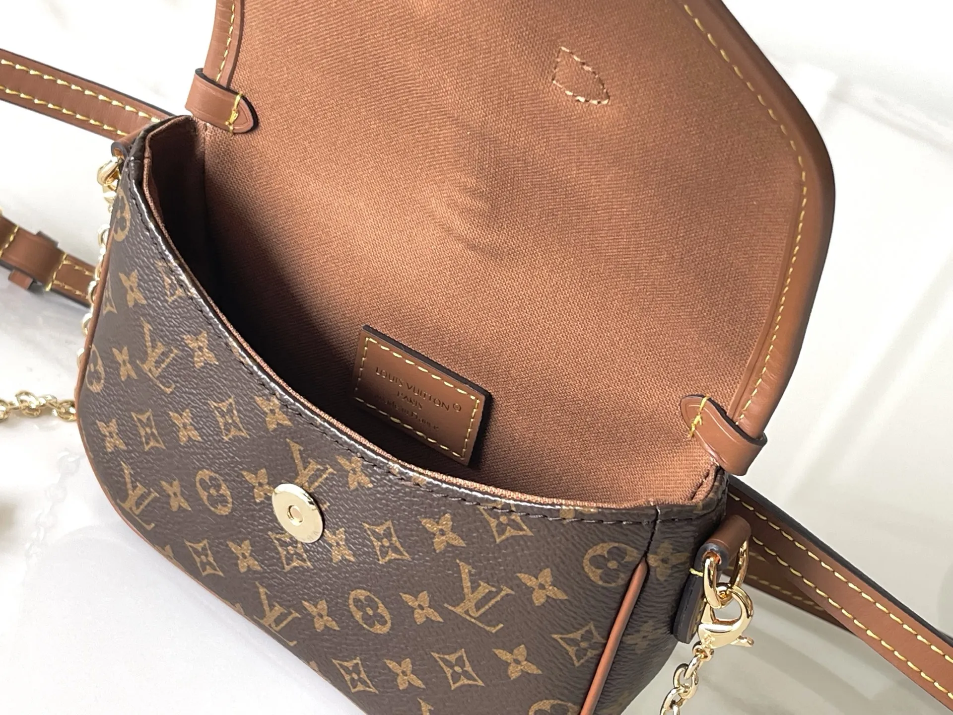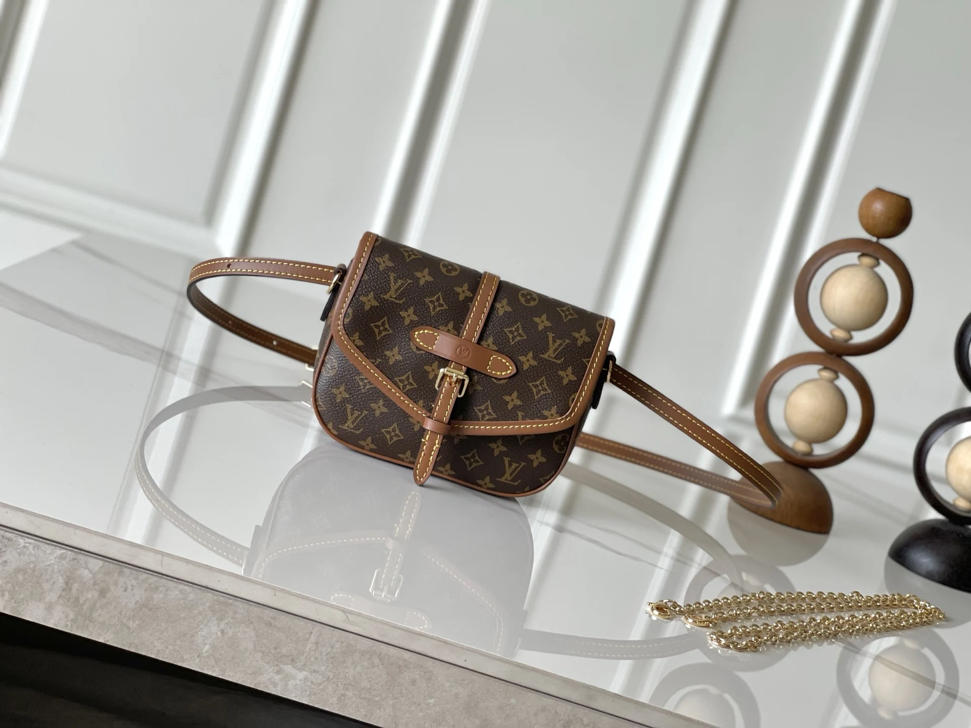 The M27096 Solo handbag combines Monogram canvas and smooth cowhide leather, accented with a contrasting lining and a detachable metal chain, adding a trendy option to accessories...