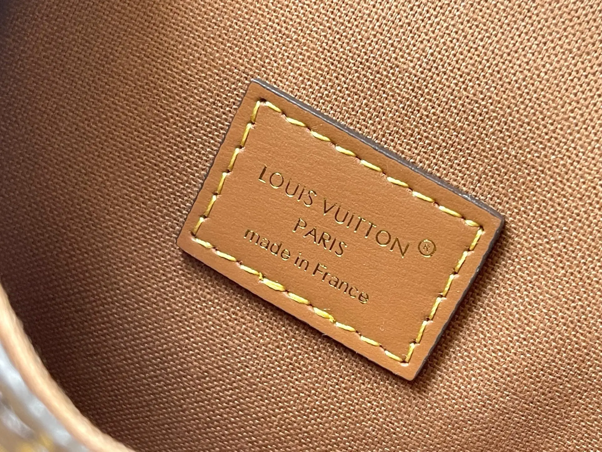The M27096 Solo handbag combines Monogram canvas and smooth cowhide leather, accented with a contrasting lining and a detachable metal chain, adding a trendy option to accessories. Its ideal size easily accommodates keys and change. The detachable wide strap allows for shoulder, cross-body, or waist carry. It can hold an iPhone 15 Pro Max. Dimensions: 15.7 x 11.6 x 4.0 cm