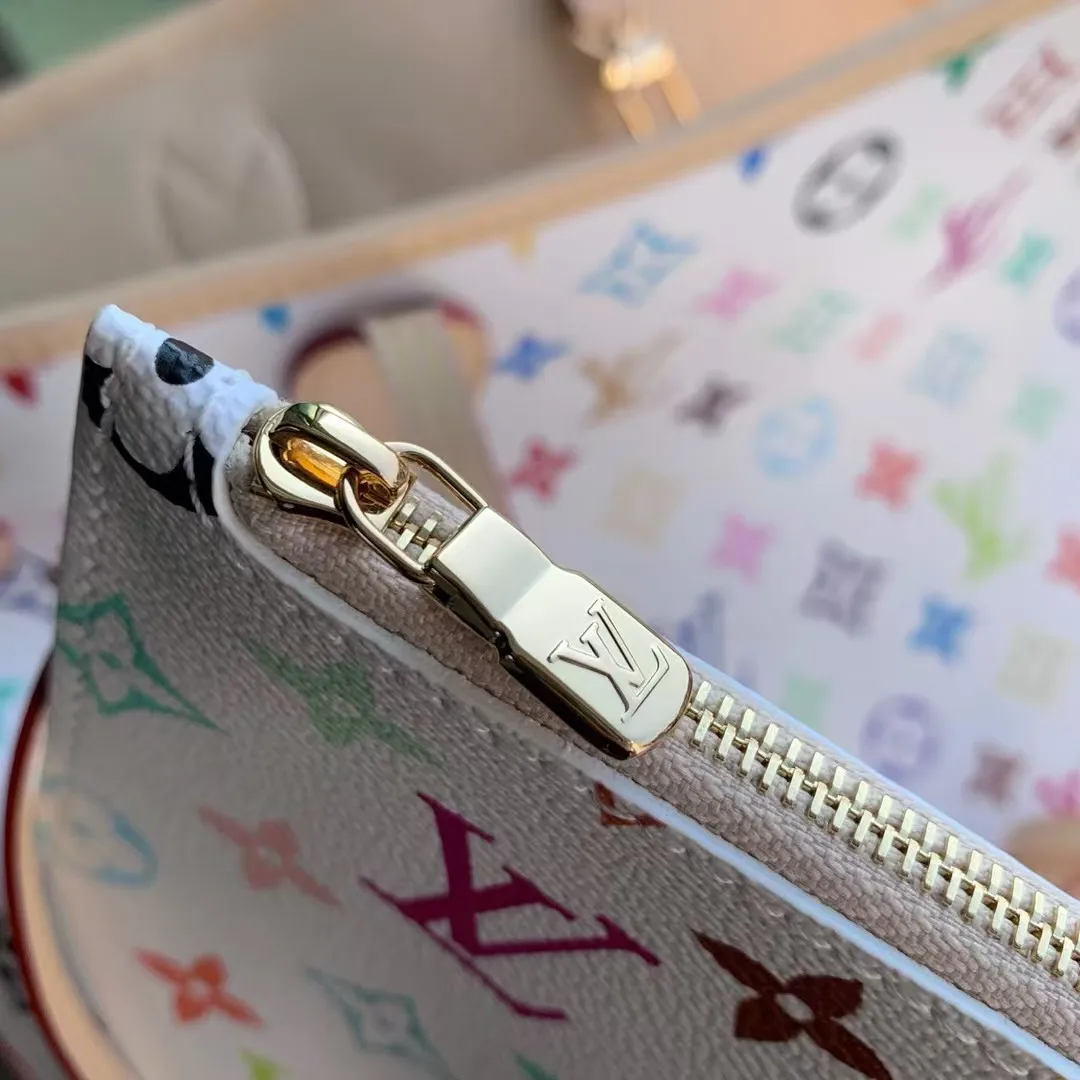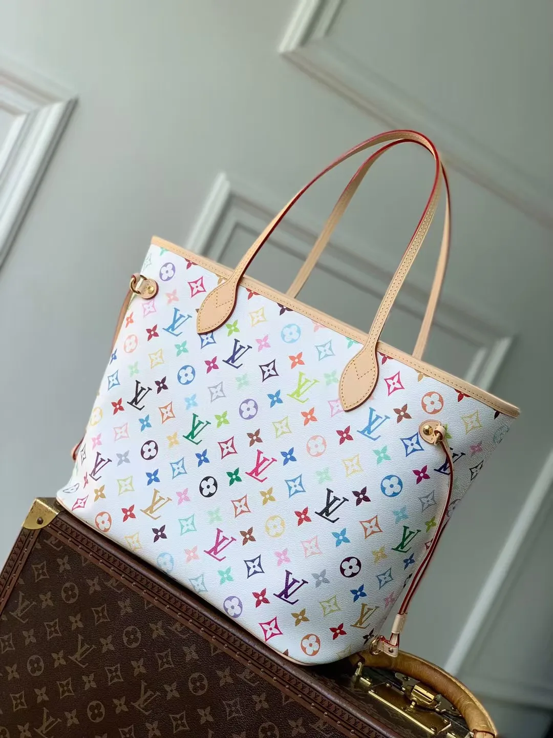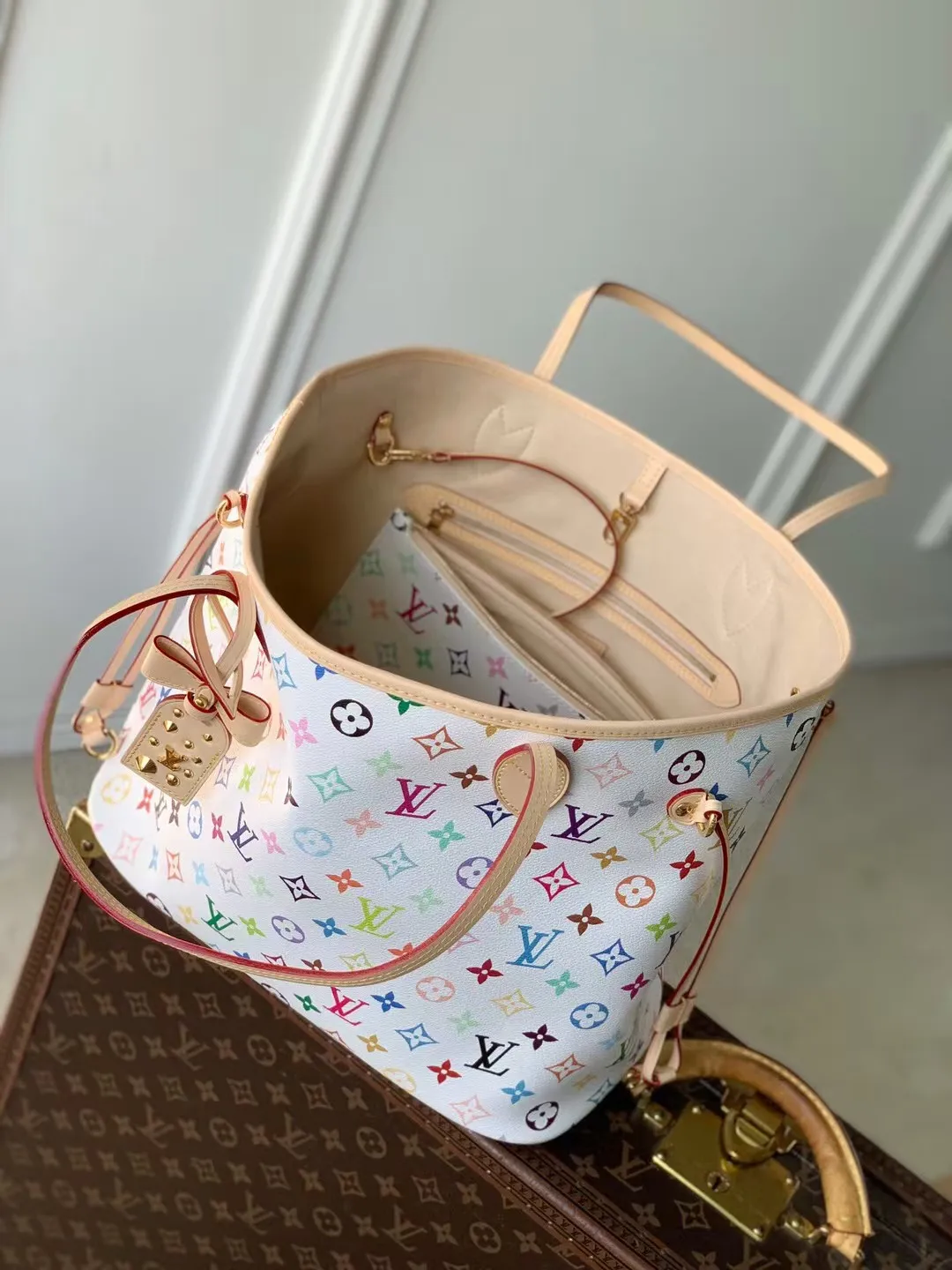 M27787 White Colorful Murakami Medium Shopping Bag This Neverfull MM handbag is part of the Louis Vuitton x Takashi Murakami reissue collection, cleverly incorporating the vibrant colors of the Japanese artist into the Monogram coated canvas. Particularly noteworthy is the detachable zippered pouch, which can be used as an exquisite clutch on its own or as an additional pocket. The cowhide leather trim outlines a close-fitting silhouette, with the brand s signature adorned with elegant bow details. Dimensions: 32 x 29 x 17 cm (L x H x W)