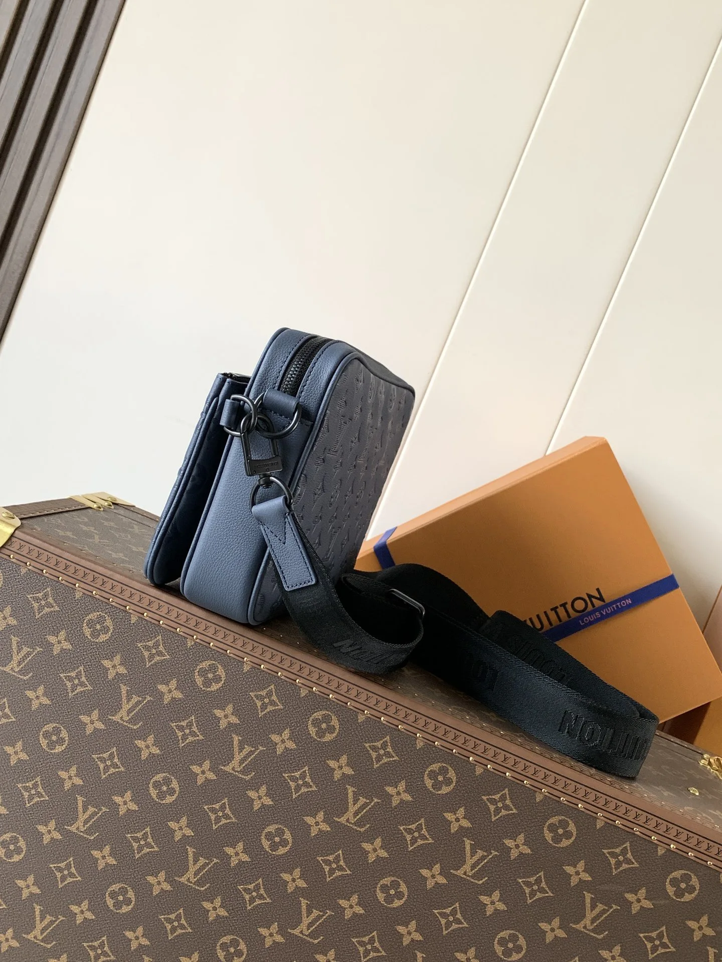 Top-level original, M27925 blue top-level 163C This Trio Messenger bag is made of soft Monogram Shadow leather, paired with Monogram Shadow leather straps and the main bag. The zippered front pocket, shoulder strap, and detachable coin purse are all removable. The shoulder strap is also adjustable to ensure comfortable and snug carrying.