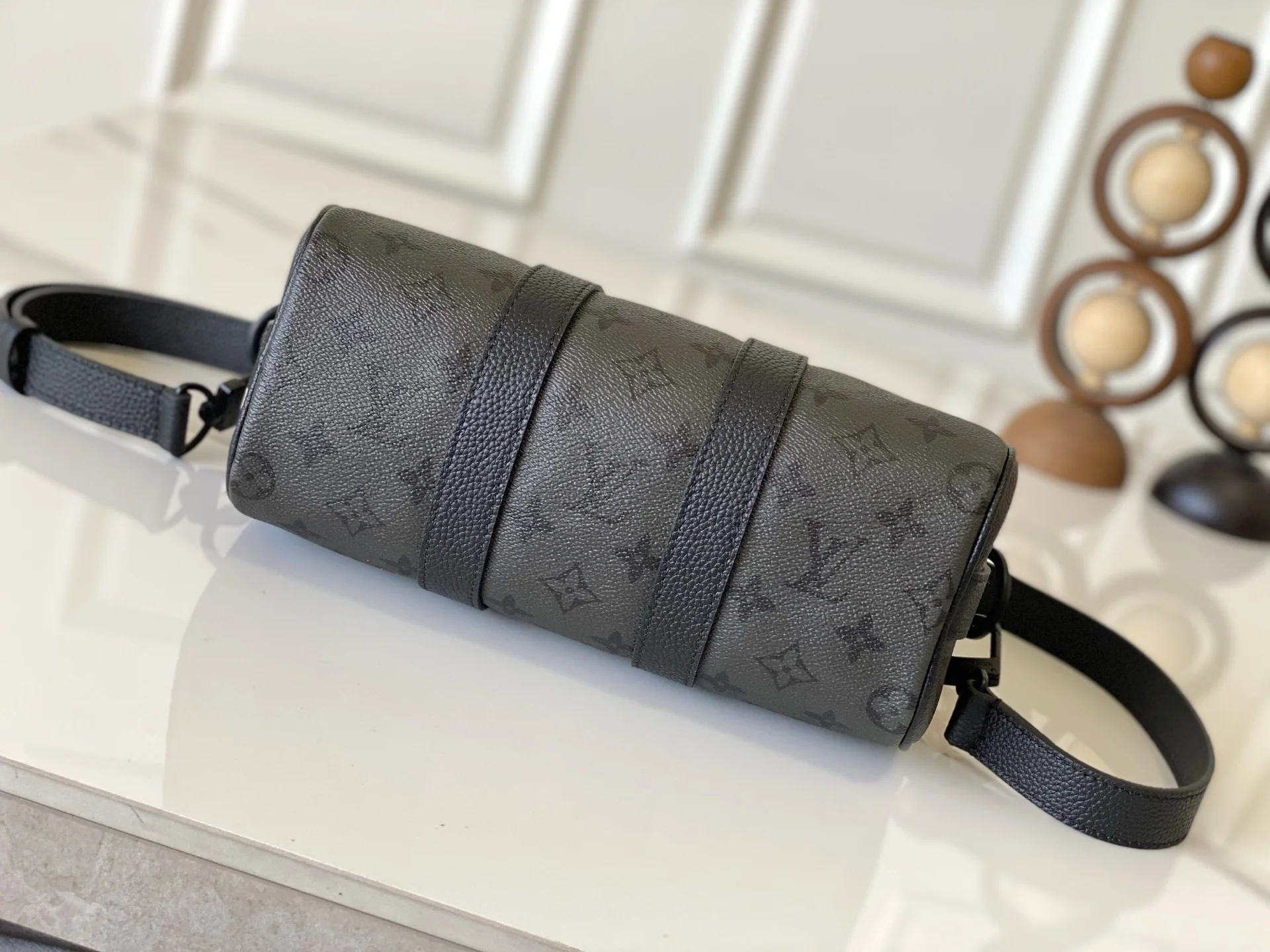 Exclusive real shots M28369 This Keepall Bandouliere 25 handbag features Monogram Midnight coated canvas adorned with deep Monogram prints, showcasing a confident style. The refined urban design is complemented by leather trim and matte zippers. The top handles and wide, detachable, and adjustable fabric shoulder strap allow for comfortable crossbody and hand carry. 15 x 11 x 25 cm (Height x Width x Length) Monogram Midnight coated canvas Cowhide-leather trim Textile lining Metal hardware Zipper closure Main compartment Inside flat pocket Strap: Removable and adjustable Strap drop: 55.0 cm Strap drop adjustable to: 63.0 cm Handle: Double handle