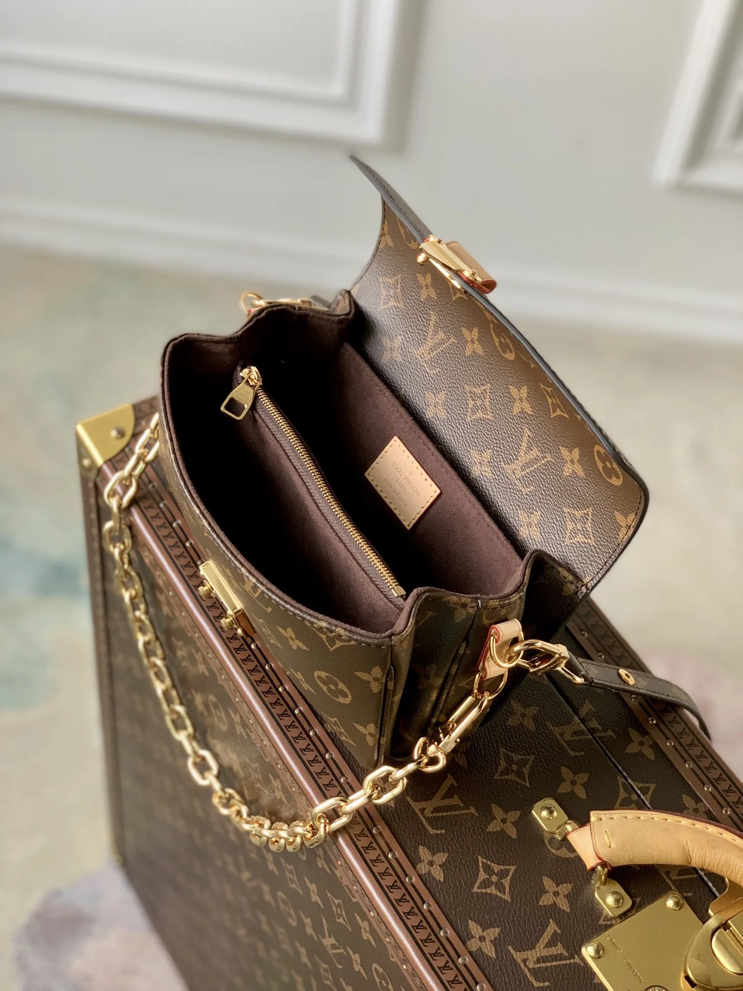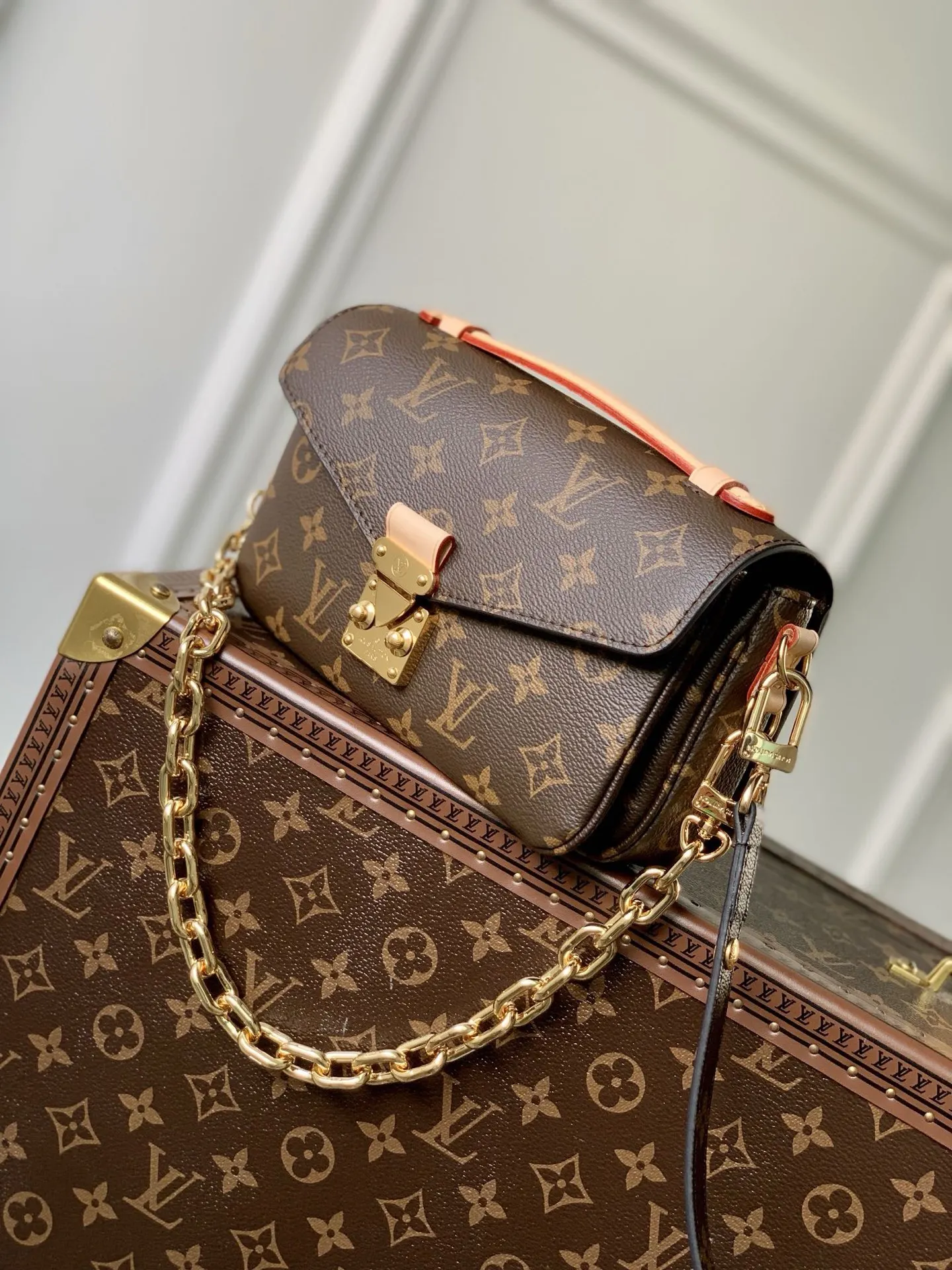 The top original LV messenger bag in small size, East West Metis handbag, features a stylish shoulder backpack design that is trendy. The compact bag is made of the brand s Monogram canvas, equipped with a chic S-lock clasp and a fashionable top handle, with a polished surface that shines brilliantly. It is multifunctional and spacious. The detachable long shoulder strap allows for shoulder or crossbody wear, making it a great companion for daily outings. M46279 dimensions are 21.5x6x13.5cm.