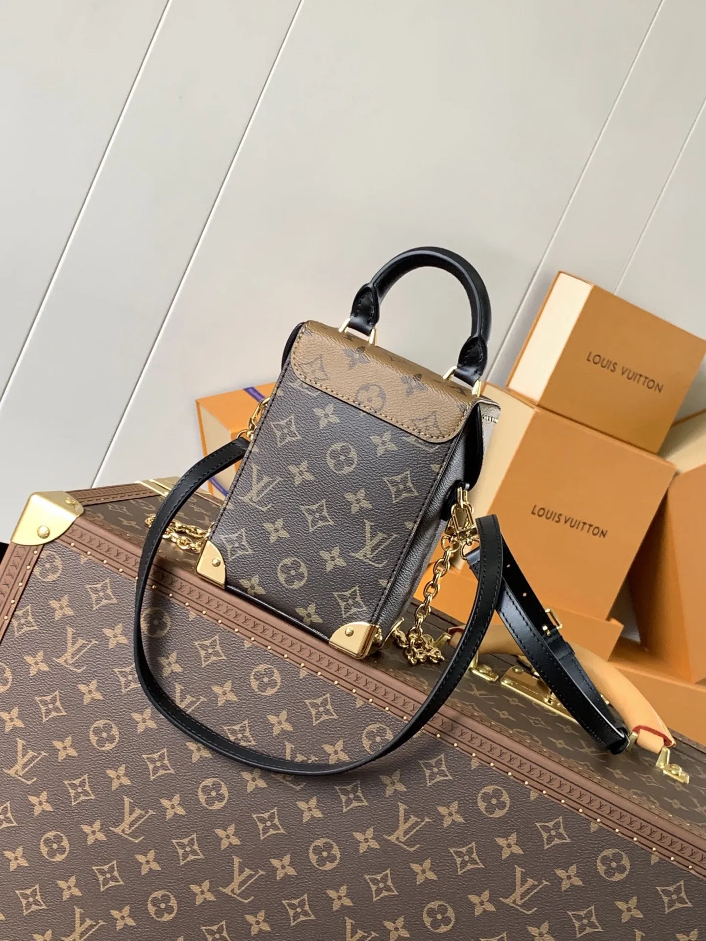Top original single, code chip M82465. This Camera Box handbag is crafted from Monogram and Monogram Reverse canvas, featuring a modern silhouette that incorporates iconic details from the Petite Malle handbag, such as the S-lock clasp, metal corners, and studs. The slender chain highlights a feminine style, while the top handle adds a comfortable carrying option. Dimensions: 12.5 x 17.6 x 6.0 cm (L x H x W)