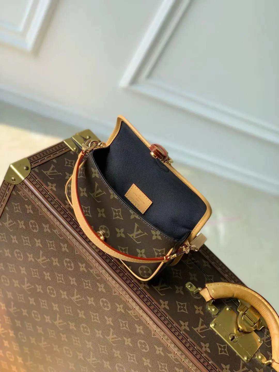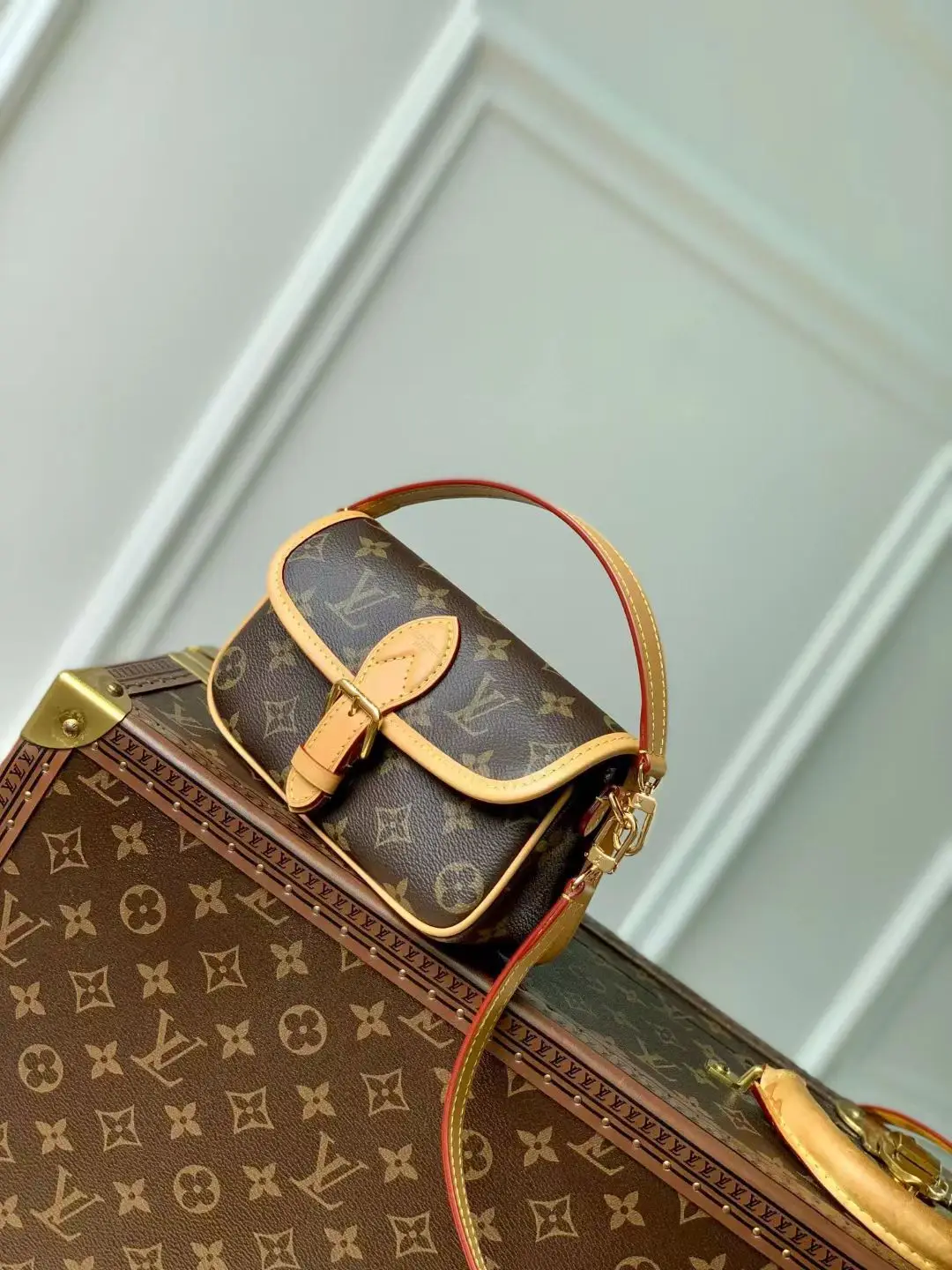 This Nano Diane features a Monogram canvas body integrated with leather corners and vintage elements such as traditional fasteners, recreating prototype details like the rounded flap and belt-style closure. The ample space can accommodate a phone and daily essentials, while the detachable handle and adjustable shoulder strap allow for flexible carrying, suitable for both day and night occasions. Size: 19x10.5x6cm