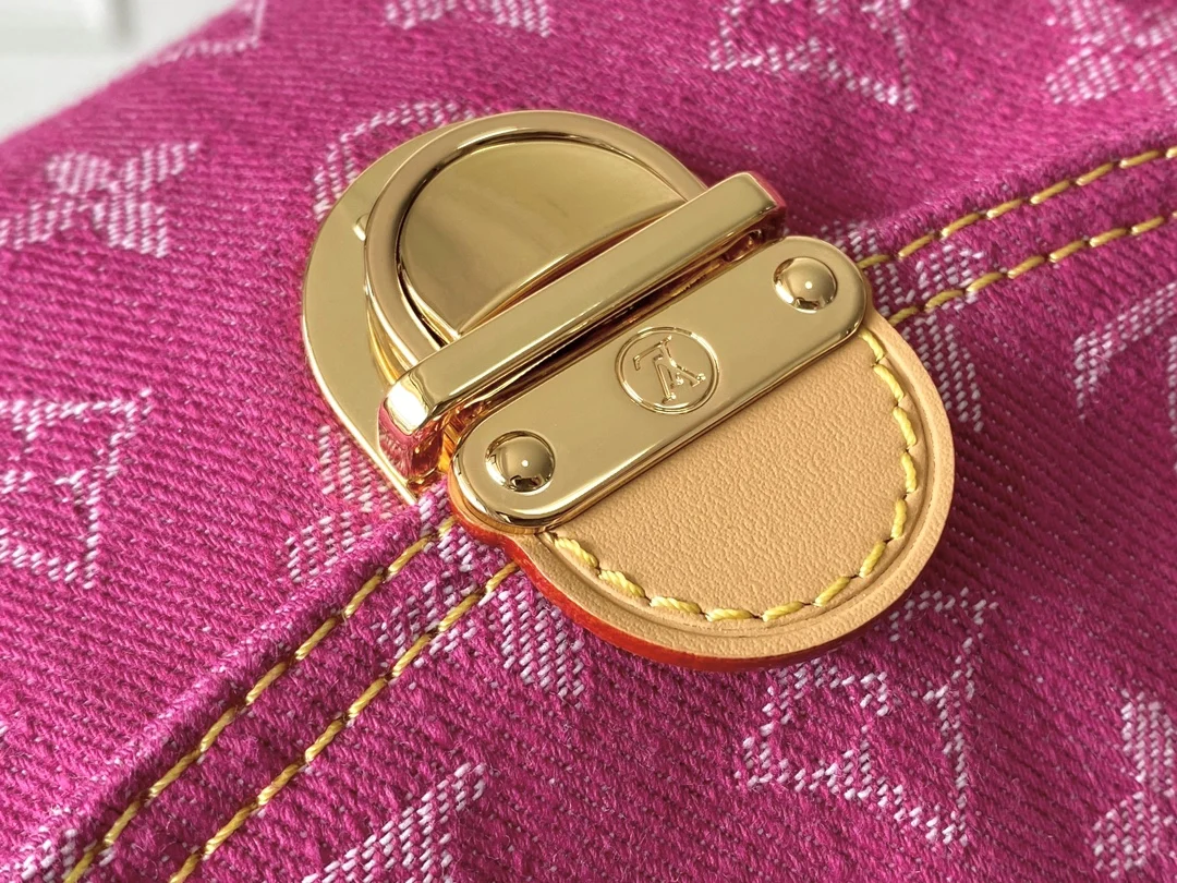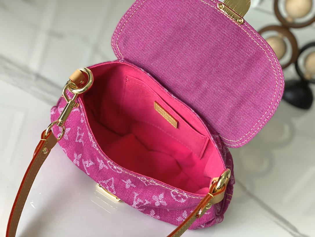 M95216 Purple Denim Small Crossbody Bag, Exclusive Real Shot, Vintage Discontinued Limited Edition with Code-Changing Chip. Crafted from denim canvas with soft suede lining, featuring a front press-lock flap closure with a small pocket, zipper closure, and adjustable shoulder strap. Dimensions: 26x15x9cm.