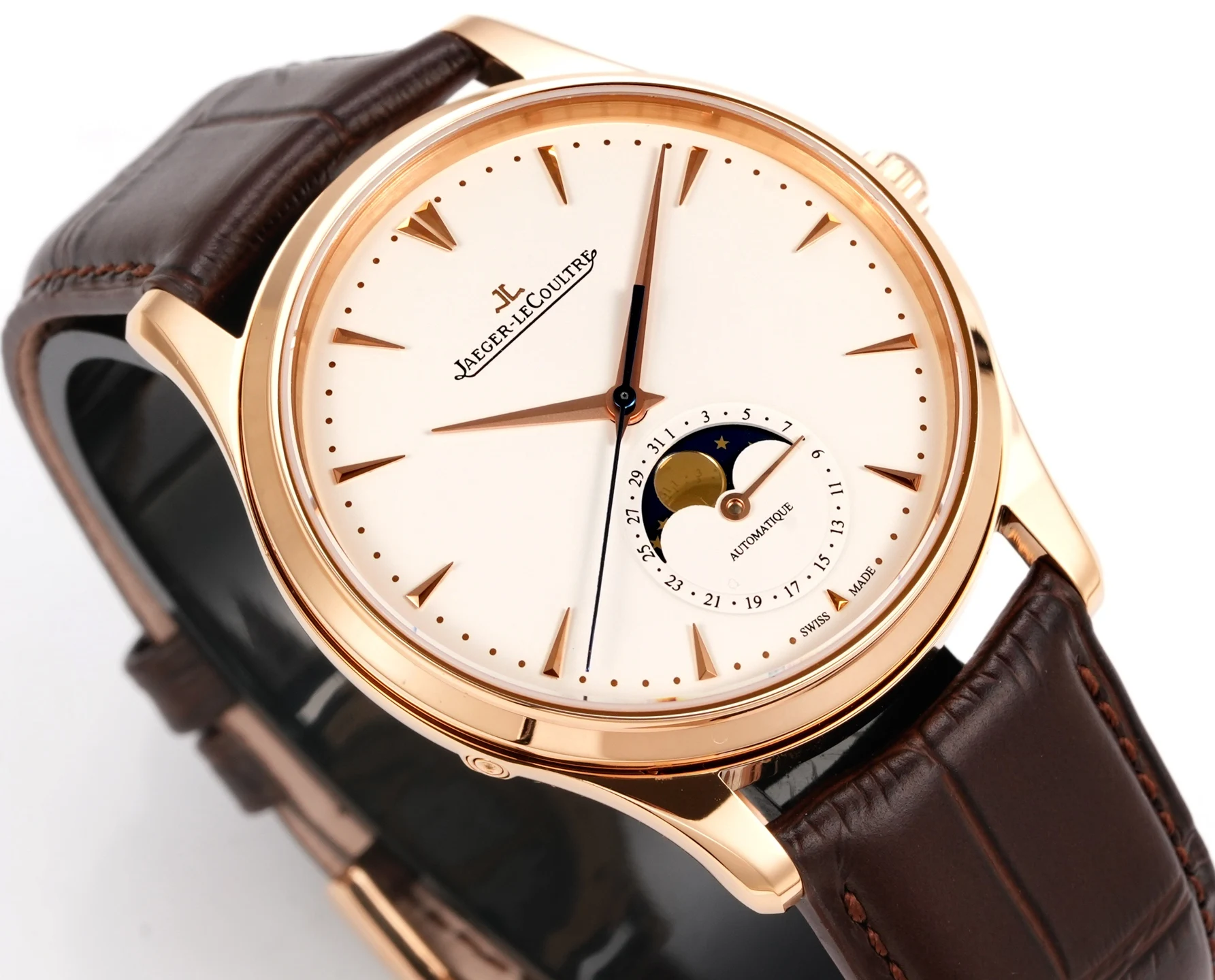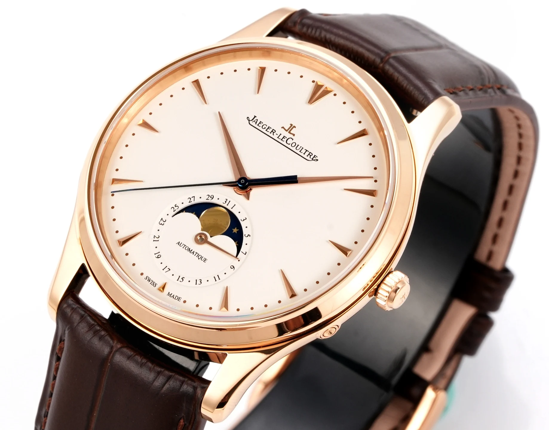 Jaeger-LeCoultre Master Ultra Thin Moon Men s Dress Watch (39mm diameter, 9.9mm thickness): [Moon Phase Disc] CNC precision-carved (non-adhesive), with a similarity of up to 98%! [Movement] Original mold-replicated Cal.925 one-piece movement. Staying true to our original aspiration, each movement undergoes a series of rigorous tests and screenings before leaving the factory!