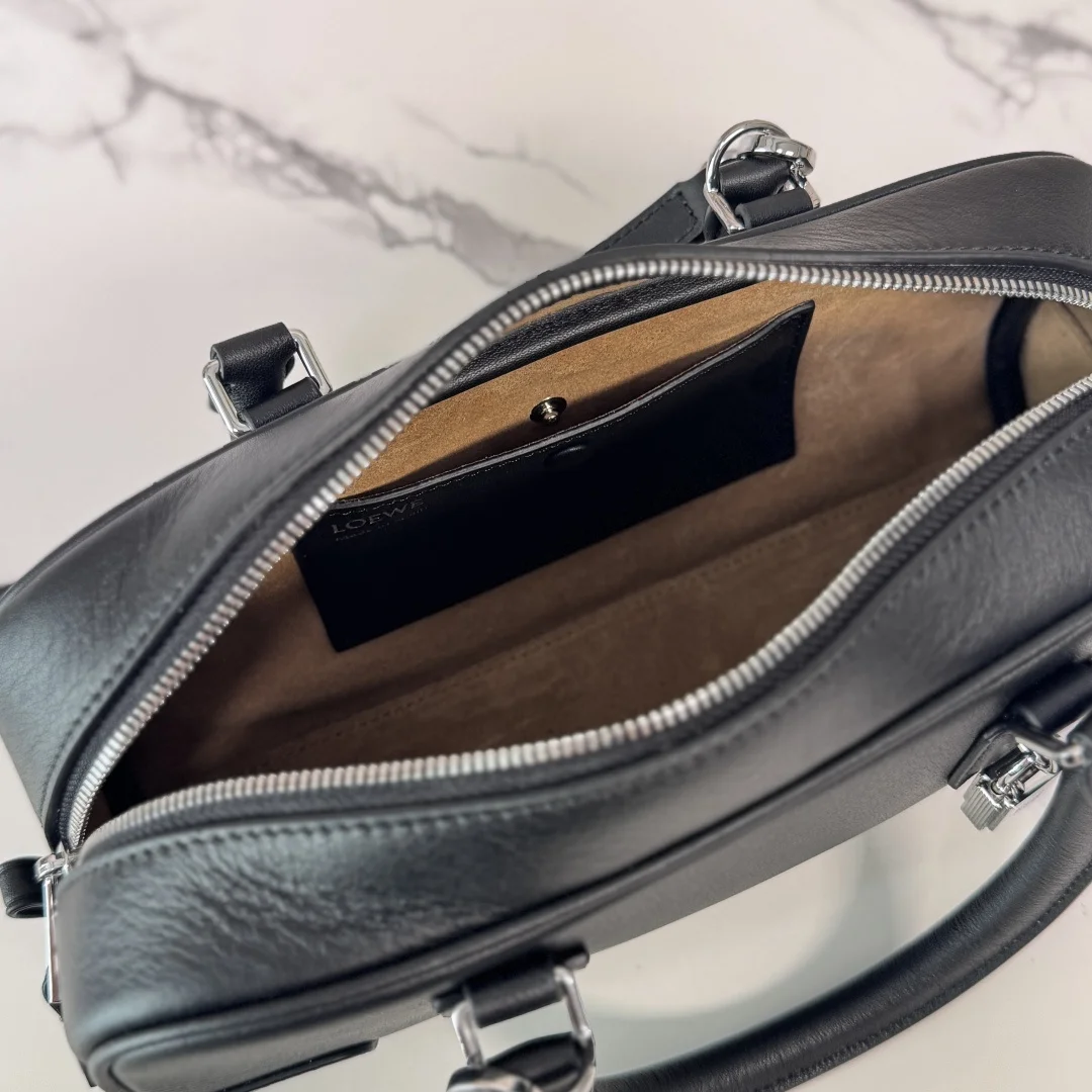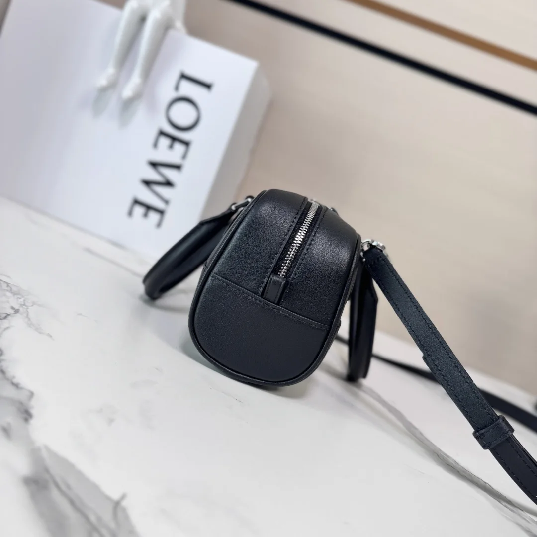 LOEWE s new Mini Amazona 23 Cropped Bag *The latest size of the bowling bag Born in the 1970s, the Amazona bag is reimagined with a slender baguette proportion, continuing the iconic Amazona logo. This version is crafted from nappa calfskin.* It features a small padlock as a new icon to accommodate the modern lifestyle where electronic devices are often stored in the bag.* The design is updated with a double zipper for easy opening and closing.* It has tubular leather handles and vintage bag corner details.* It can be worn crossbody, over the shoulder, or carried by hand.* The compact bag exudes a playful, collegiate style. Model: 062417 Size: 23*10*11CM