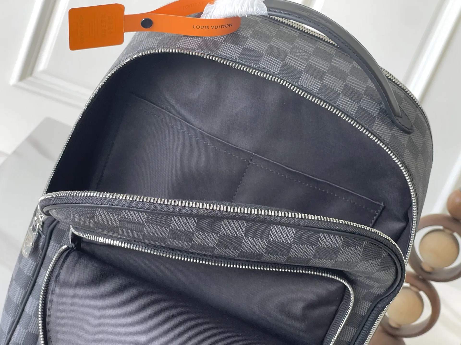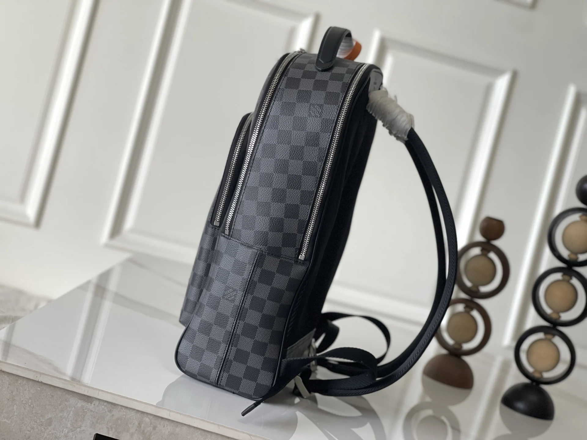 The N40499 Hacking and N40501 Embossing on the M30977 Taiga Leather Avenue Backpack in Damier Graphite coated canvas embodies refined elegance with its clean lines. A zipped front pocket facilitates access to essentials, while a padded compartment at the rear, a top handle, and adjustable shoulder straps ensure comfortable carry. 40.0 x 31.0 x 15.0 cm (Length x Height x Width) Damier Graphite coated canvas Cowhide-leather trim Textile lining Metallic hardware Zipper closure Adjustable shoulder straps Zipped front pocket Zipped padded compartment at the rear Inside flat pocket Handle: Single handle