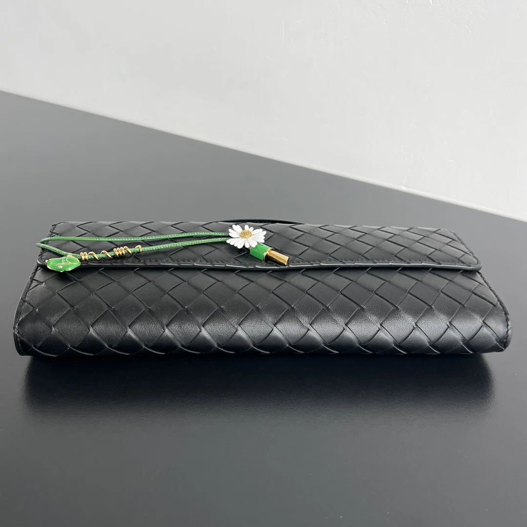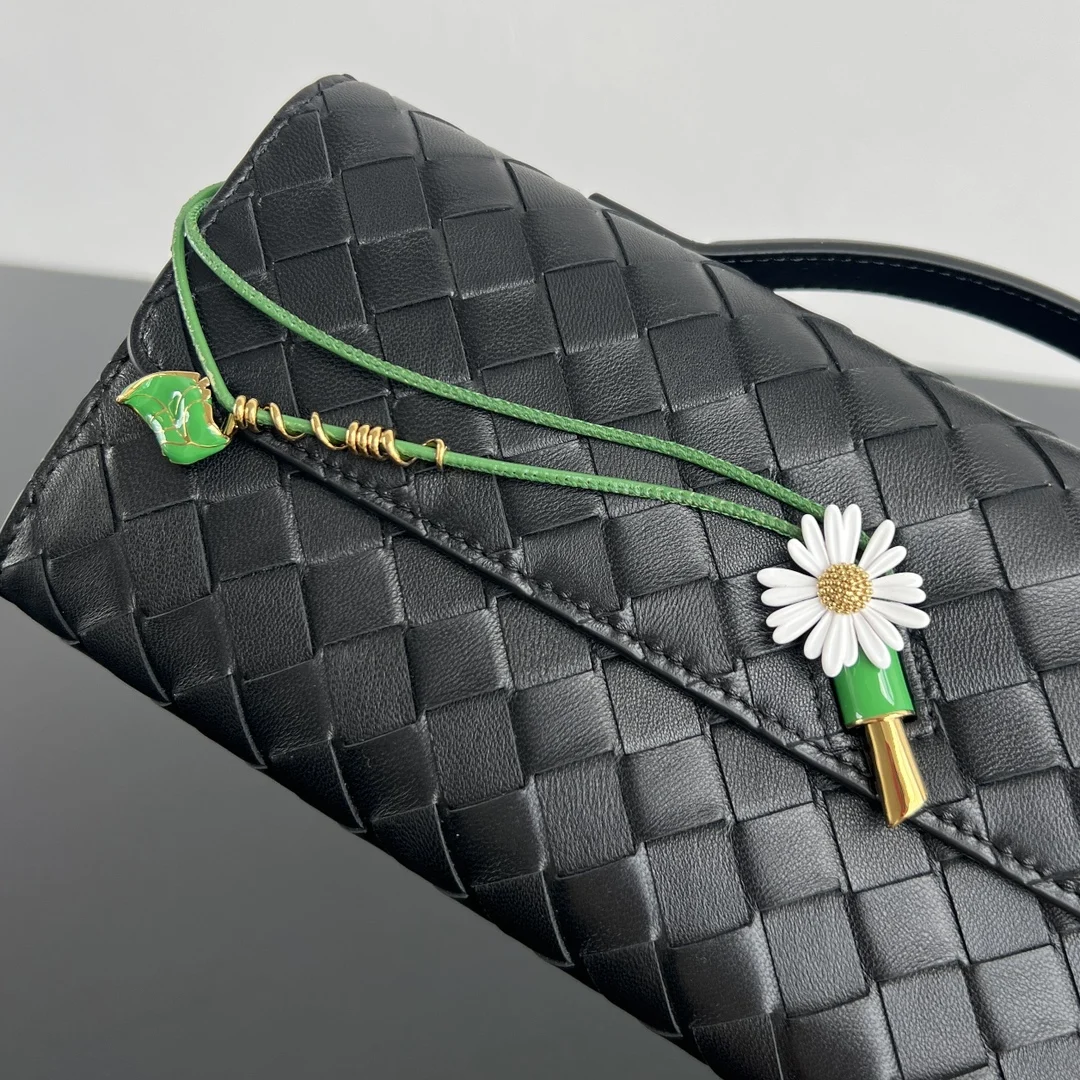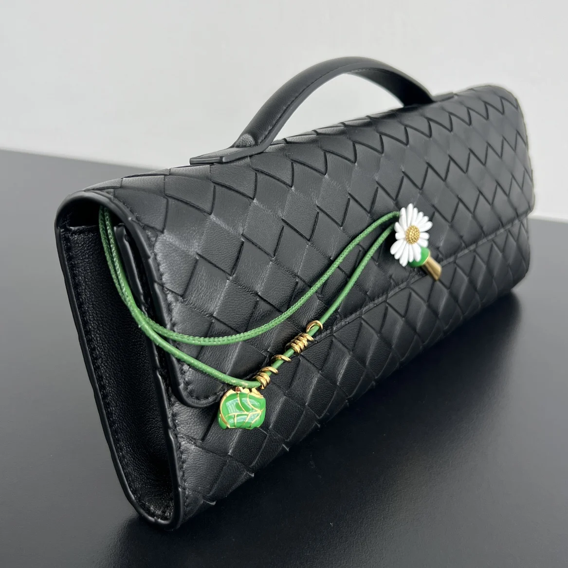 BV New Andiamo Clutch Daisy Handbag 836810. A special Andiamo clutch featuring three-dimensional, delicate daisy flowers, hand-painted with enamel. Each petal looks as fresh as a real flower , adding a jewelry-like embellishment to the handbag. Holding it in your hand, it brings its own ethereal filter. When the daisy meets the structured intrecciato nappa leather , it is full of natural charm and exquisite craftsmanship. It is not just a bag, but a work of art, and a reflection of one s own aesthetic taste . Size: 31x13x3.
