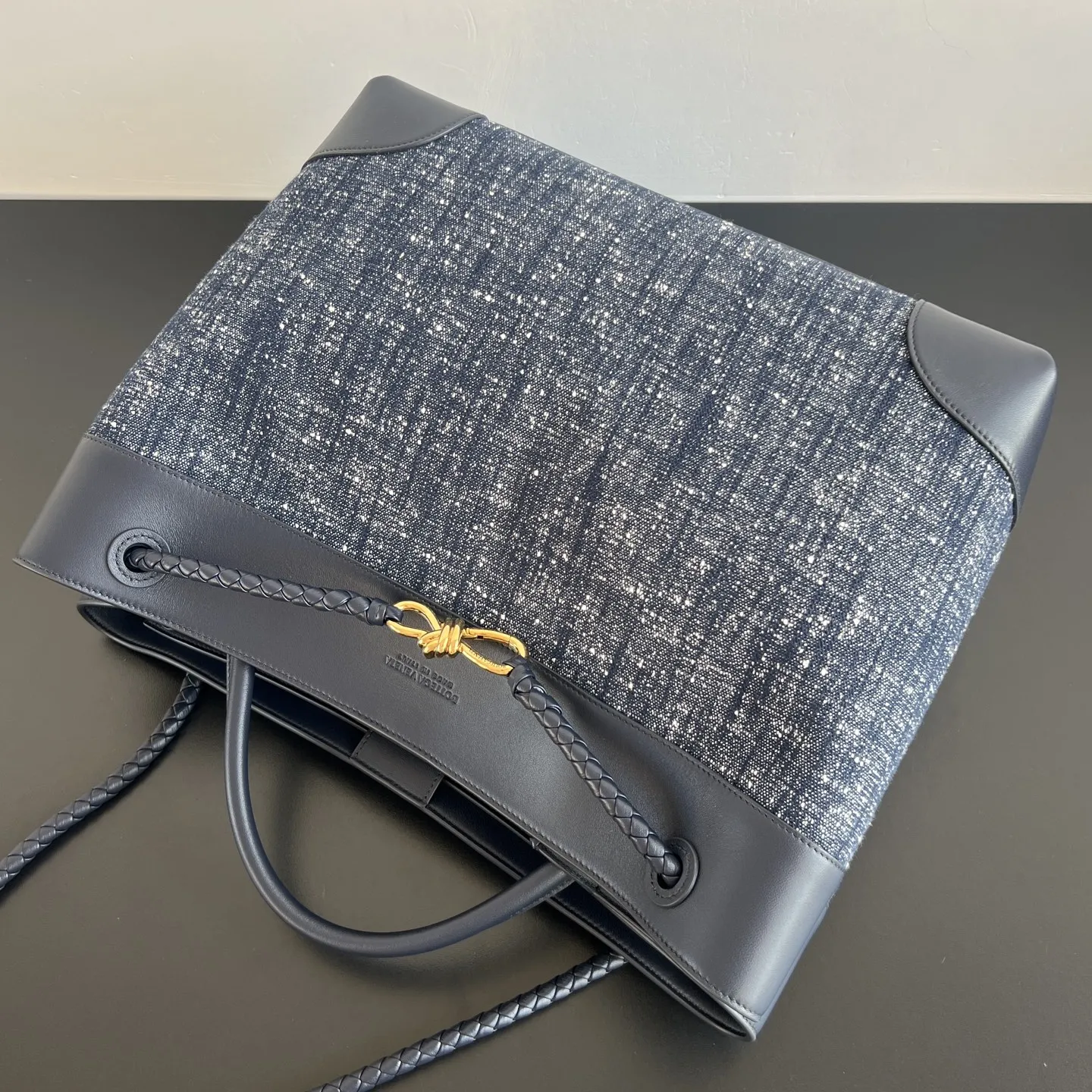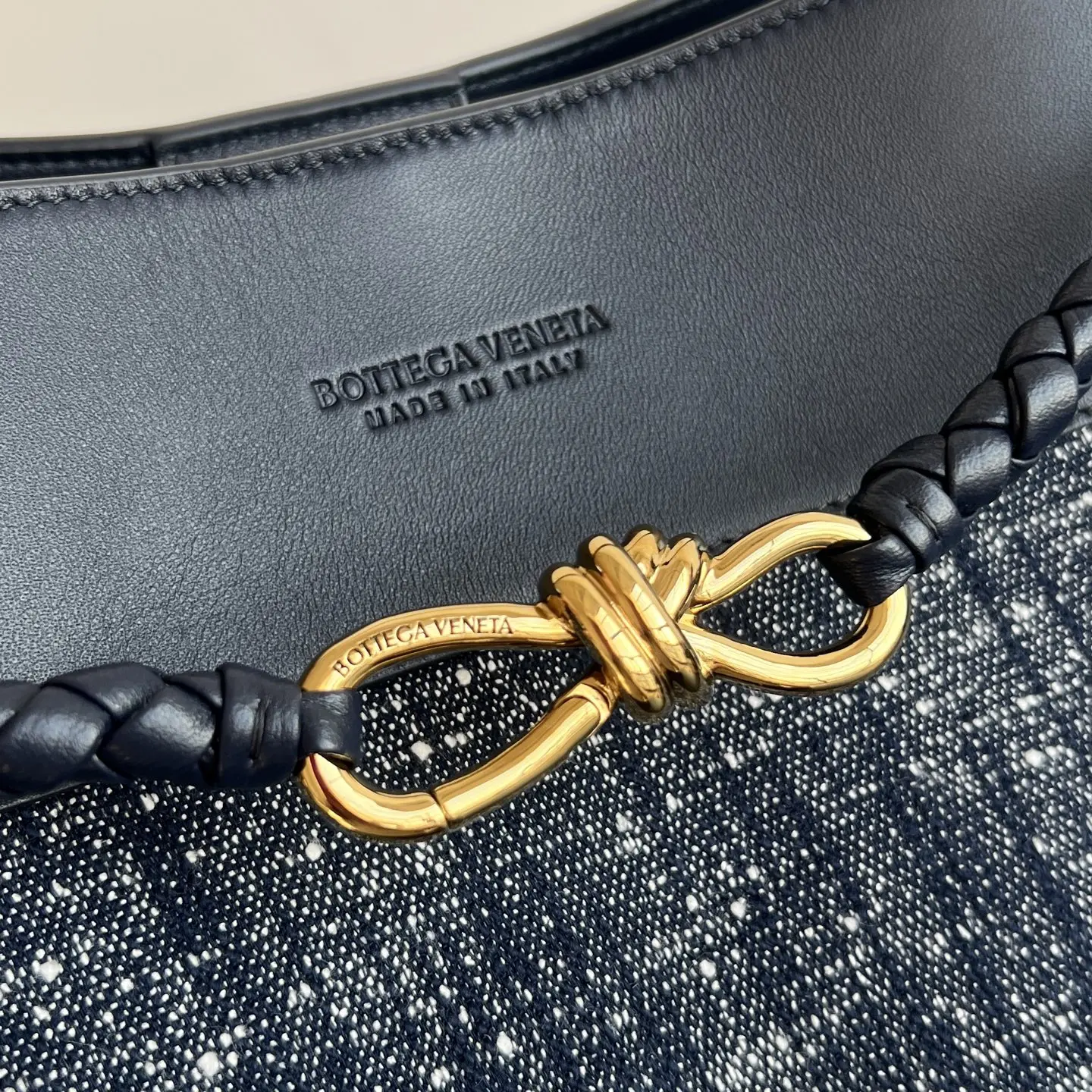 BV s new Andiamo in denim 786194. Terry denim patchwork, very sophisticated. You ll definitely stand out with this bag. Featuring a woven shoulder strap and the iconic knot gold buckle, it s effortlessly chic and luxurious. Super spacious, perfect for all your work essentials. The shoulder strap can be flexibly adjusted, versatile and ever-changing, effortlessly relaxed and stylish. A must-have for denim lovers Dimensions: 42x35x18