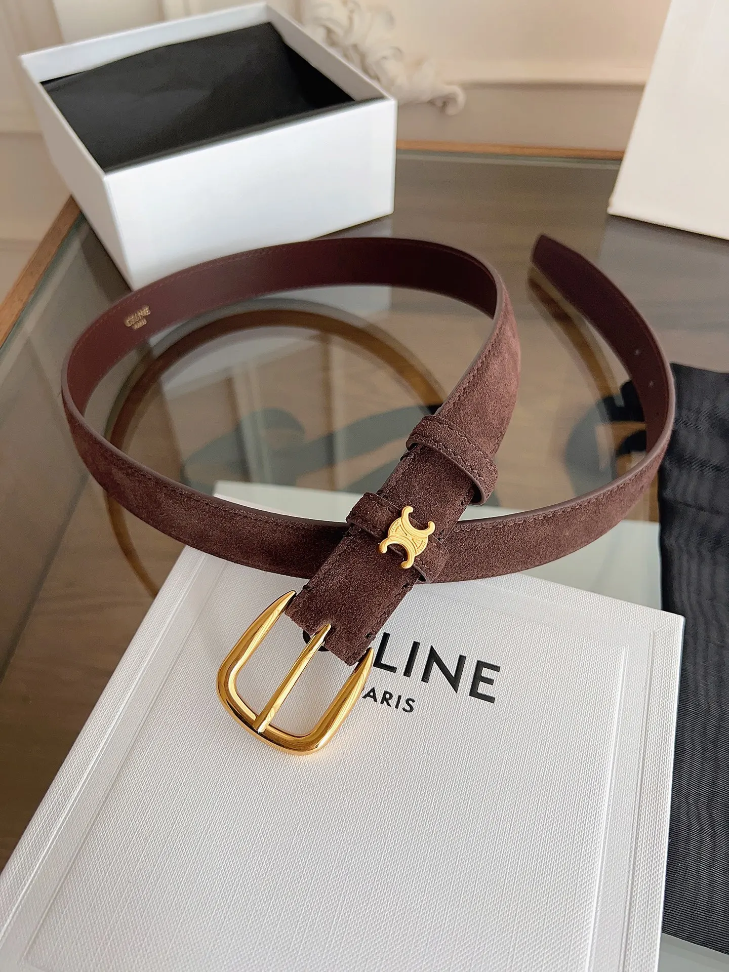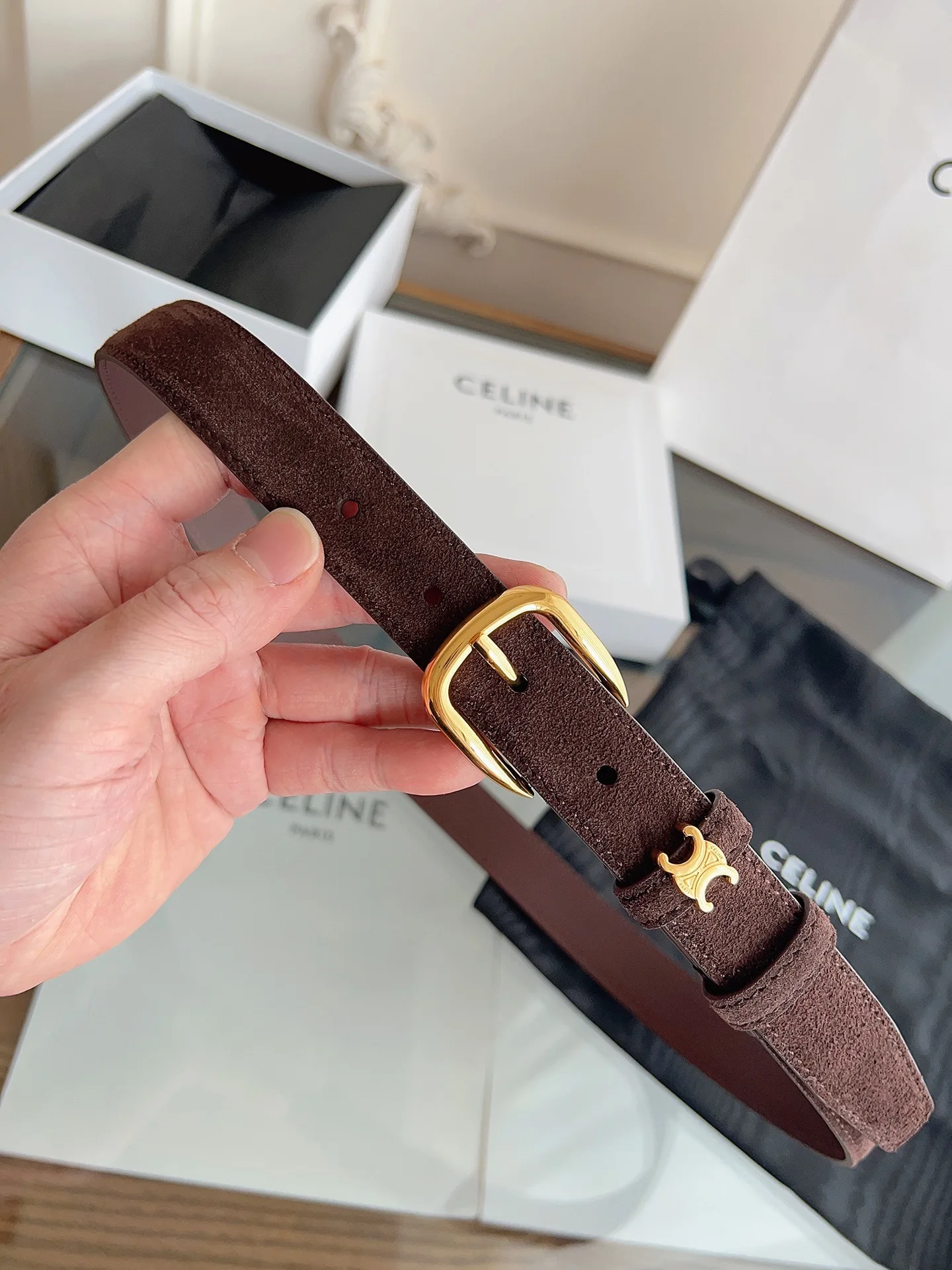Celine boutique new style women s belt made of top layer suede leather, a must-have for winter outfits, width 2.5cm, round buckle, the first ring surrounds the TRIOMPHE metal ring, brand new design.