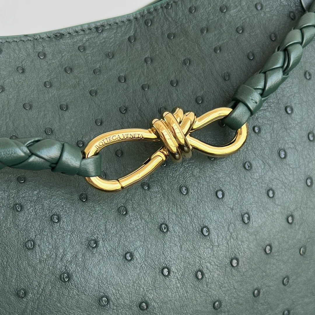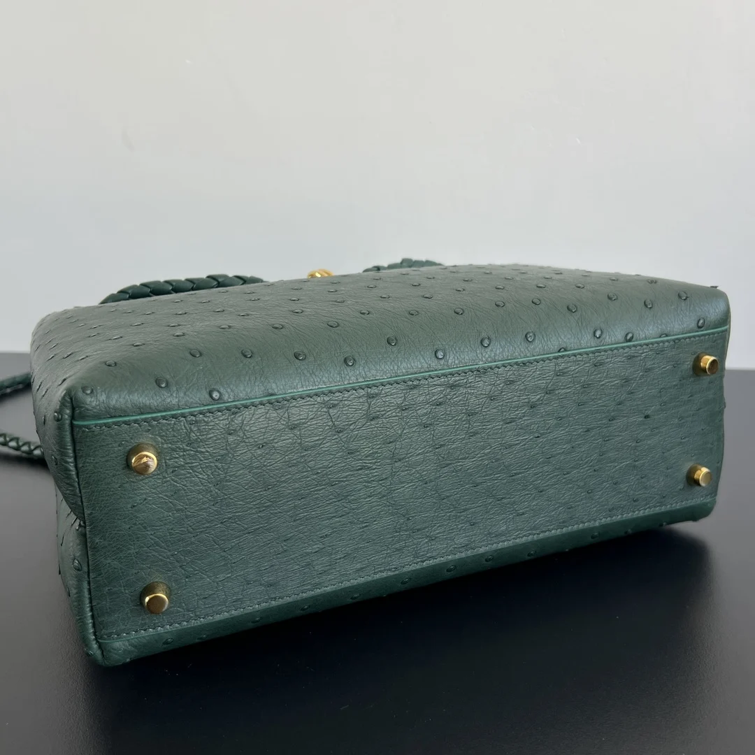 BV New Arrival: Ostrich Leather Andiamo 817805. A must-have for texture enthusiasts! The allure of ostrich leather Crafted from precious ostrich leather! The leather features unique pearl follicles, each natural pore offering a one-of-a-kind texture. It feels delicate yet subtly granular to the touch, with a soft, cloud-like shape . However, the resilience of ostrich leather allows it to maintain a luxurious structure . The metal knot closure complements the matte finish of the ostrich leather perfectly, exuding effortless sophistication in its understated elegance . This bag understands the female aesthetic, gentle yet powerful, ideal for those seeking understated luxury . Dimensions: 32x24x12